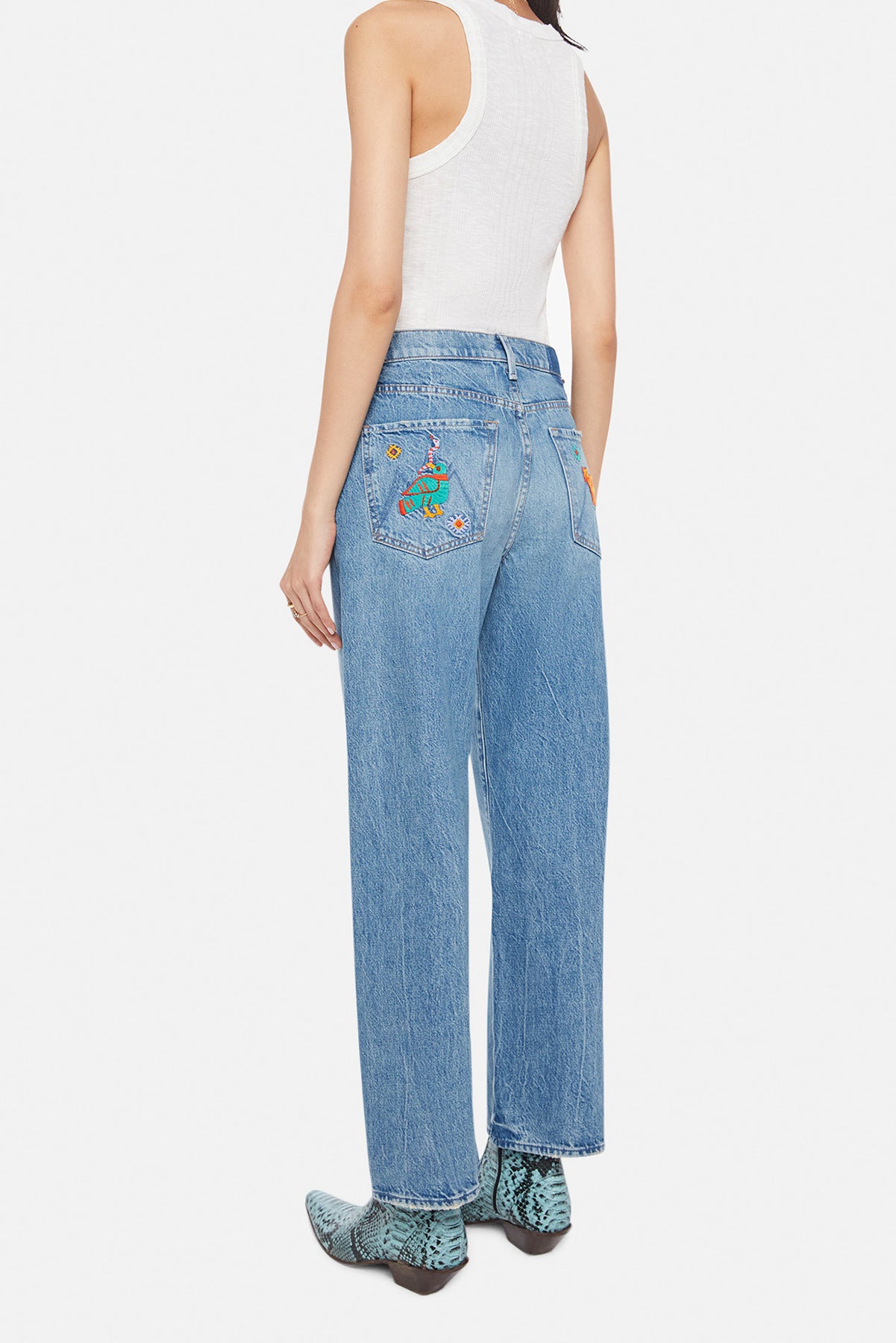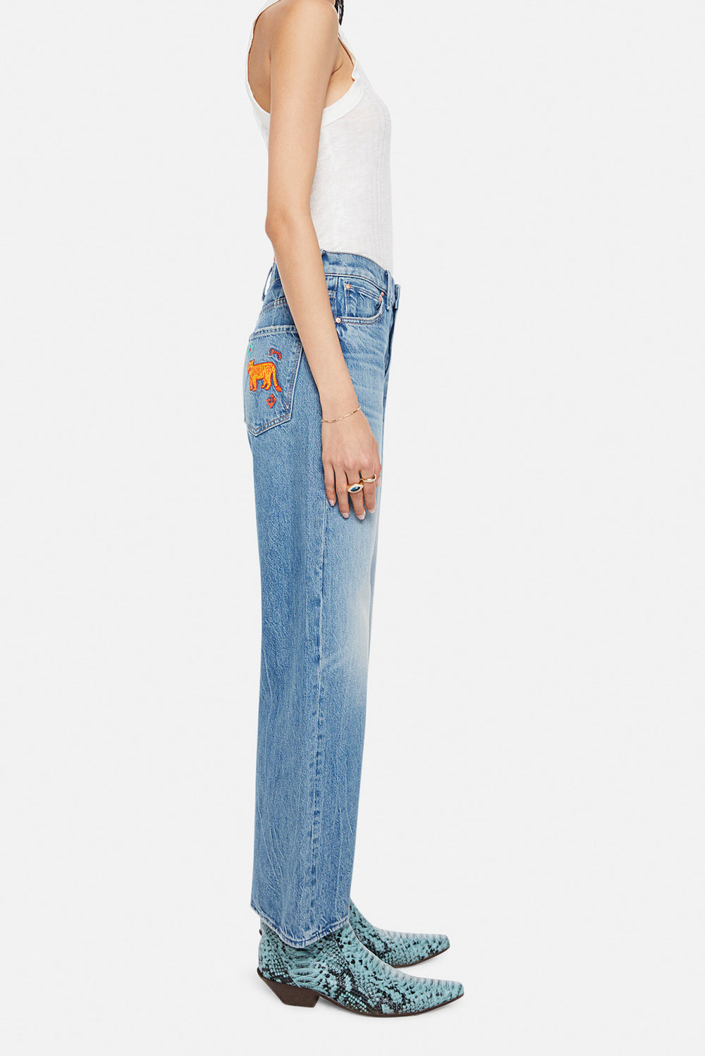 Show's over. Jeans designed to sit on the hips with a slouchy fit, a loose straight leg, zip fly and a 28.25-inch inseam with a clean hem. Cut from rigid SUPERIOR denim, That's All Folks is a mid-blue with whiskering, fading at the knees and embroidery on the back pockets.