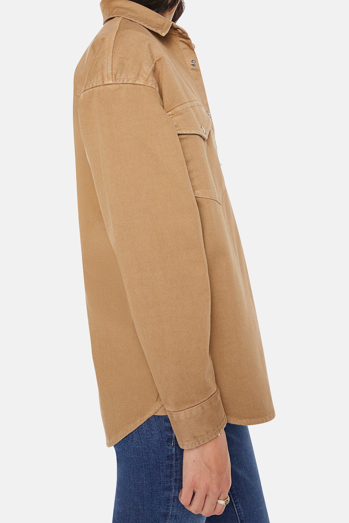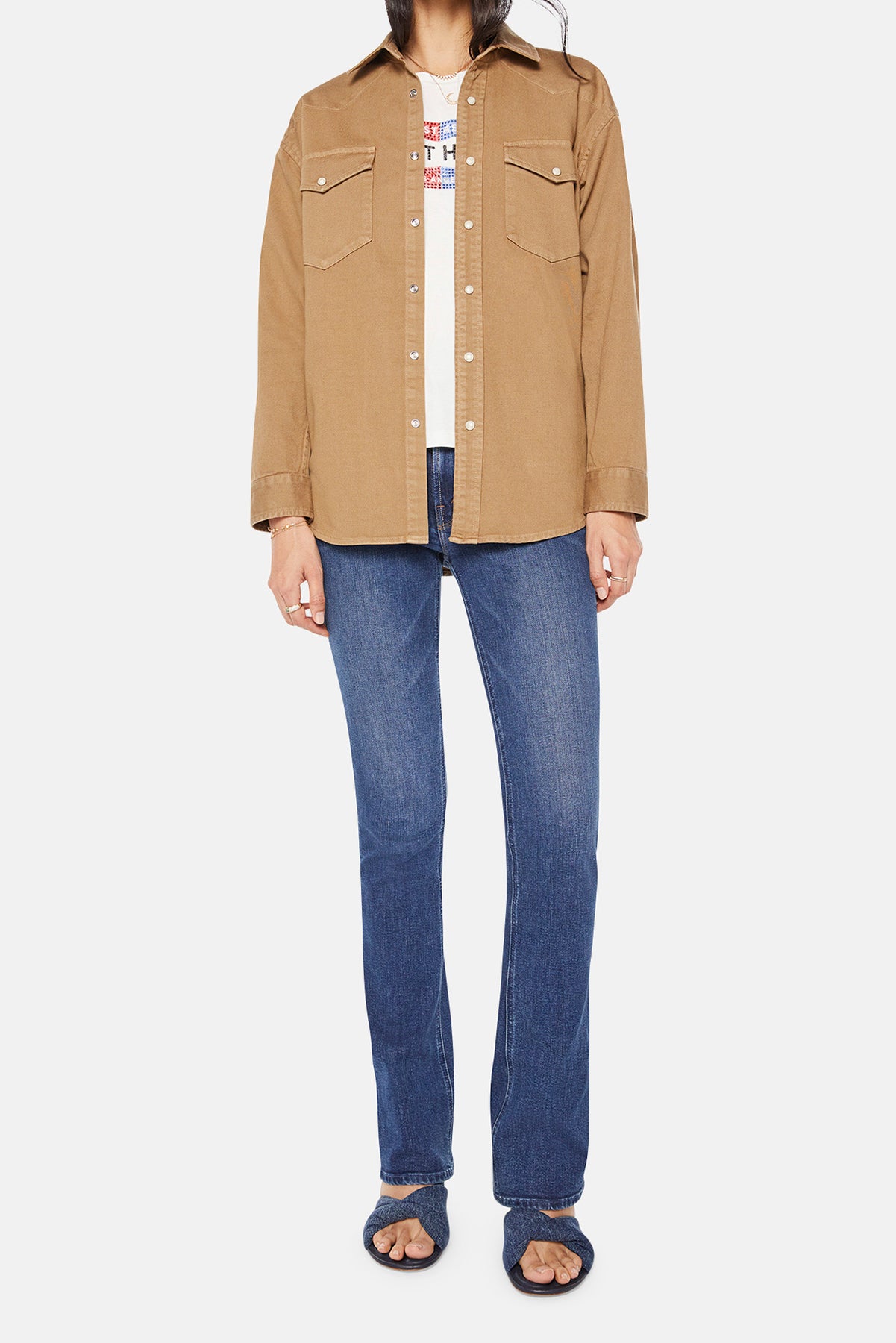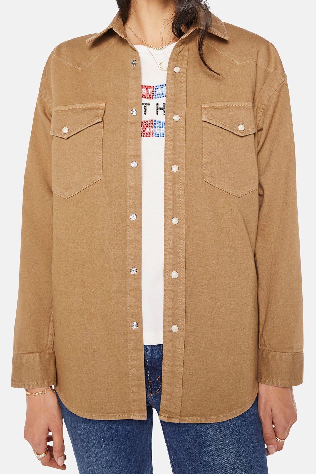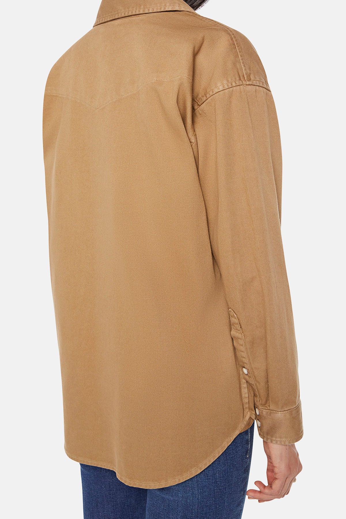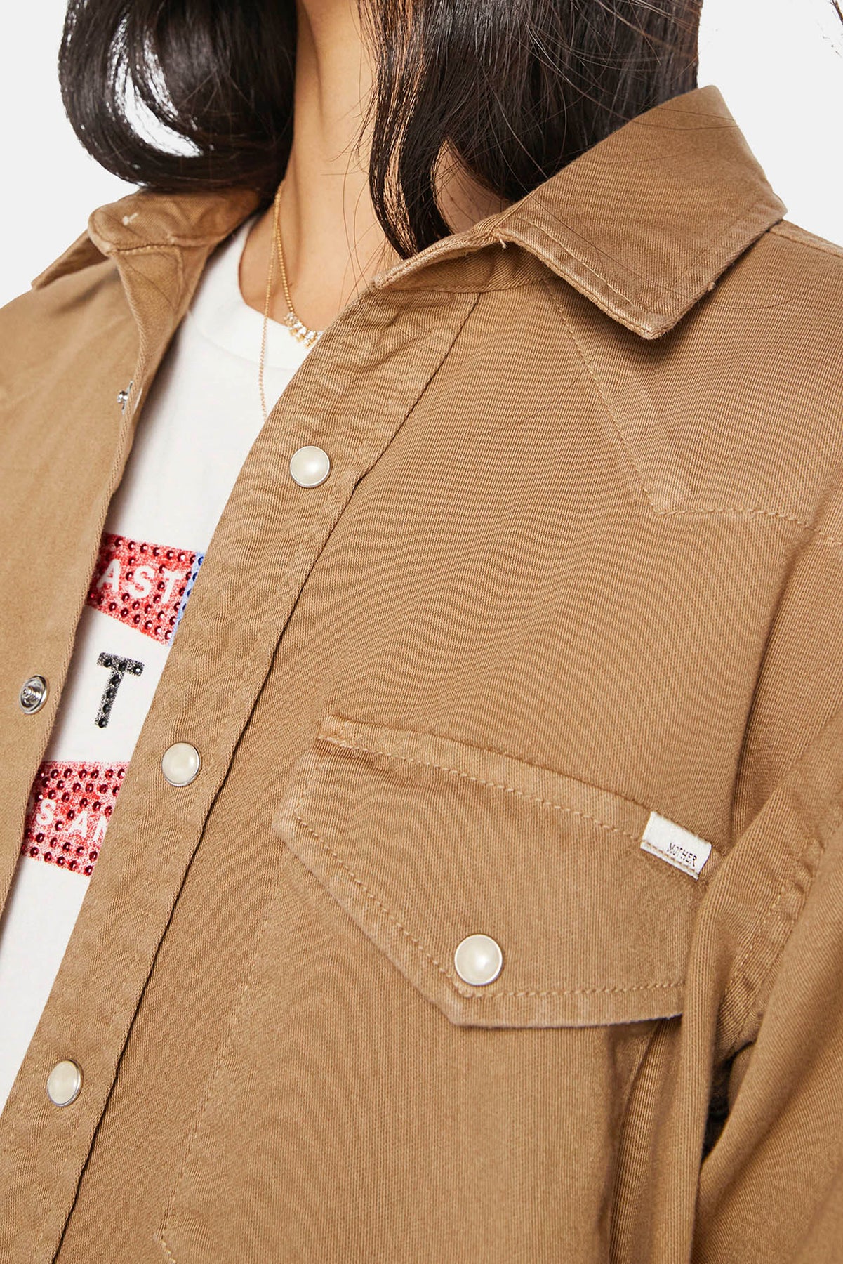 An oversized denim button-up with drop shoulders, front patch pockets, a Western-inspired yoke and a curved hem. Made from 100% cotton, Sir Yes Sir is a faded khaki with faux pearl snaps down the front.