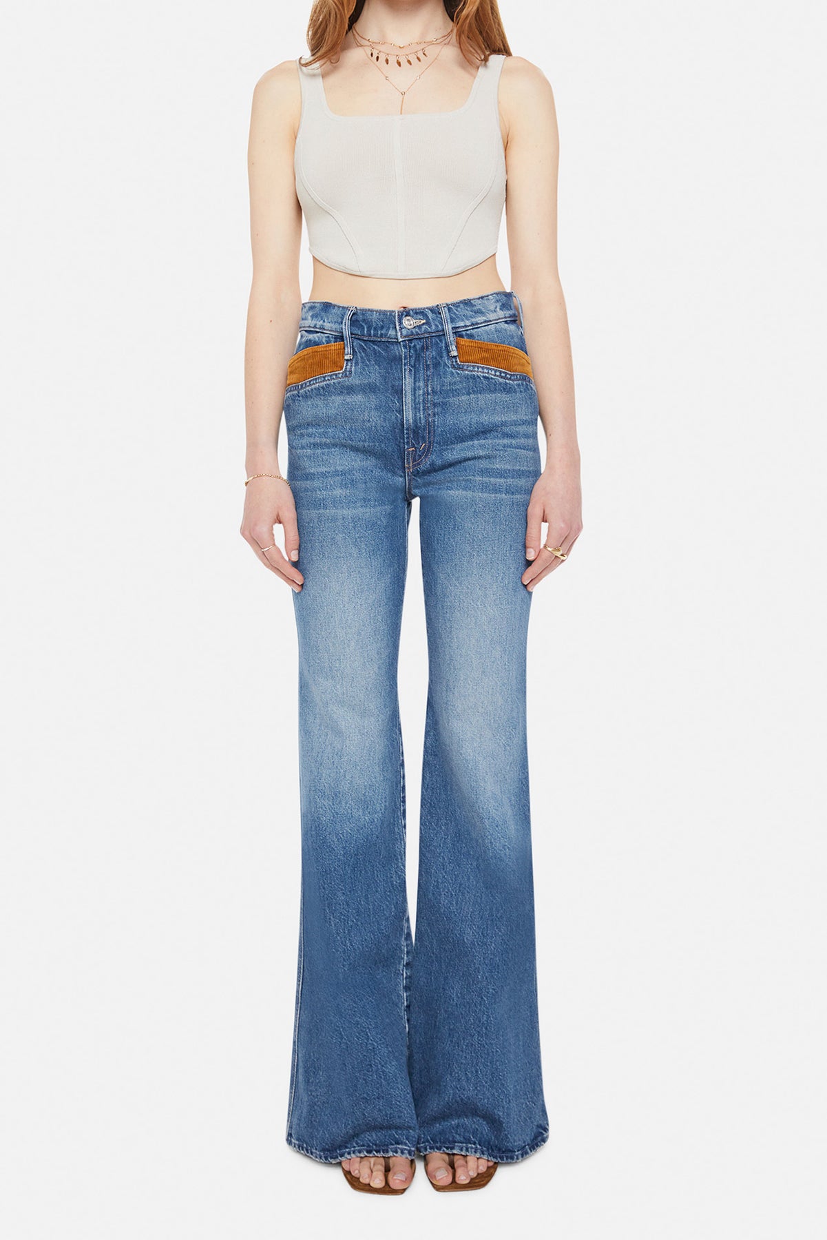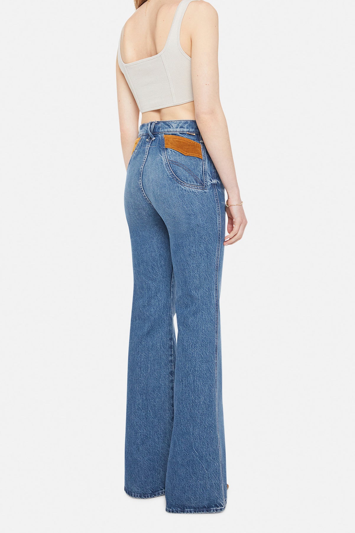 A blast from the past. A high-rise flare with a zip fly, off-center back pockets, a long 34-inch inseam and a clean hem. Made from rigid SUPERIOR denim, Remember When is a mid-blue with whiskering and fading at the knees and corduroy trim on the pockets.
