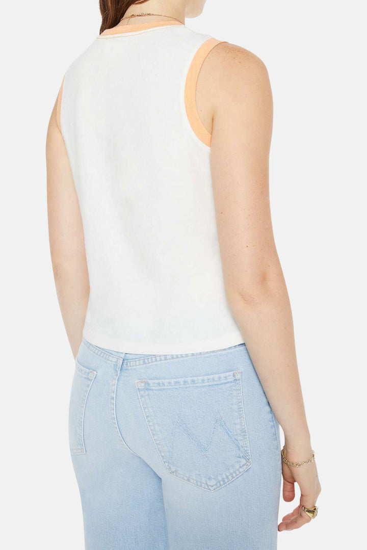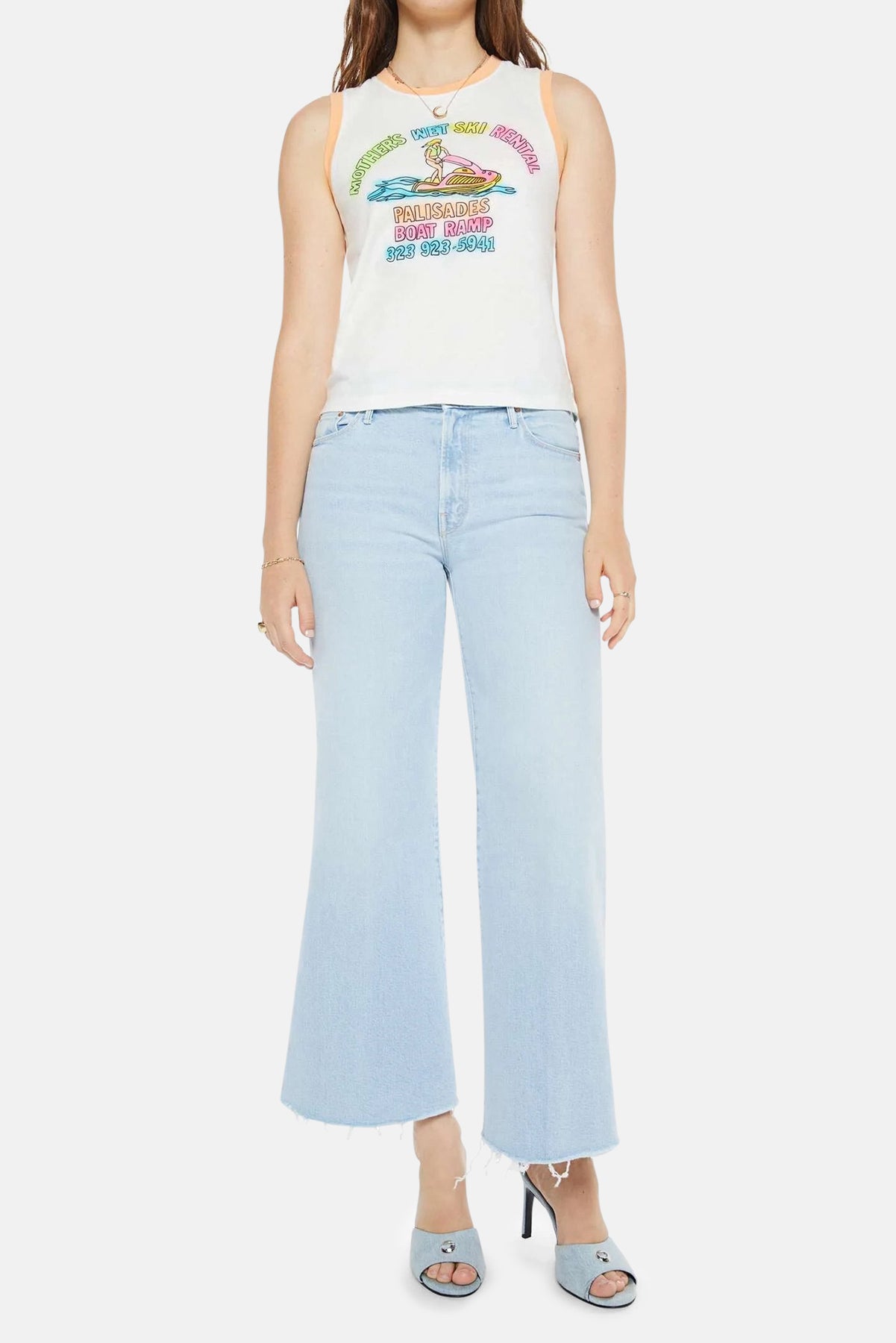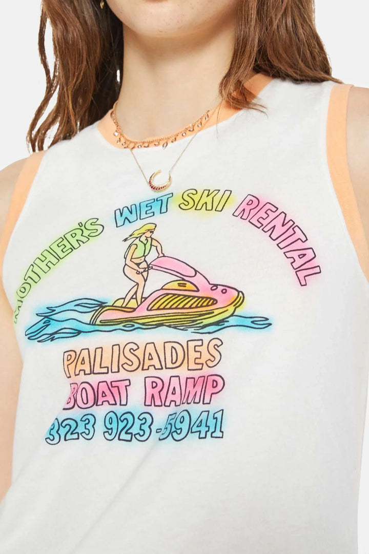 Making waves. A cropped muscle tee with a crewneck and boxy fit. Cut from a recycled-cotton blend, the off-white tank features a colorful jet ski graphic inspired by a retro boat rental service on the front.