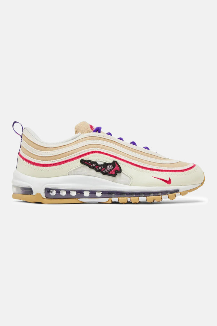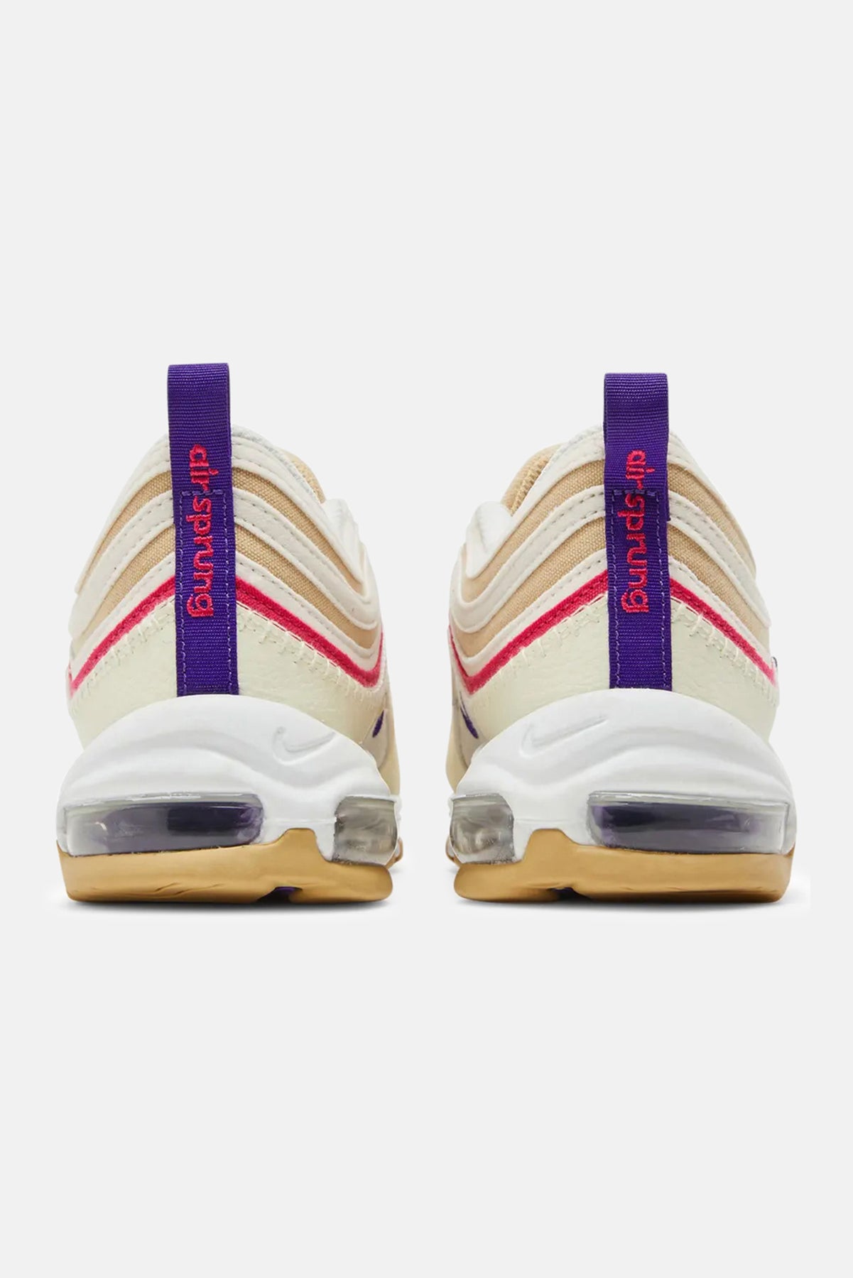 Launching as part of Nike’s ‘Air Sprung’ collection, the Air Max 97 ‘Cream’ delivers a playful take on the retro running shoe. Purple rope laces secure the tan textile upper, accented with a series of wavy synthetic suede overlays in a subtle cream hue (and a lone textile overlay in fuchsia). ‘Air Sprung’ is inscribed on each webbing heel tab and tongue, the latter featuring a butterfly graphic on the left shoe and a caterpillar graphic on the right. The caterpillar motif is repeated on the embroidered Swoosh that decorates the lateral quarter panel. Lightweight cushioning arrives via a purple-tinged full-length Max Air unit.