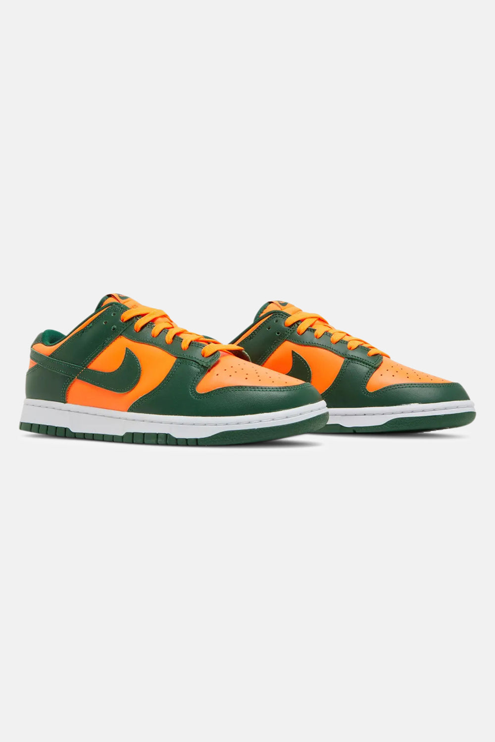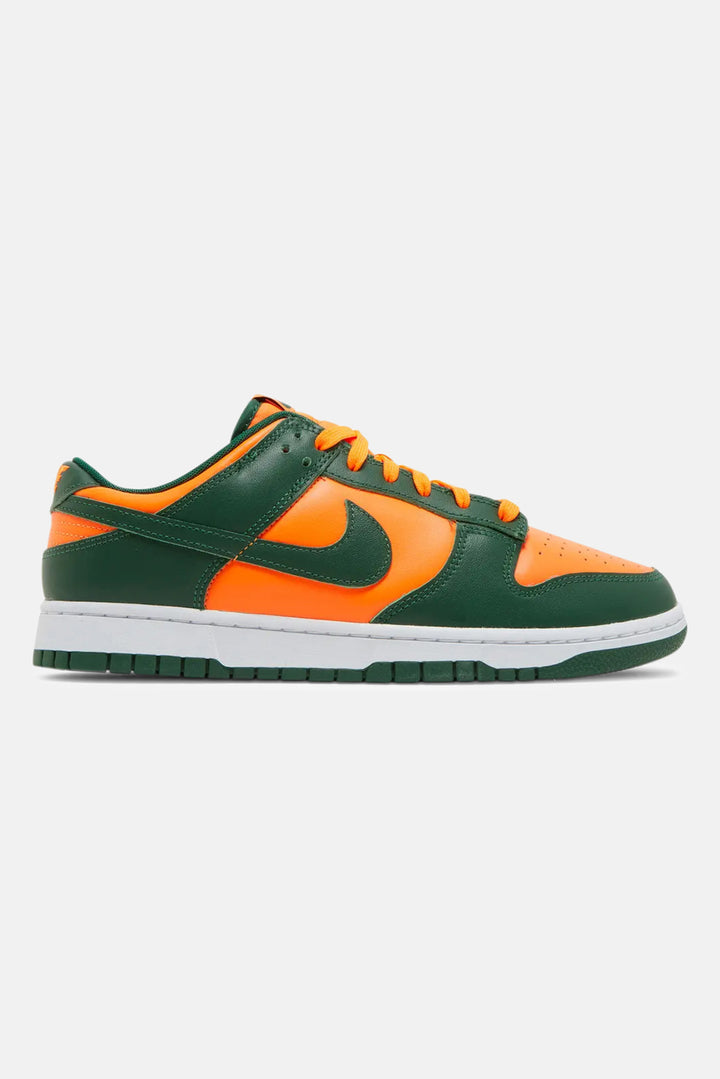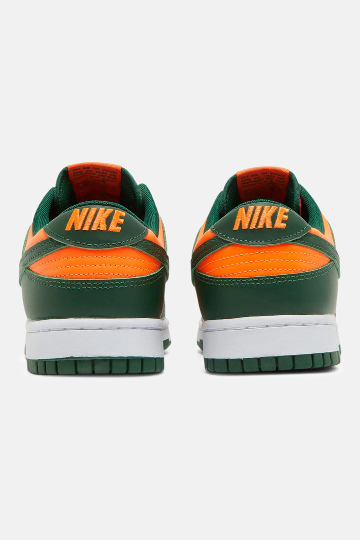 This Nike Dunk Low is draped in a two-tone palette that reflects the signature colors of the Miami Hurricanes. Equipped with a padded, low-cut collar, the leather upper features a Total Orange base with contrasting overlays in Gorge Green. The latter hue is repeated on the signature Swoosh, collar lining, and heel tab, marked with Nike branding in embroidered orange lettering. The low-top rests on a traditional cupsole, highlighted by white sidewalls, a cushioned foam wedge and a green rubber outsole.