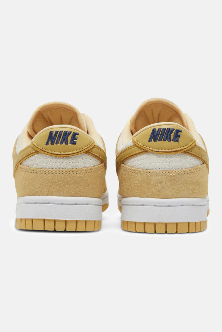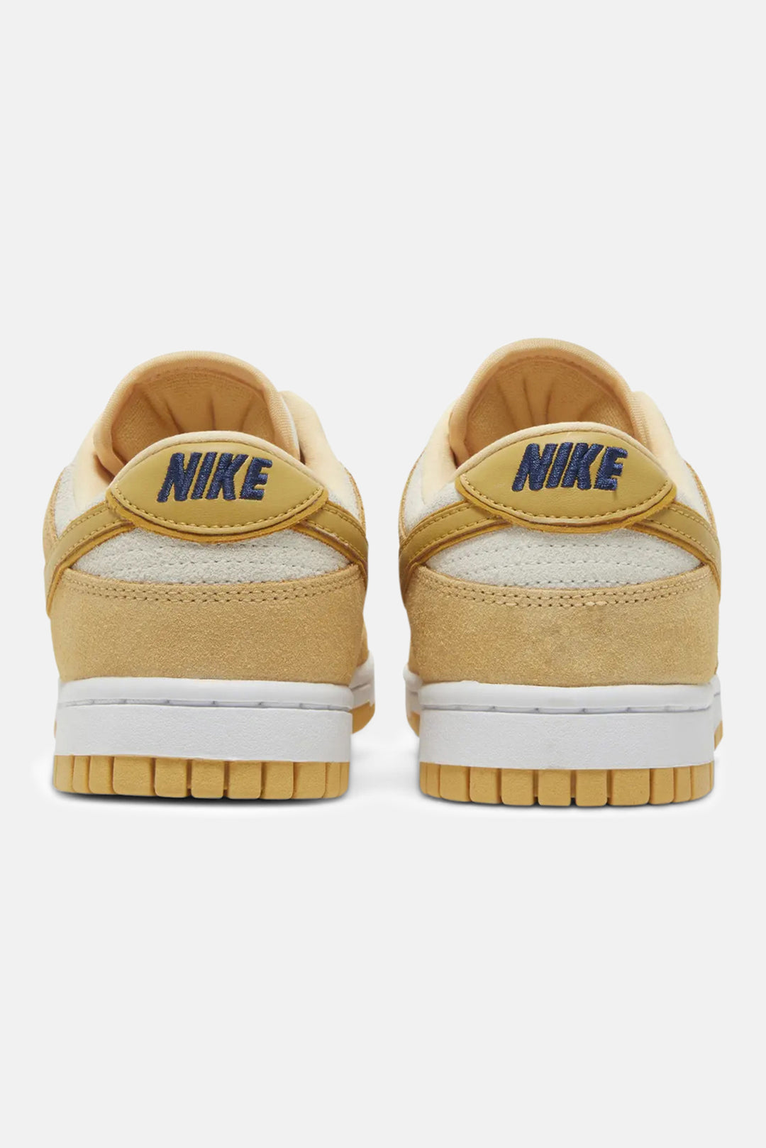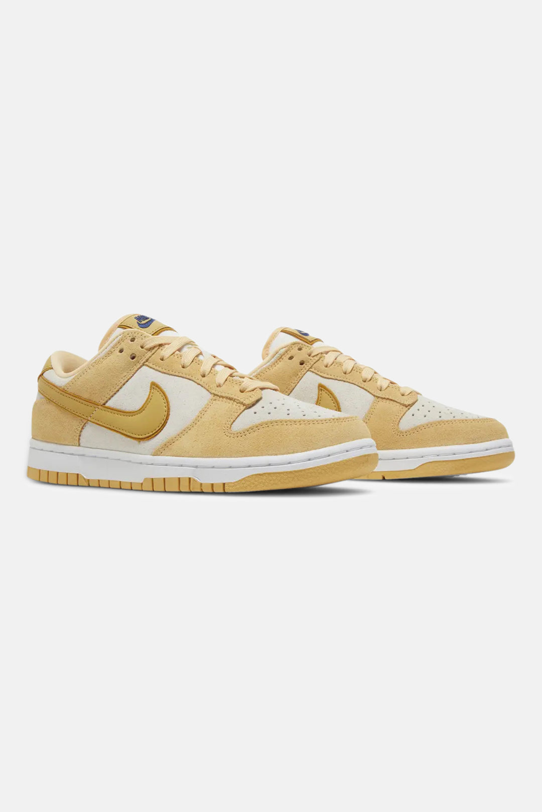 The Nike Women’s Dunk Low LX ‘Gold Suede’ pairs elevated materials with a refined, subtle palette. The low-top carries a textured suede upper, featuring an off-white foundation with sand-colored overlays at the forefoot and heel. Leather detailing in a dull gold finish appears on the signature Swoosh and Nike-branded heel tab. Additional Nike branding decorates the sockliner and leather tongue tag. The sneaker rides on a rubber cupsole, highlighted by stitched sidewall construction and an interior foam wedge.