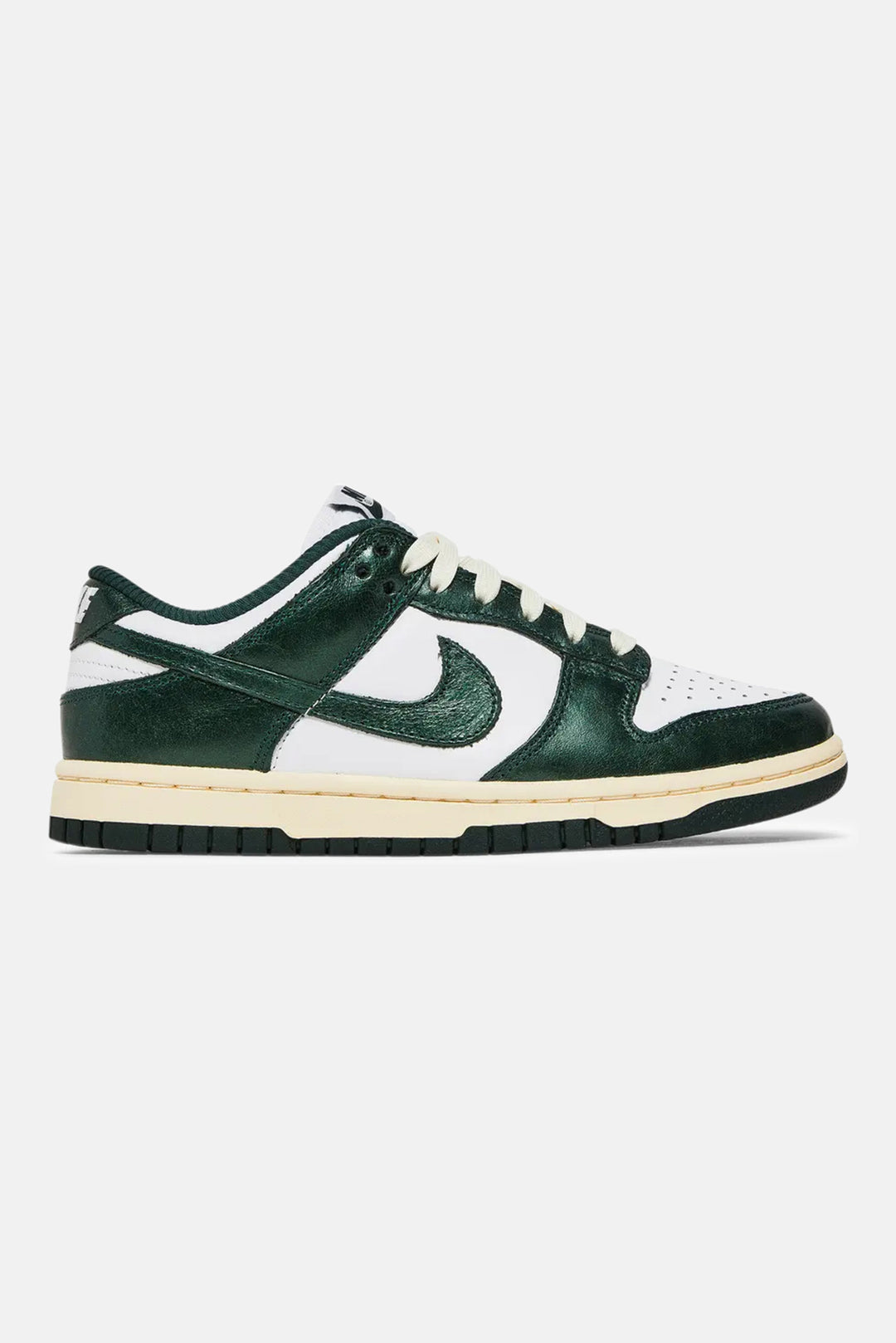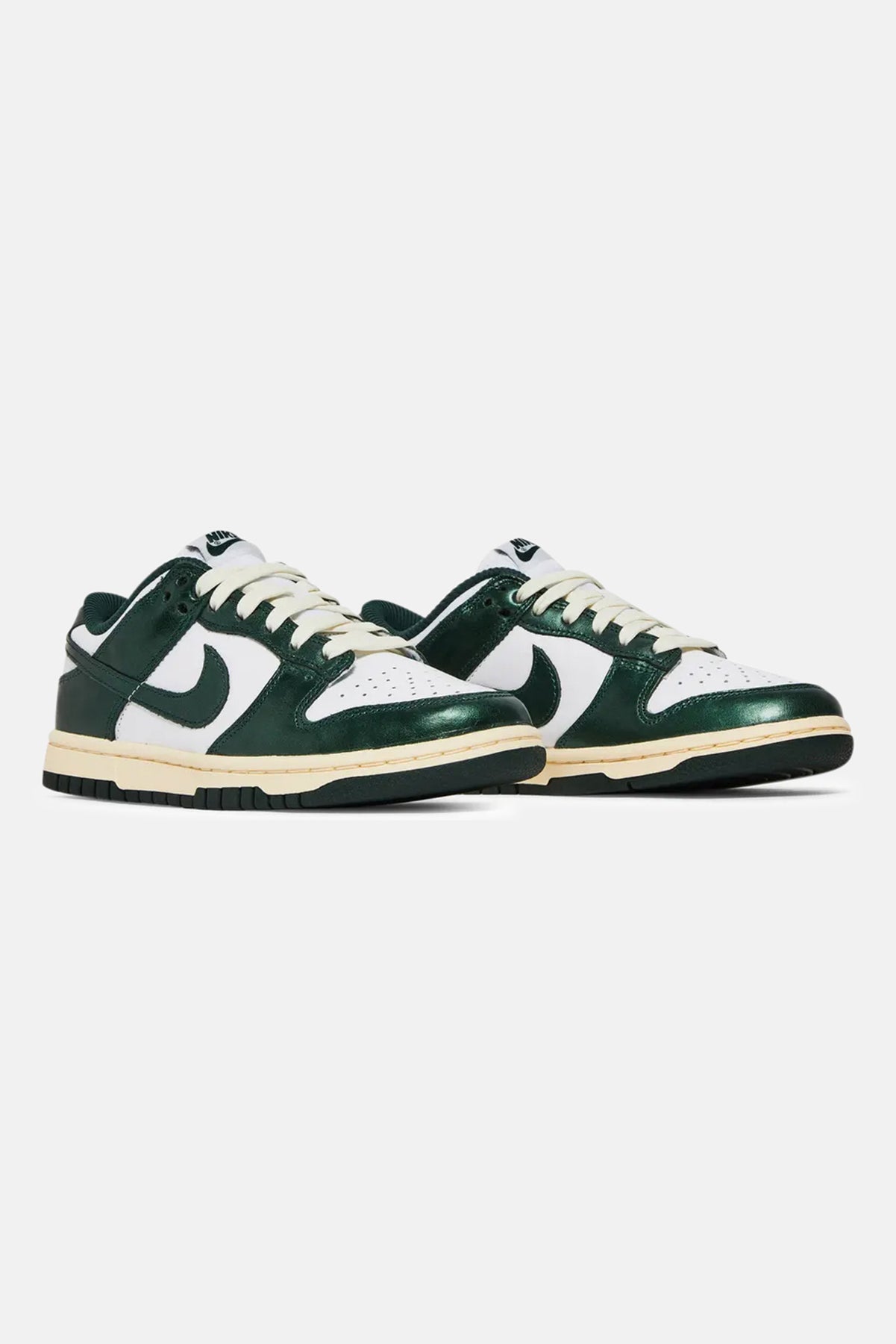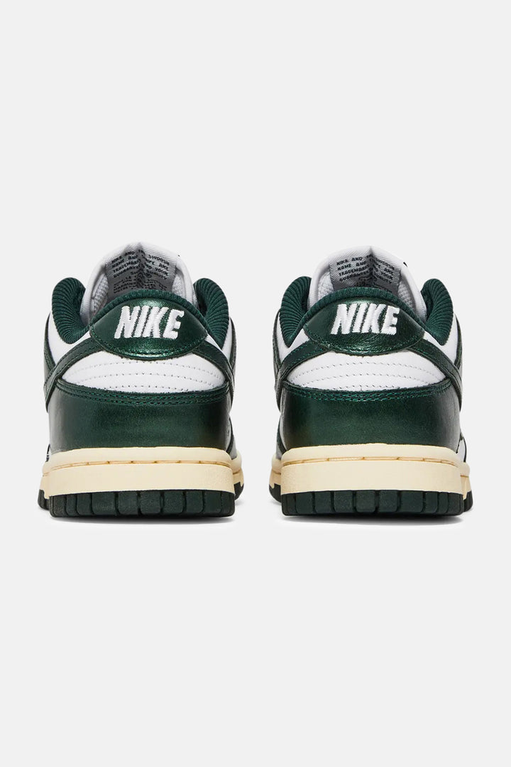 The Nike women’s Dunk Low ‘Vintage Green’ brings an aged aesthetic to the retro ‘80s hoops shoe, highlighted by a pre-yellowed rubber midsole. Cream-colored laces secure the upper, composed of smooth white leather on the quarter panel and perforated toe box. Contrasting hits of green settle on the Swoosh, eyestay, and forefoot and heel overlay, all featuring a subtle sheen and a lightly textured finish. Atop the breathable nylon tongue, a woven tag displays classic Nike branding.