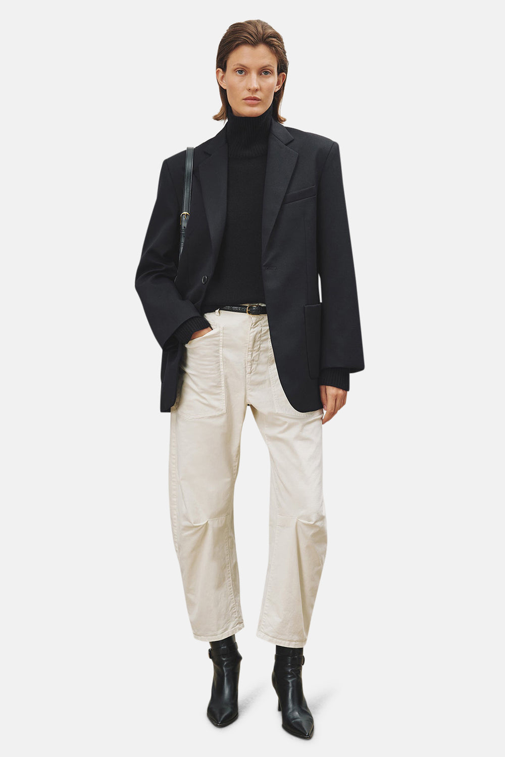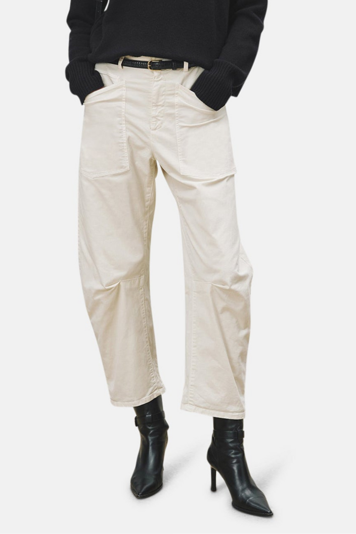 Mid-rise, relaxed fit pant in brushed stretch twill cotton. Uniquely curved silhouette. Seam detail at knees. Gusset at inseam. Zip fly. Hidden hook-and-bar closure. Hidden stay button closure. Top-stitched front and back patch pockets. Belt loops.