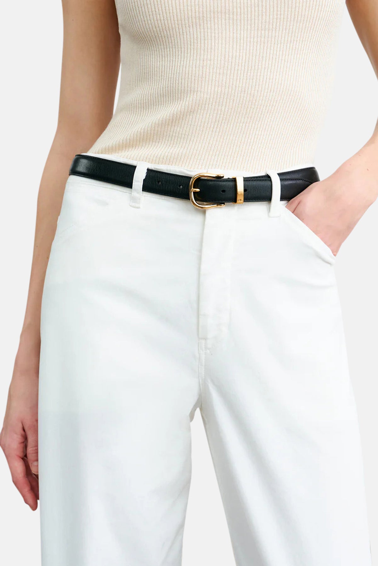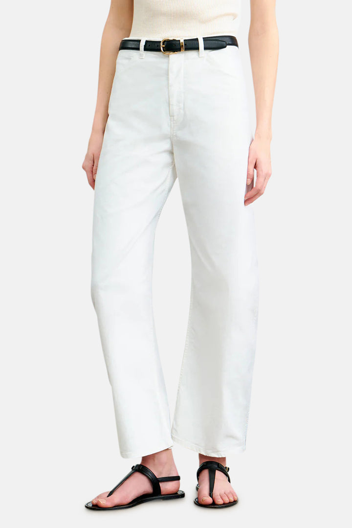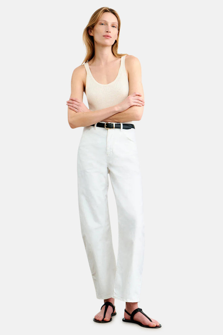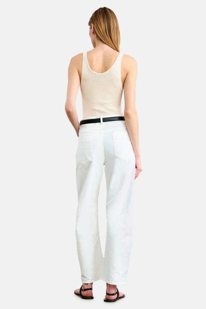 Mid-rise relaxed barrel leg pant in Italian brushed stretch twill cotton. Slant pockets. Back patch pockets. Coin pocket. Hidden hook-and-bar closure. Zip fly. Belt loops.
