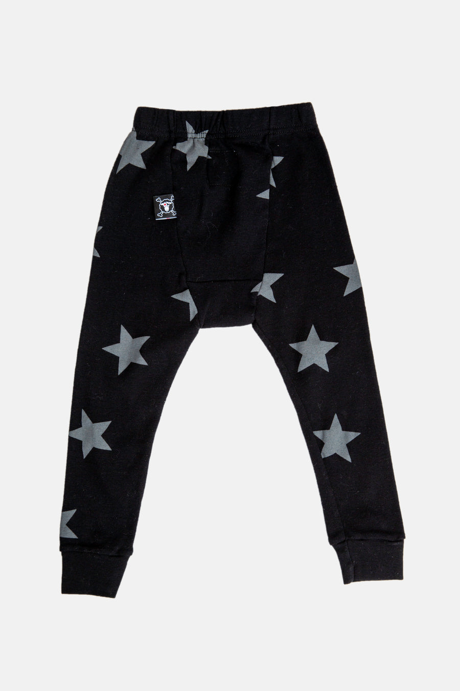 NUNUNU's classic drop-crotch star pant. This unisex footie style provides warmth and comfort with a relaxed loose fit and stretch drawstring waist for your little one to lounge in.