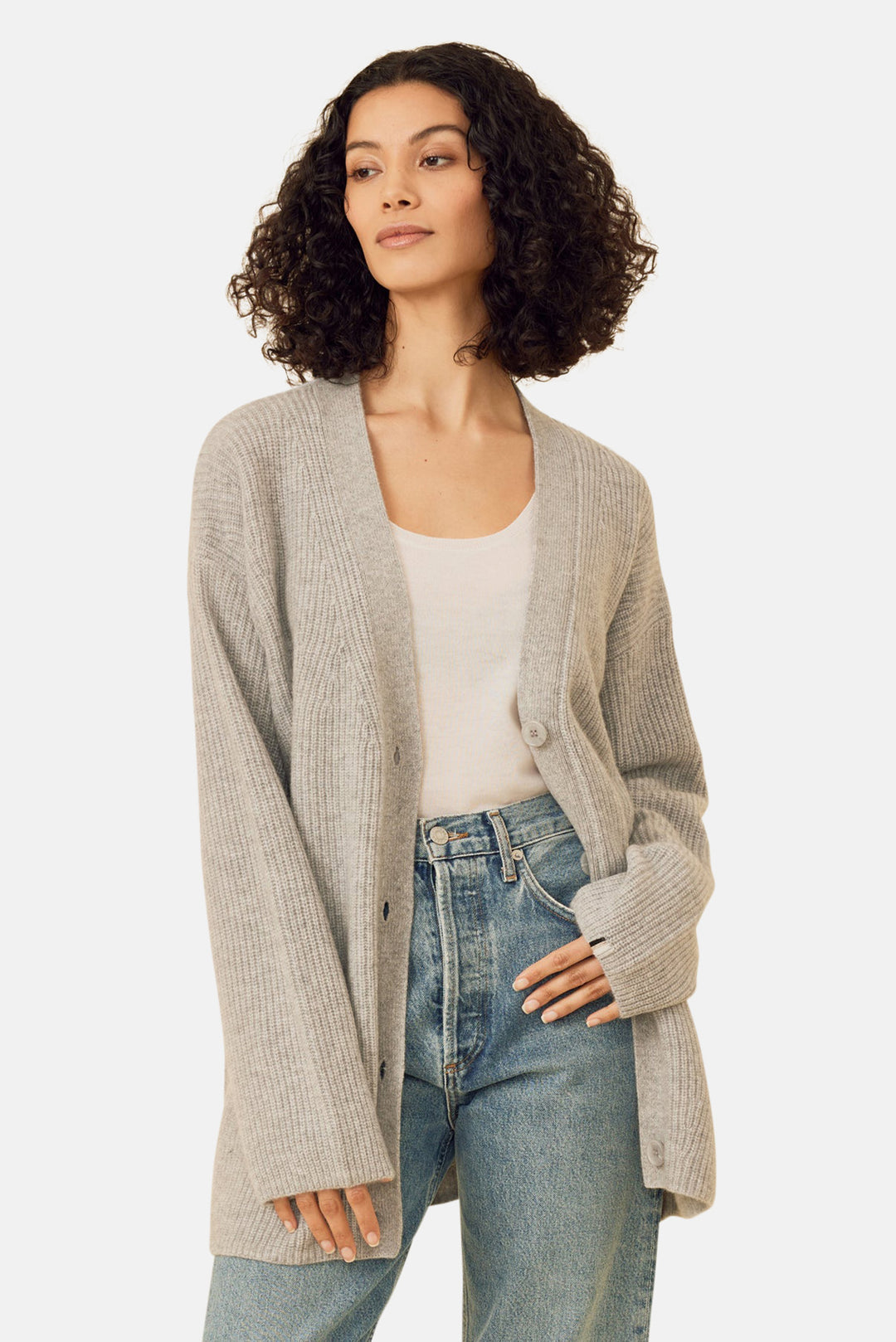 - A classic cashmere fisherman-rib cardigan with an oversized fit for comfort, with a dropped neck with large logo buttons
