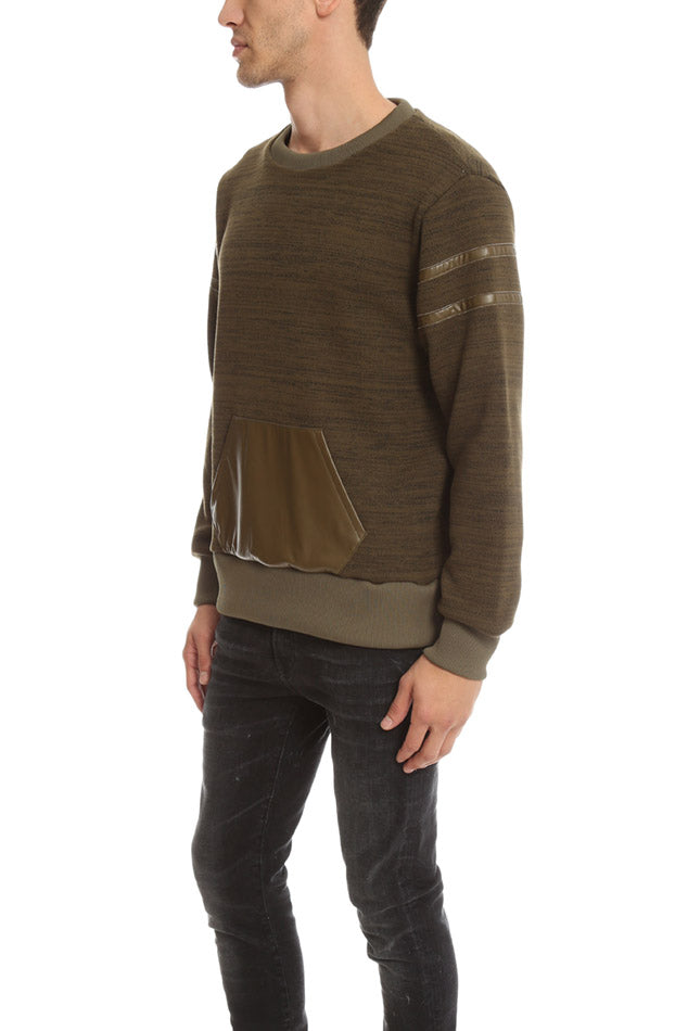 Deep green melange knit crewneck with faux leather arm bands and kangaroo pocket. Solid green ribbing at cuffs, hem and collar. Oversized sleeves with a modern, boxy fit.