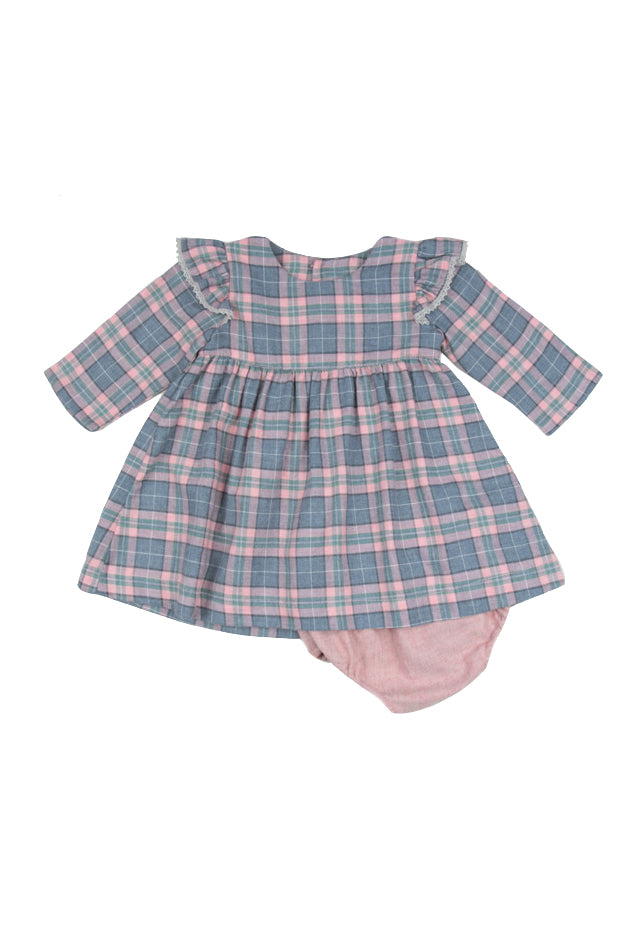 Poeme & Poesie plaid long sleeved swing dress made with 100% organic cotton. Detailed with lace edged ruffles on the shoulders for a more dainty effect. Finished with mother of pearl button back closure and matching bloomers.