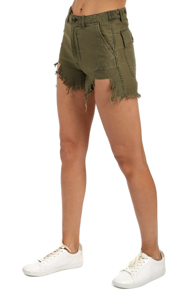 Serious distressing creates a worn through, out of the trenches feel to these army green shorts. Back flap pockets lend an element of utility to complete the look.
