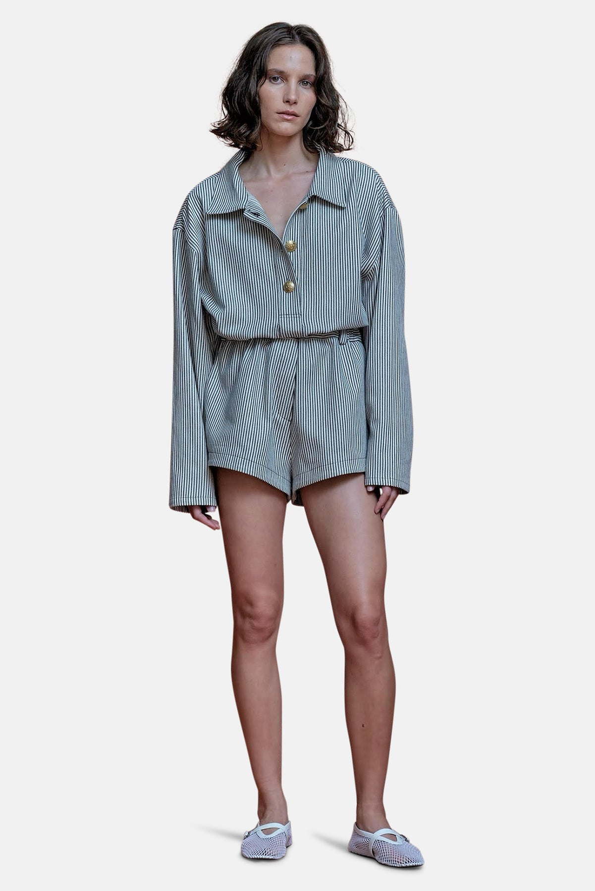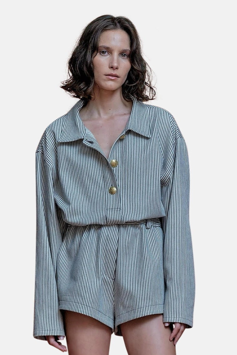 A relaxed, oversized button-up shirt with a boxy silhouette. Crafted from a lightweight, textured fabric with a subtle railroad stripe pattern, blending vintage workwear charm with modern appeal.