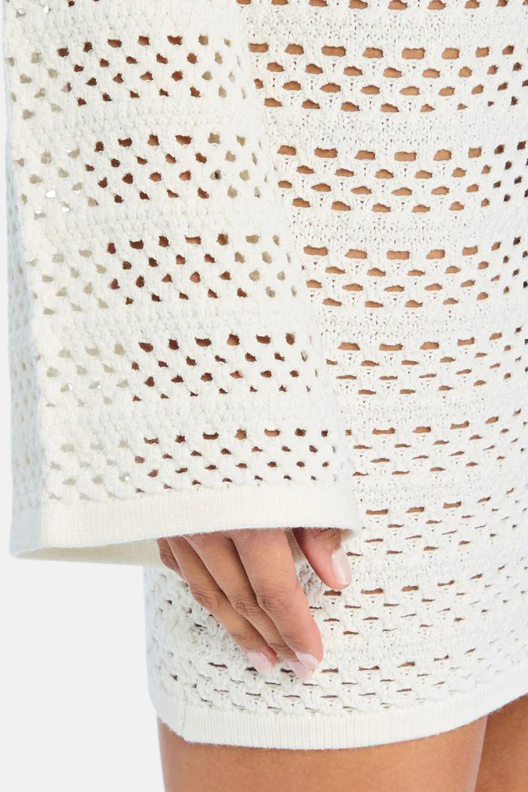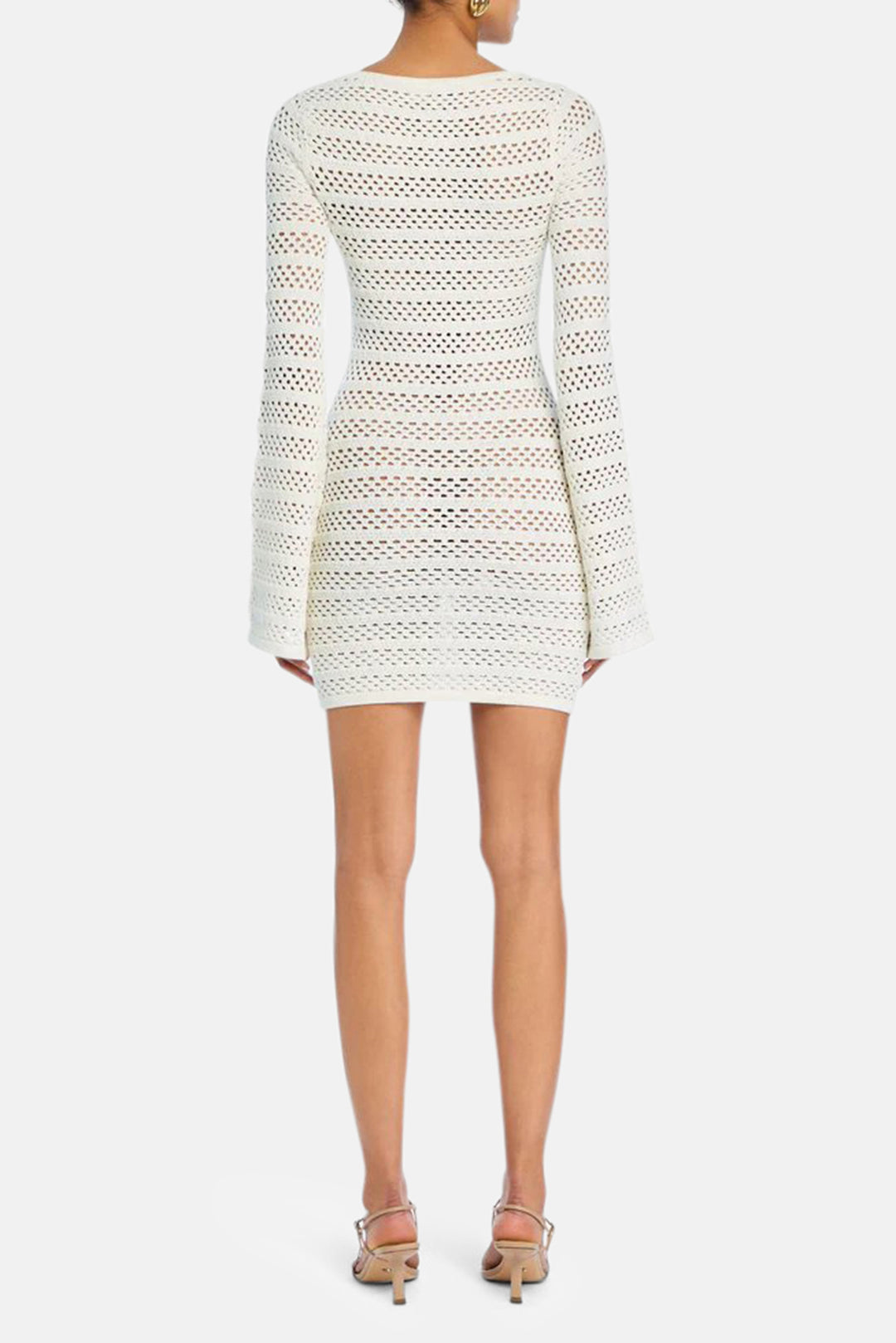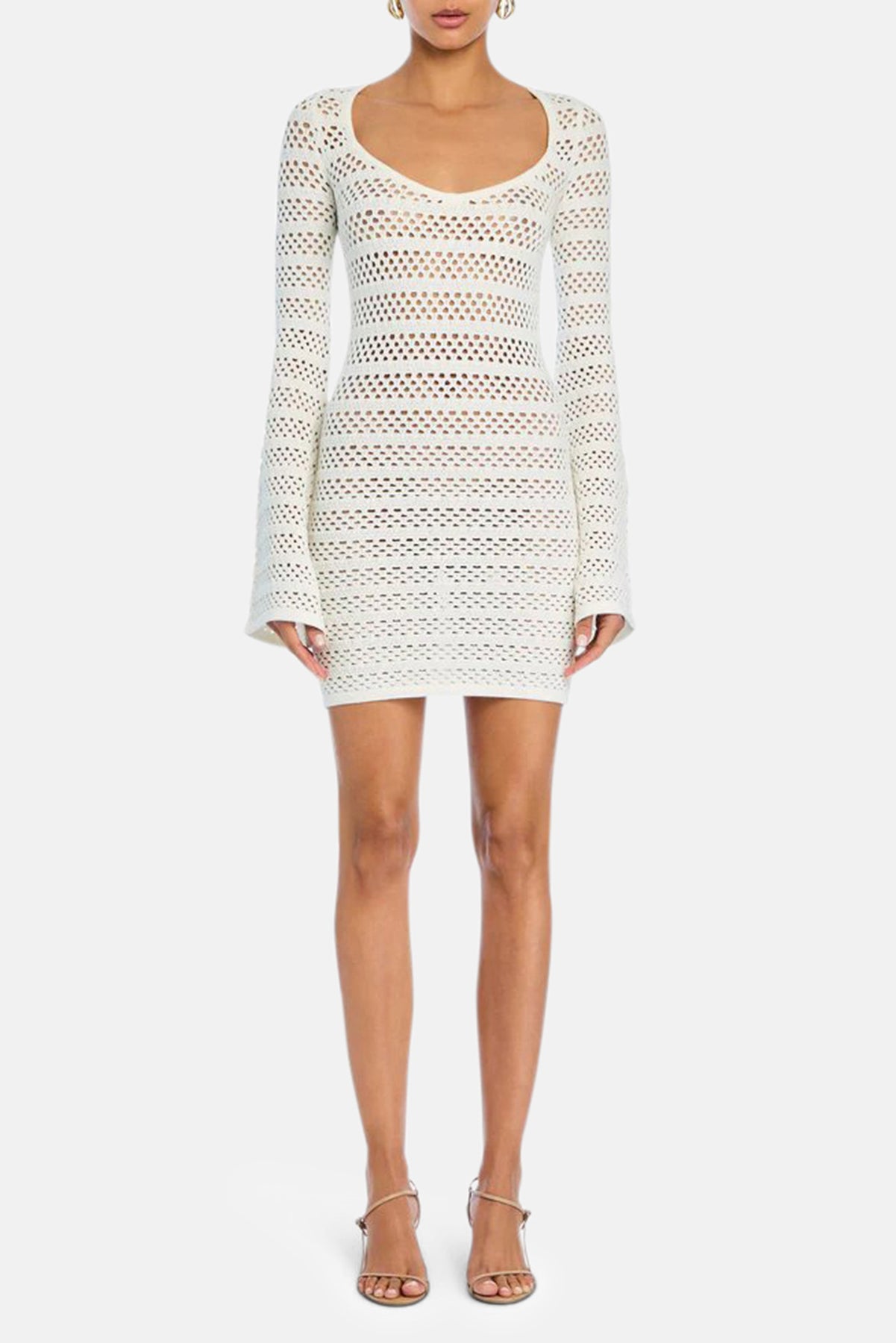 Bodycon, crochet mini dress with long, bell sleeves. Shown here in Porcelain.