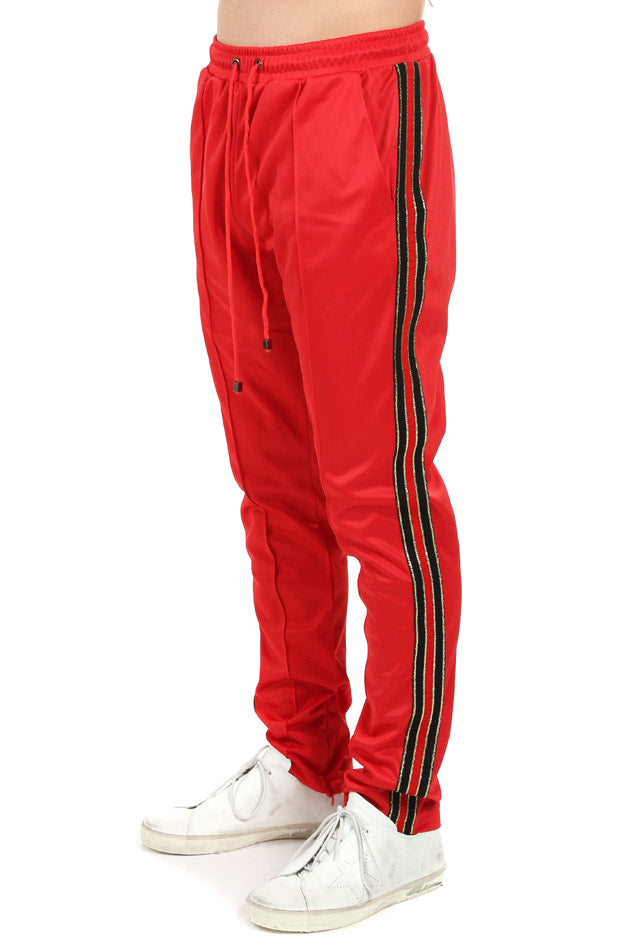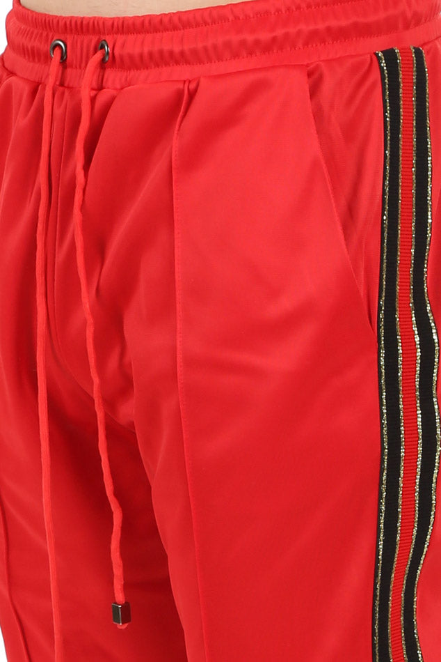 The "Redeemed Saint 2.0" track pants in premium red polyester feature a skinny fit with our signature lurex metallic side stripe tape in red and black with gold trim. Red drawstring with gunmetal aglets at elasticized waistband. Three-pocket styling. Pleated vertical seams along the front. Hidden tonal zipper at ankle cuffs.