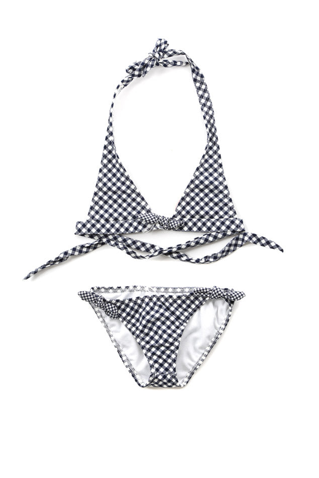 Gingham printed bikini featuring bows at the center front and bottom sides, halter neck tie.