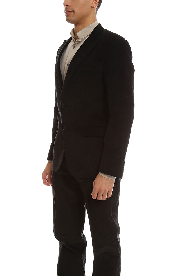 Simon Spurr presents a standout suit jacket in a classic corduroy. A rich textured black pairs well with just about anything, attend to your next event in style at a great price.