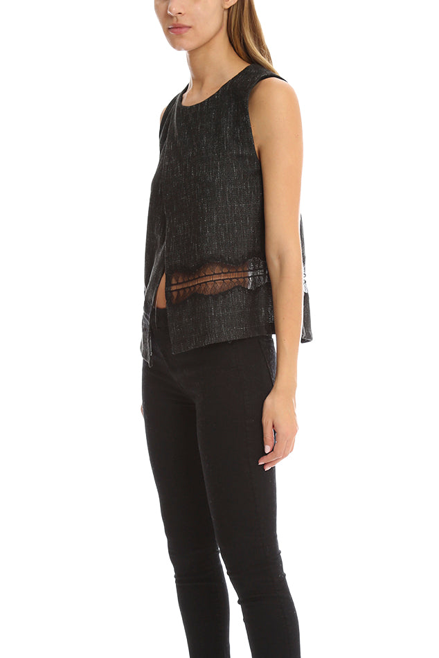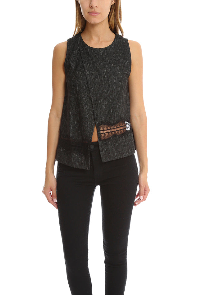 An edgy angular overlay is teamed with a delicate lace on this tank style silhouette by Thakoon. Style with a leather pant for a completed downtown chic look.
