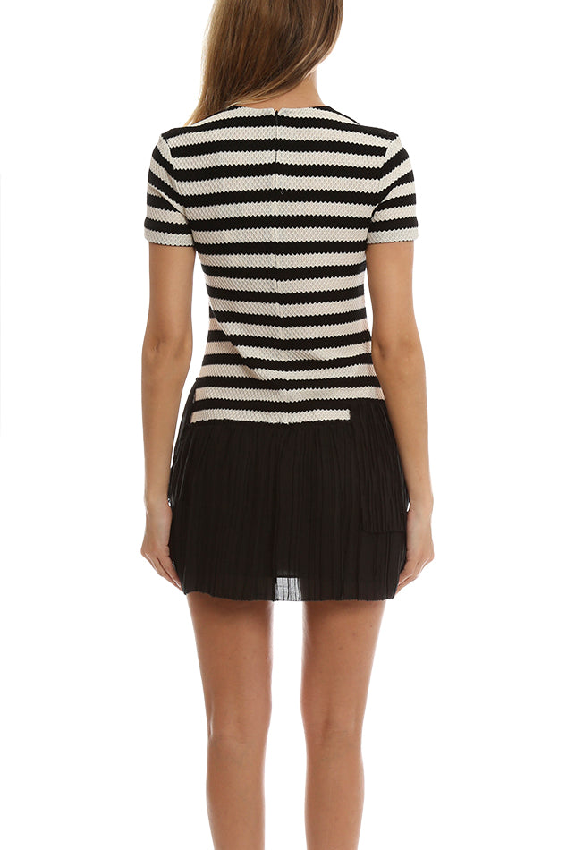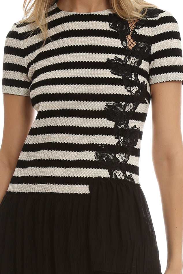 A fun and flirty t-shirt style dress by Thakoon. Beautiful embroidered lace detail down the side and pleated skirt makes this a sophisticated go-to.