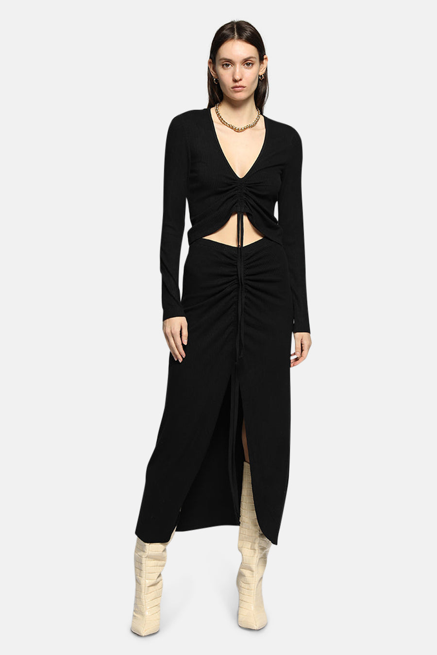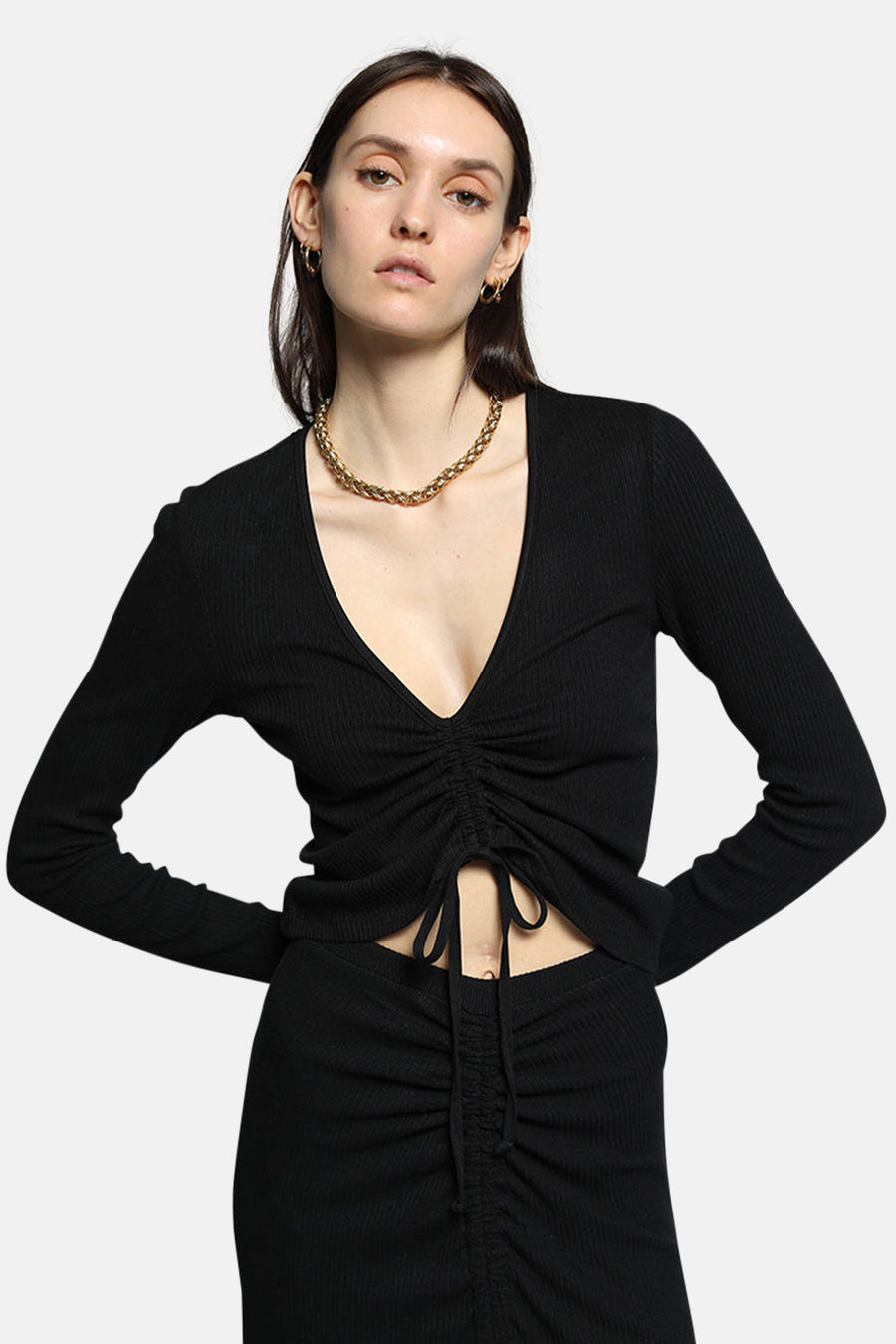 - Color: Black- 98% Viscose, 2% Spandex- Cinching can be adjusted- Cropped length- Ribbed body- Imported- Style #: TH4V66RD- Hand wash cold