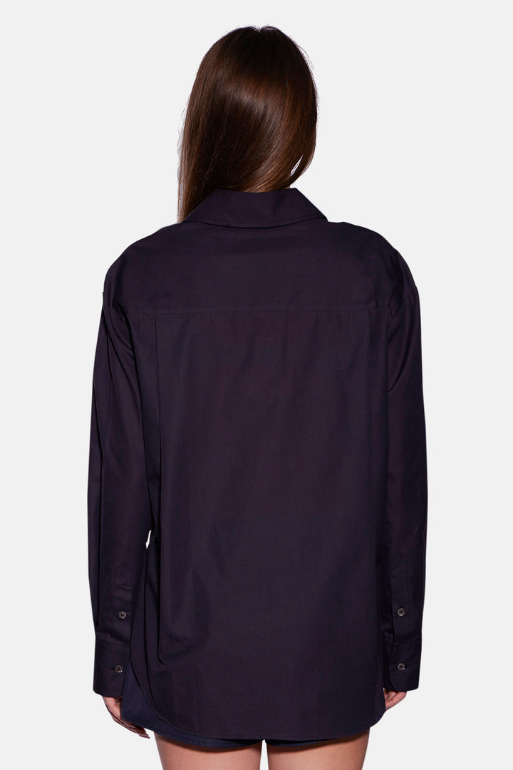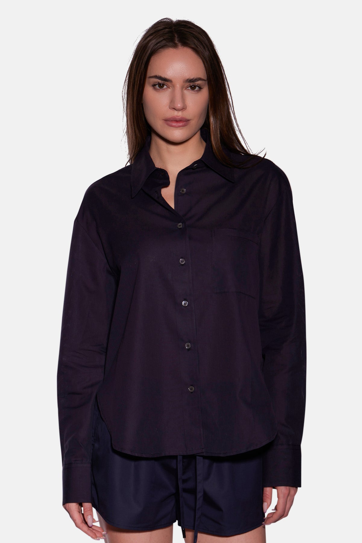 A Fine Poplin cotton shirt featuring a luxe body silhouette, crafted with a spread collar and delicate front pocket detailing. This versatile garment pairs seamlessly with jeans for a casual-chic look, or with cargo trousers for a touch of utility-inspired sophistication. For a coordinated look, simply match it with our Georgica wide leg pant for a polished yet relaxed feel.