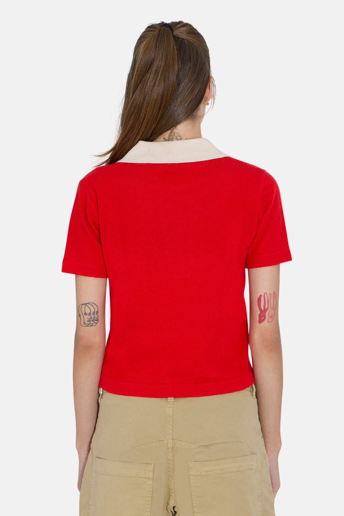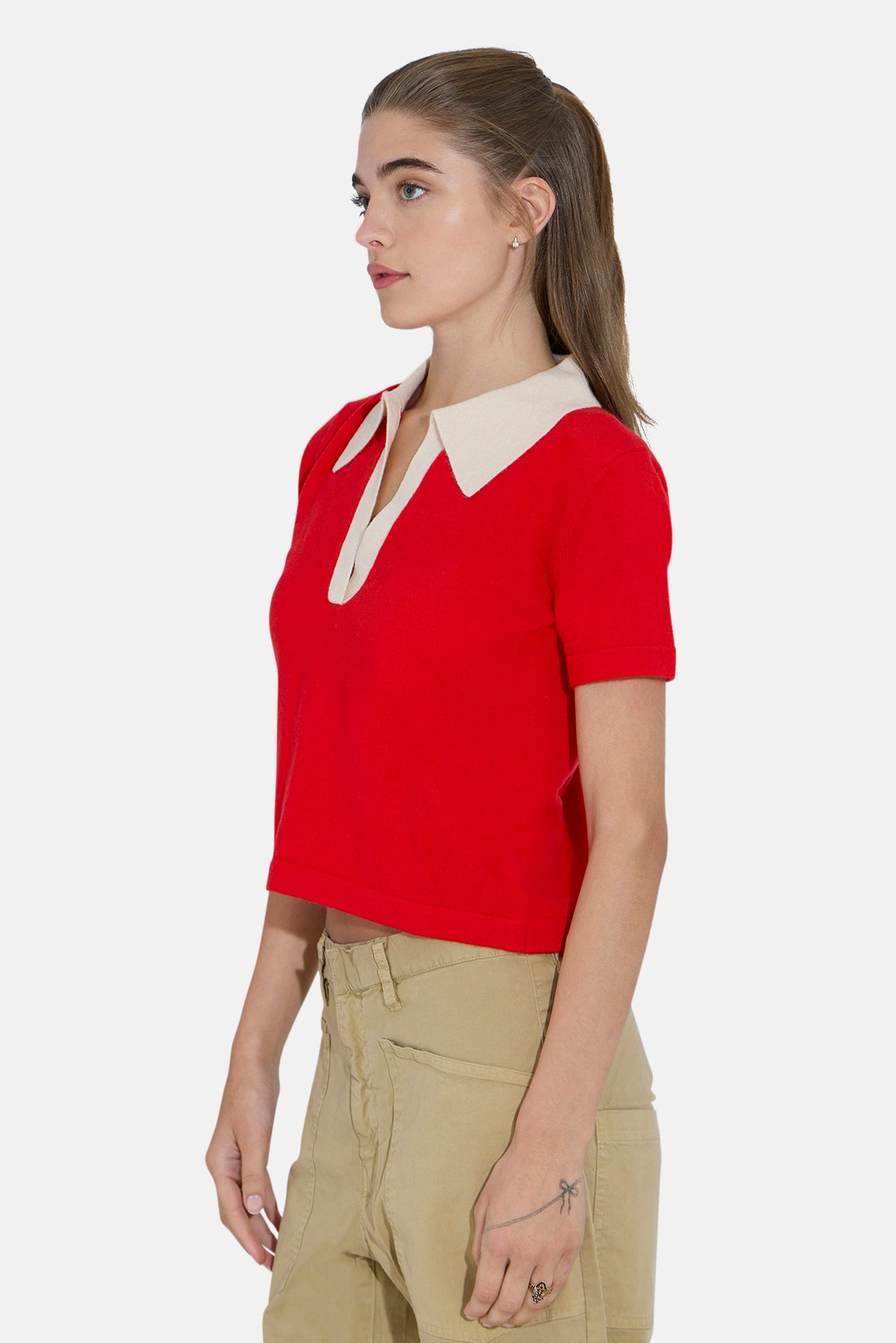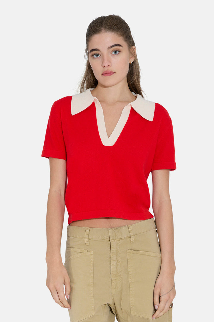 The Tate Polo is crafted from soft, lightweight cashmere with a cropped silhouette and soft ivory collar detail that pops against the bold red body.