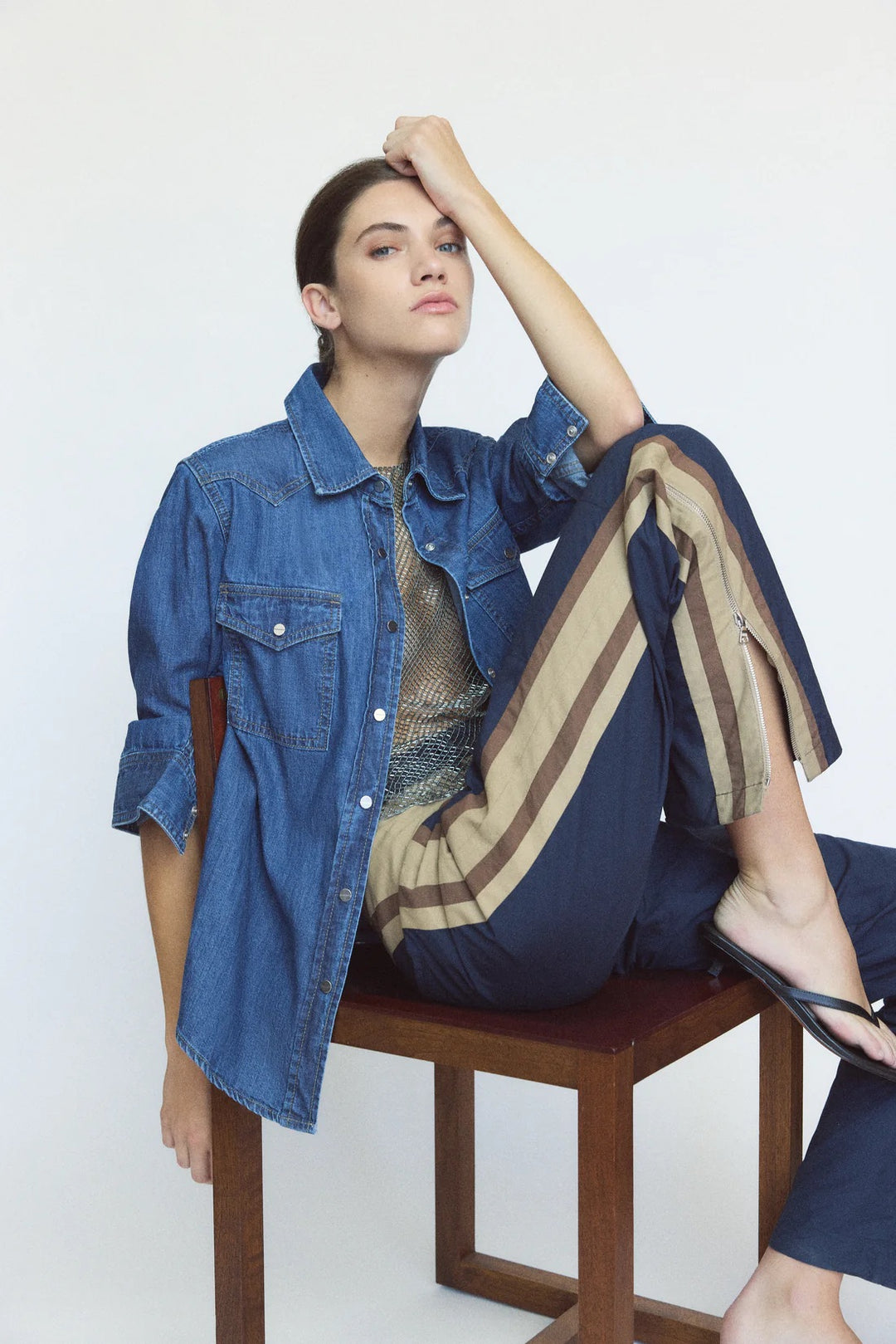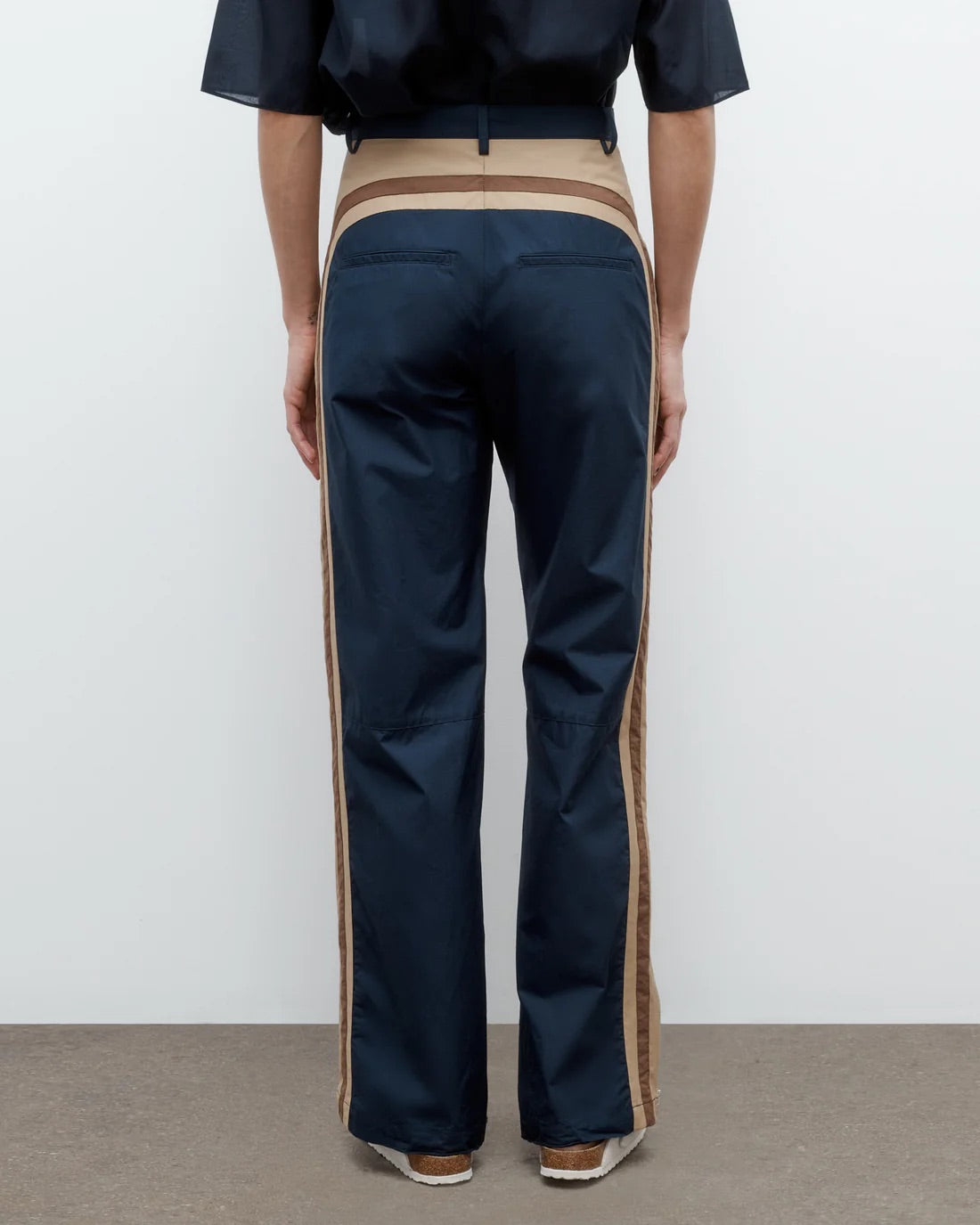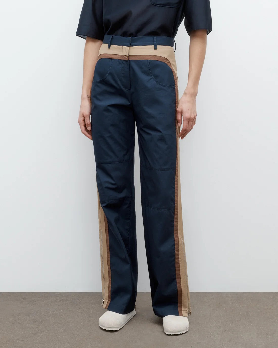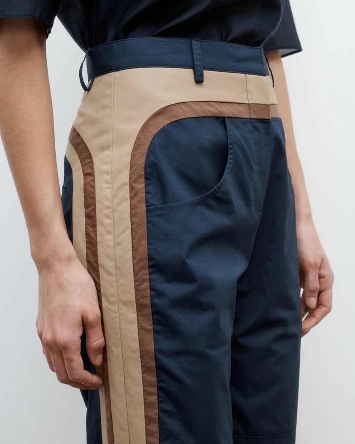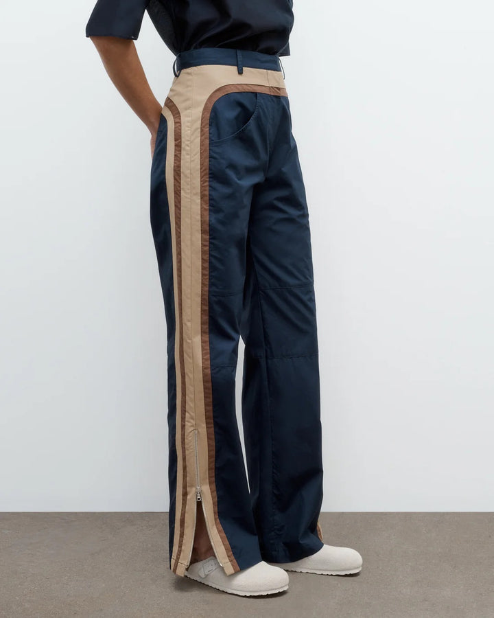 High-rise, straight leg cargo pants in super compact poplin. This fabric is lightweight with a smooth texture and crisp hand feel. Bella is fitted at the hip and relaxed through the leg, with contrast racing stripes that run throughout. Complete with curved side pockets, back pockets, concealed zip-fly, hook and eye closure, belt loops and side zip at the hems.