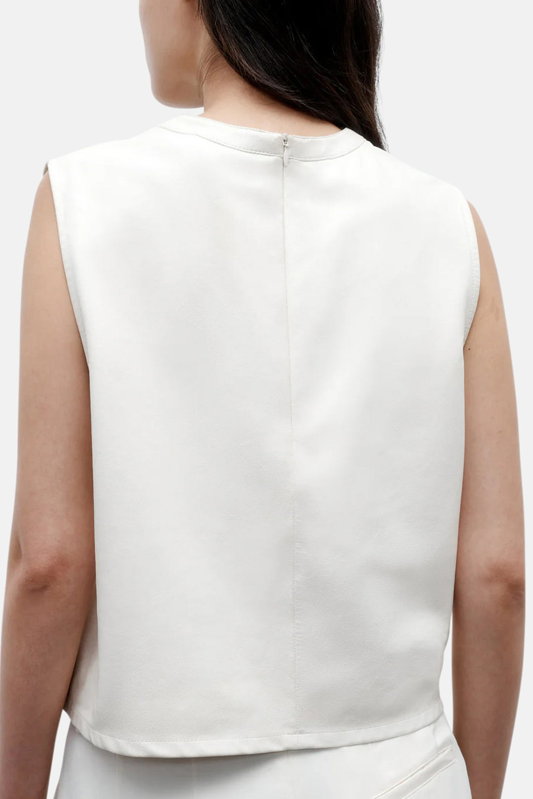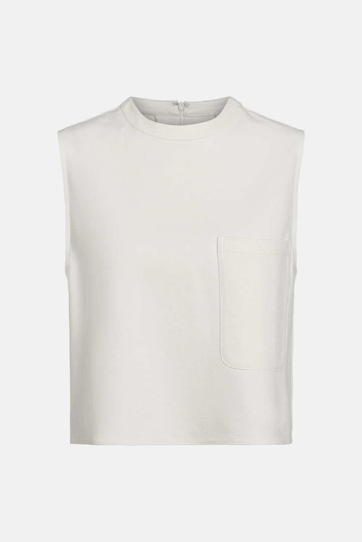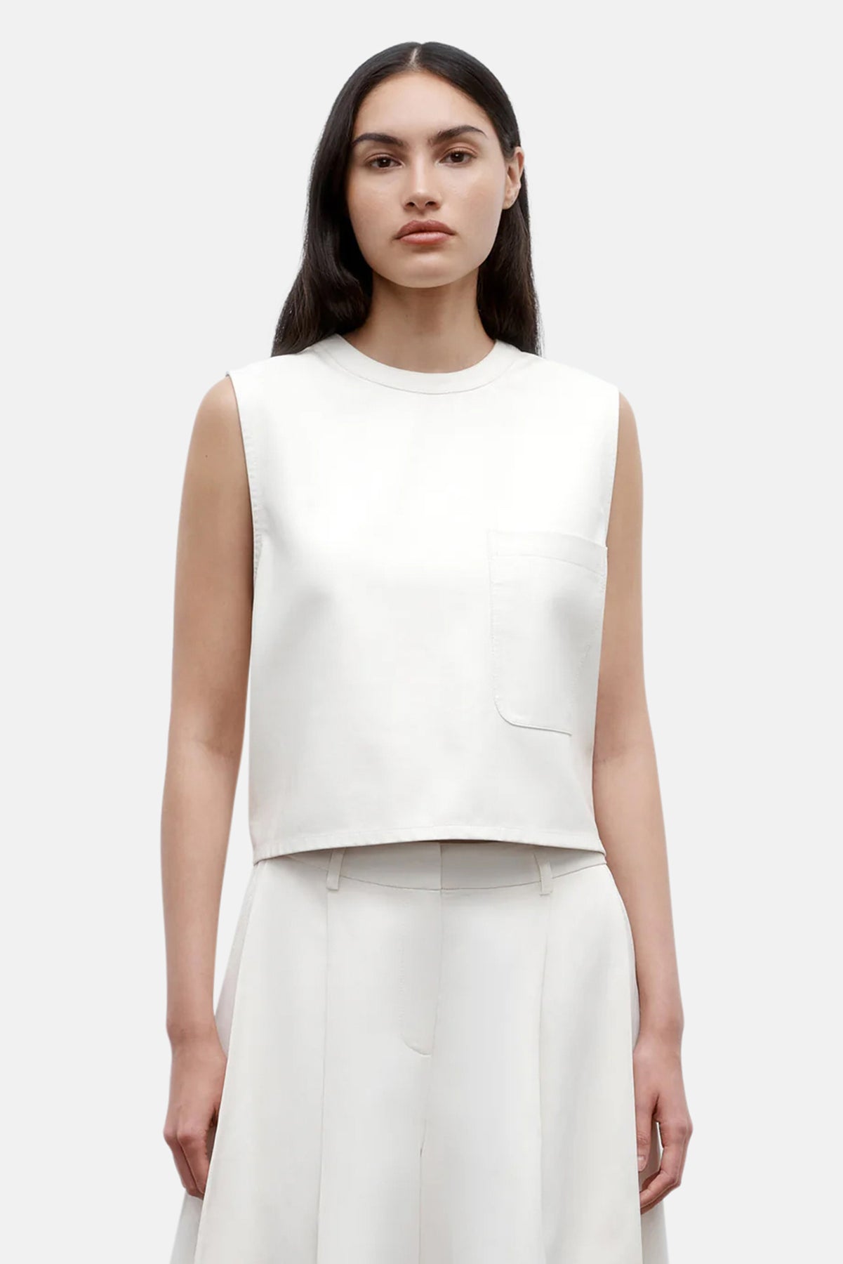 Cropped, round neck tank top in paper leather. We finished a paperweight lambskin leather on both sides to reveal a supple finish on the exterior and soft suede on the inside. This top is a boxy fit with elongated arm holes. Complete with a chest patch pocket and concealed zip at the back.
