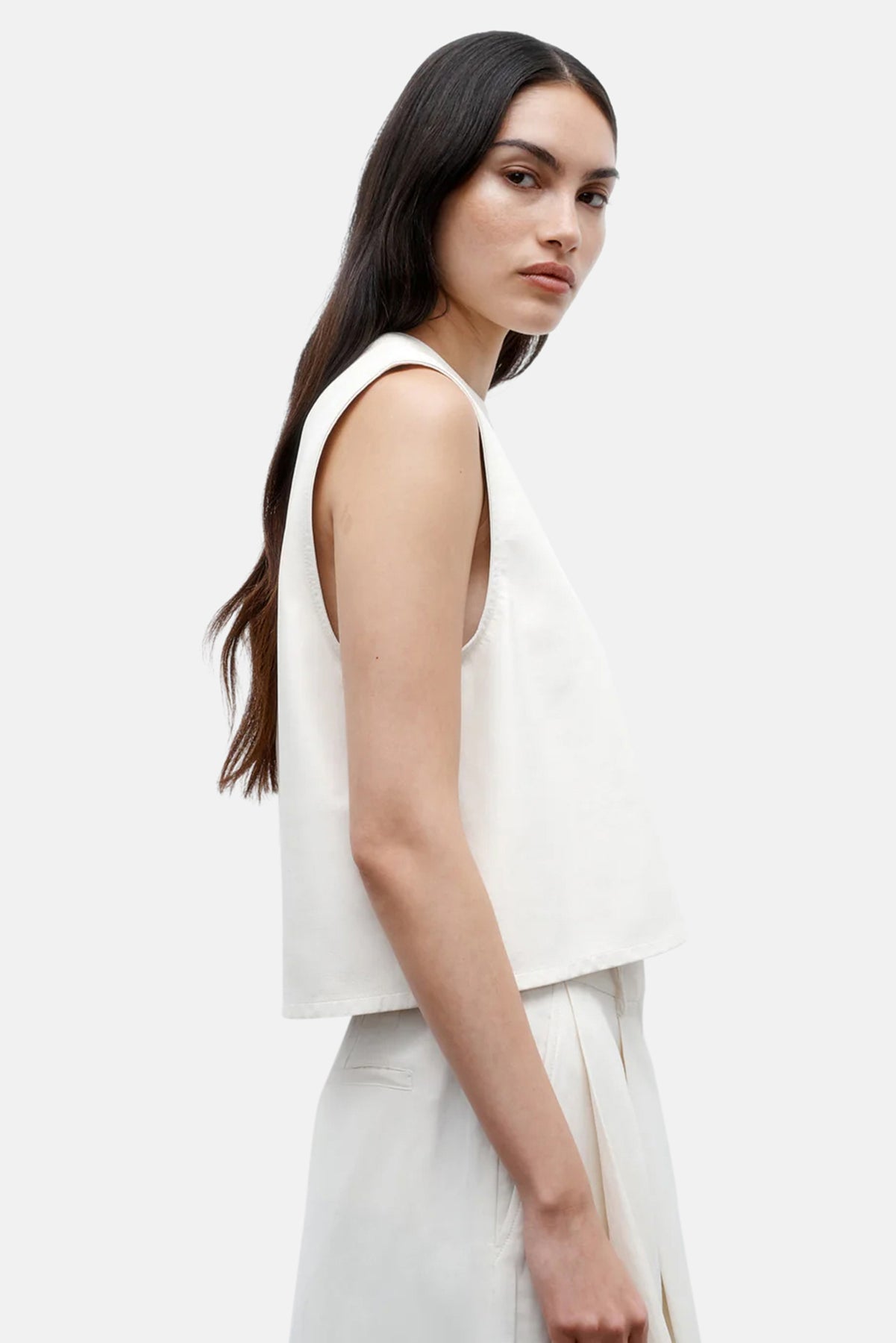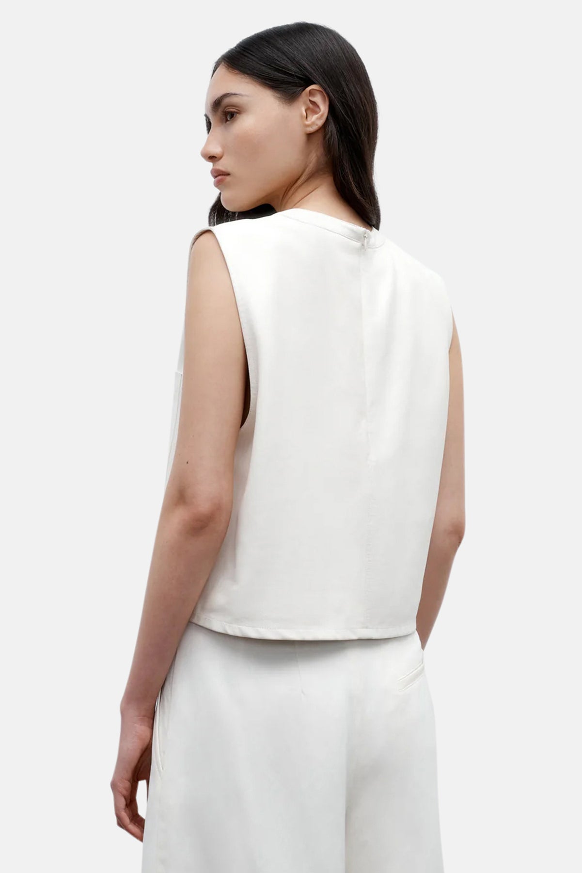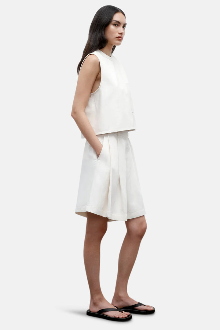 Cropped, round neck tank top in paper leather. We finished a paperweight lambskin leather on both sides to reveal a supple finish on the exterior and soft suede on the inside. This top is a boxy fit with elongated arm holes. Complete with a chest patch pocket and concealed zip at the back.