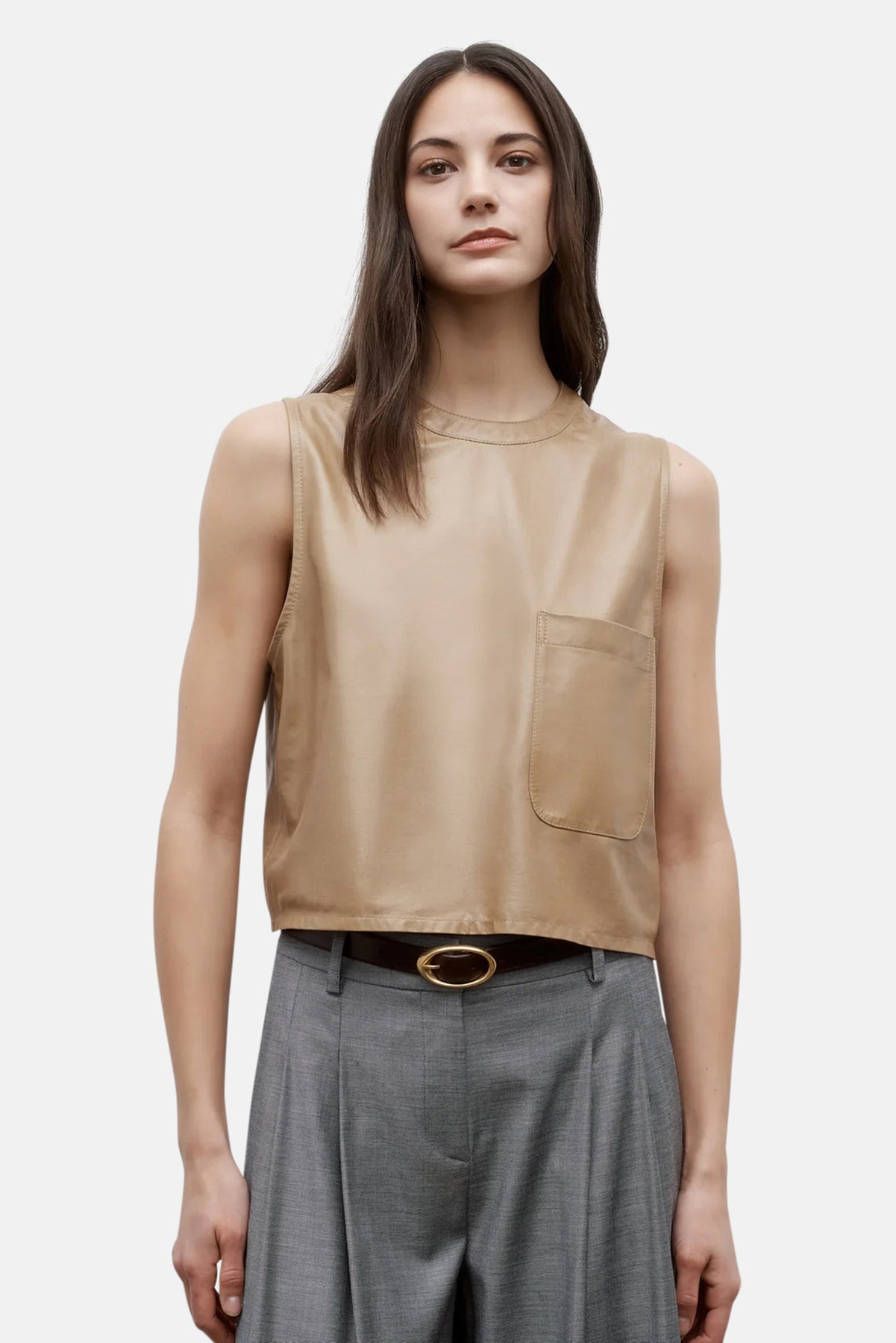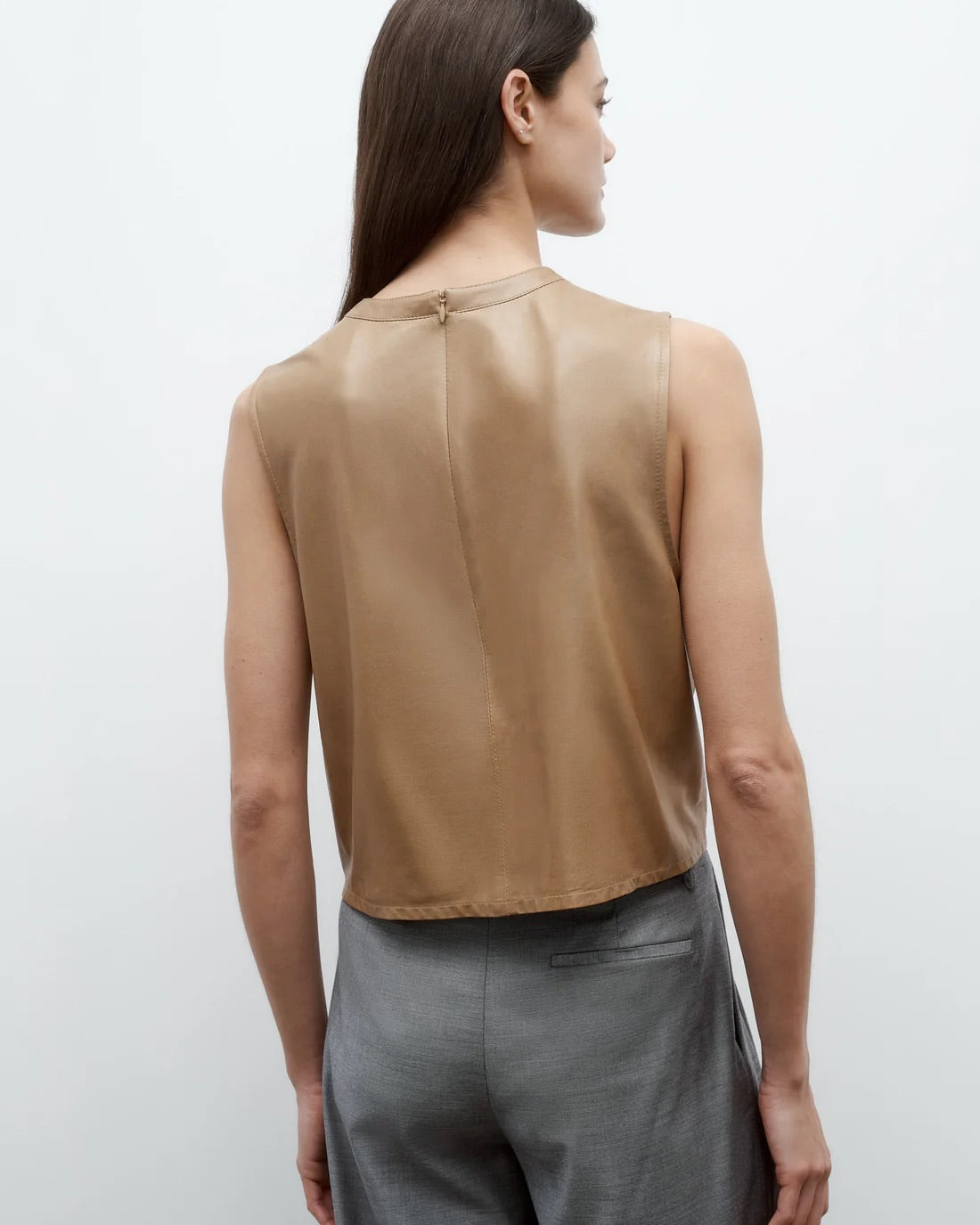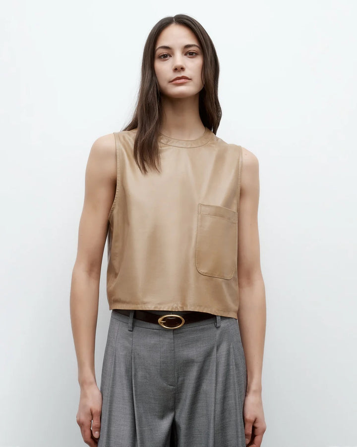 Cropped, round neck tank top in paper leather. We finished a paperweight lambskin leather on both sides to reveal a supple finish on the exterior and soft suede on the inside. This top is a boxy fit with elongated arm holes. Complete with a chest patch pocket and concealed zip at the back.