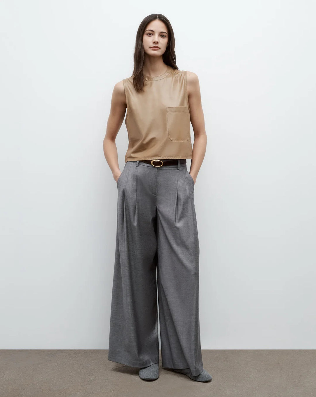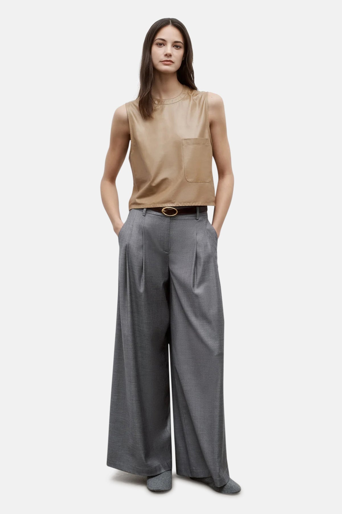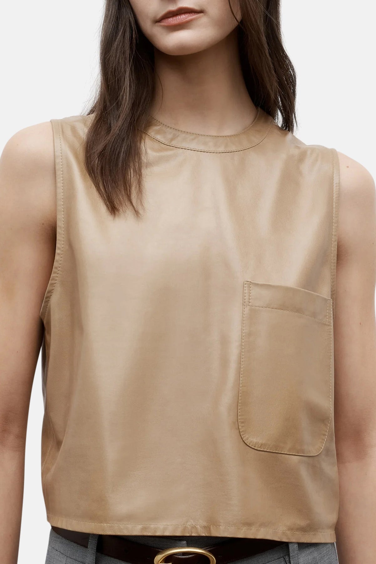 Cropped, round neck tank top in paper leather. We finished a paperweight lambskin leather on both sides to reveal a supple finish on the exterior and soft suede on the inside. This top is a boxy fit with elongated arm holes. Complete with a chest patch pocket and concealed zip at the back.