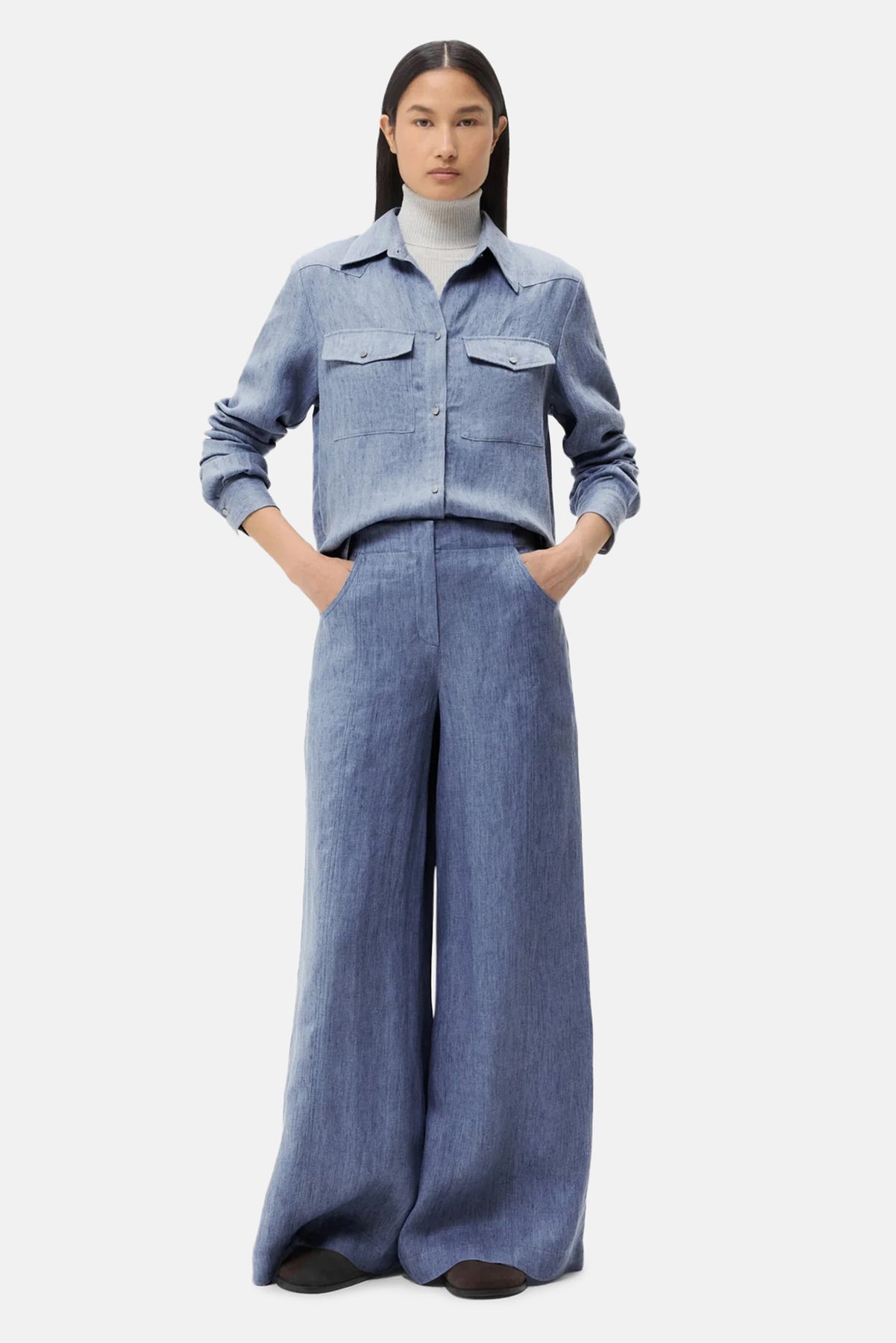 High-rise, floor length pants in washed hemp denim. This fabric is lightweight and washed to create a distressed effect. The Demie is fitted at the hip and flares into a dramatic wide leg. Complete with a zip-fly, hook and eye fastening, belt loops, side pocket and back welt pocket.