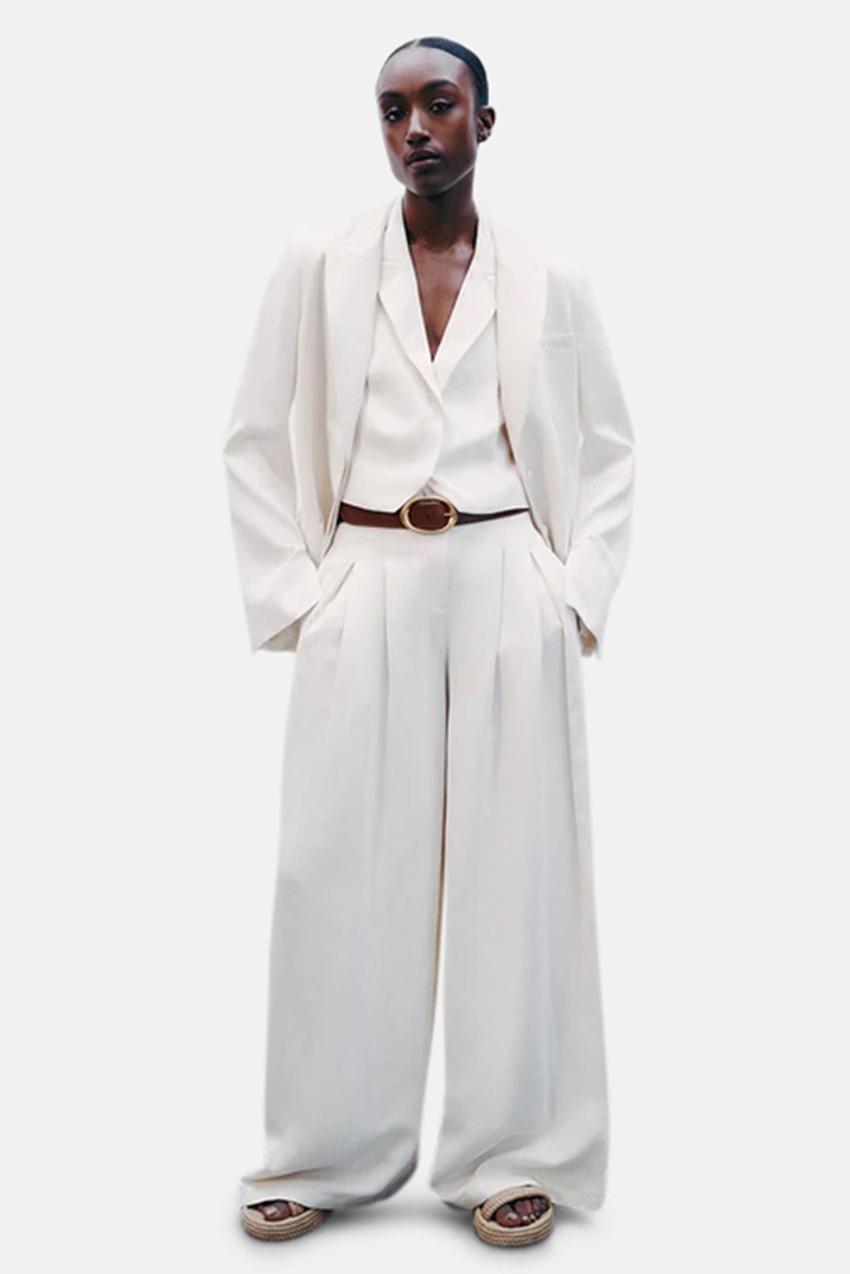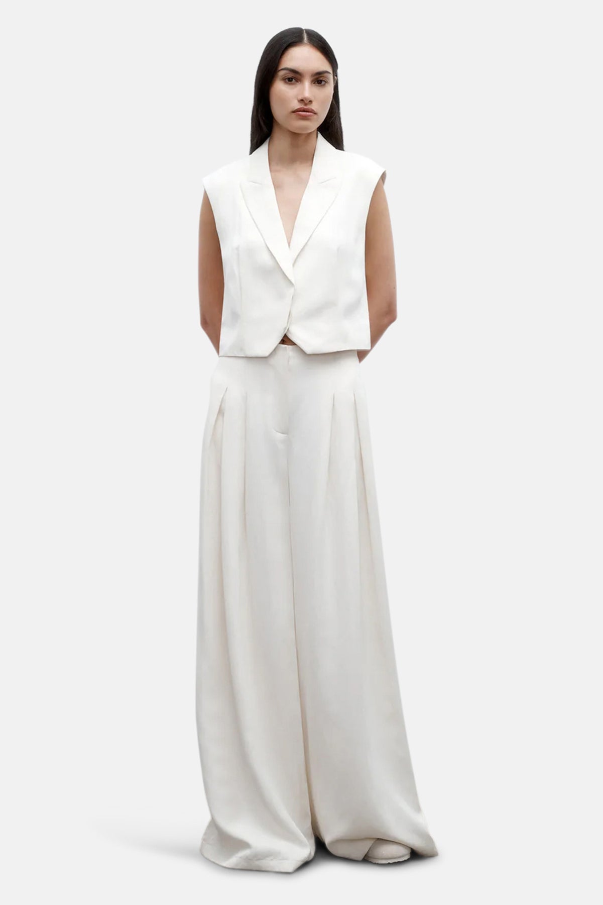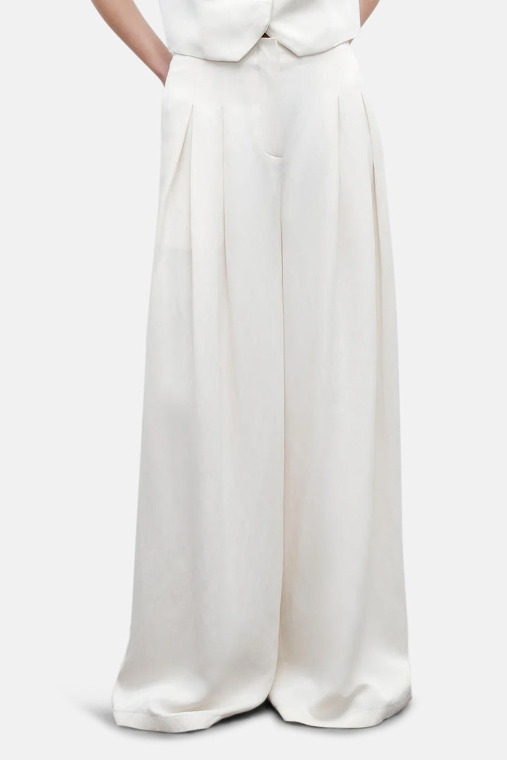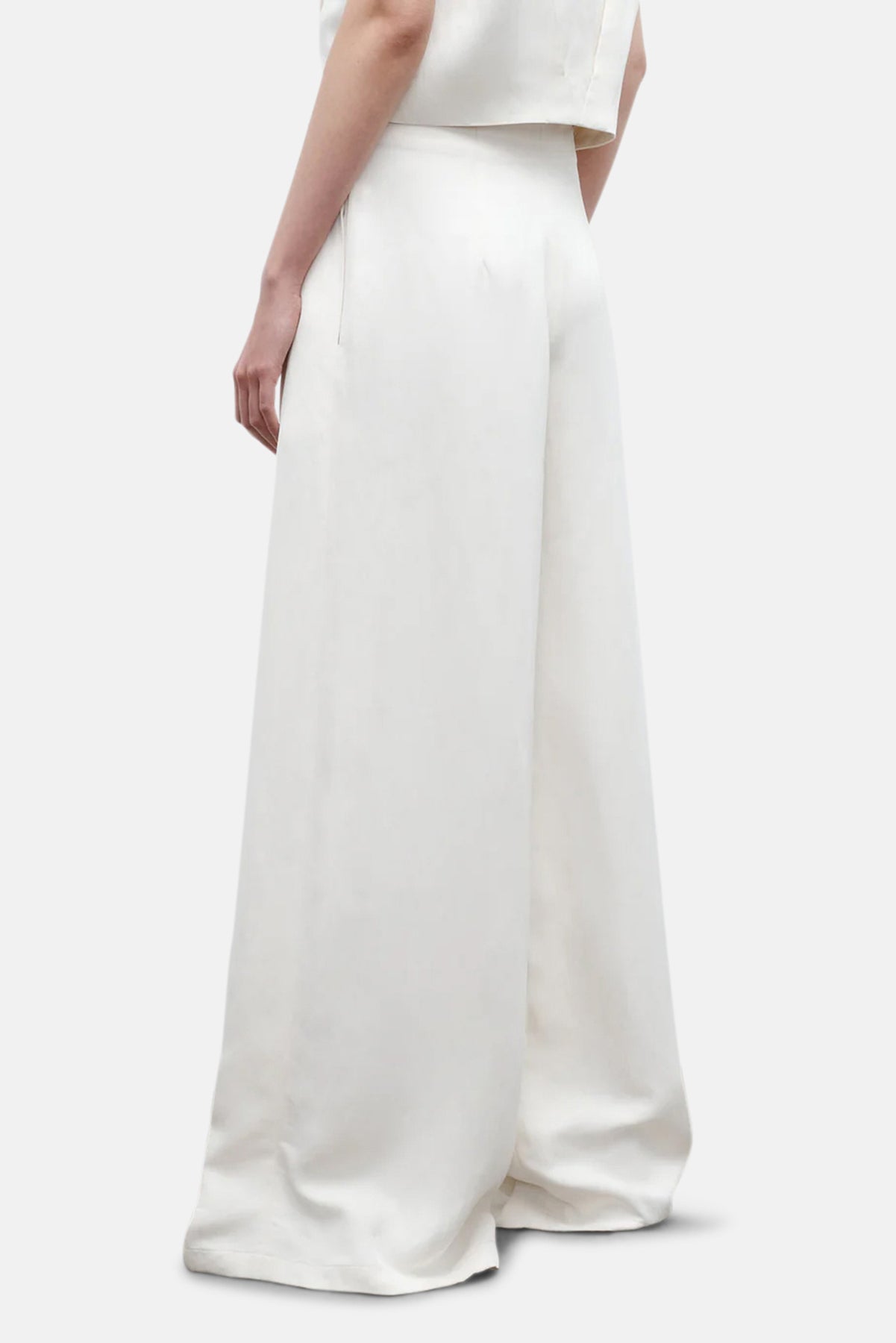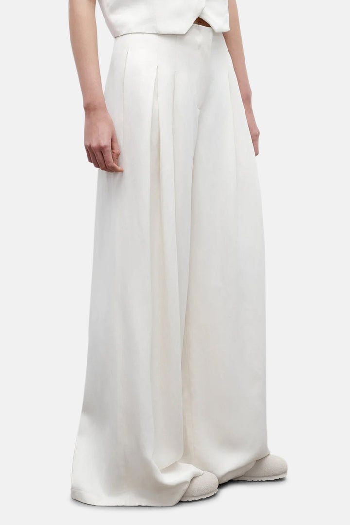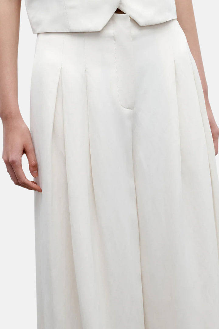 High-rise, wide leg pants in coated viscose linen. We combined a european flax linen, and viscose coating, creating a fabric with a deep color saturation, elegant drape and satiny sheen. The Drew has floor length pleats through the leg. Complete with side pockets, a concealed zip fly and hook and bar fastening at the waist.