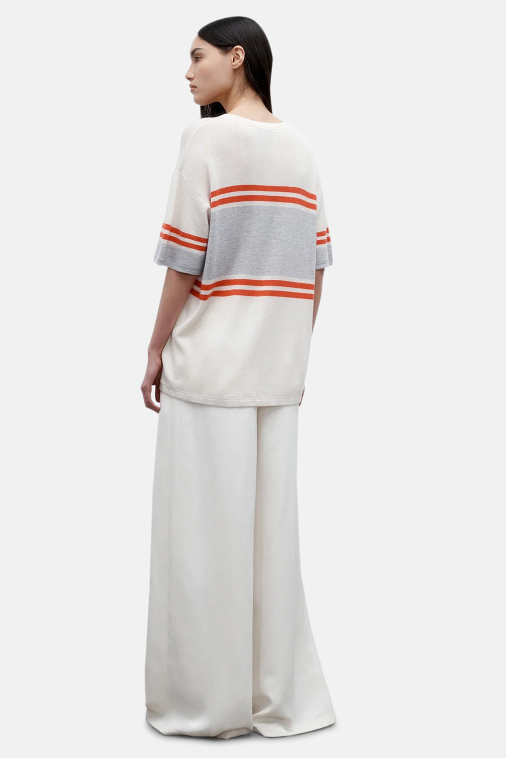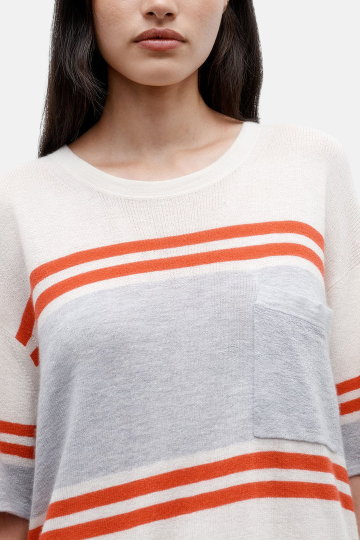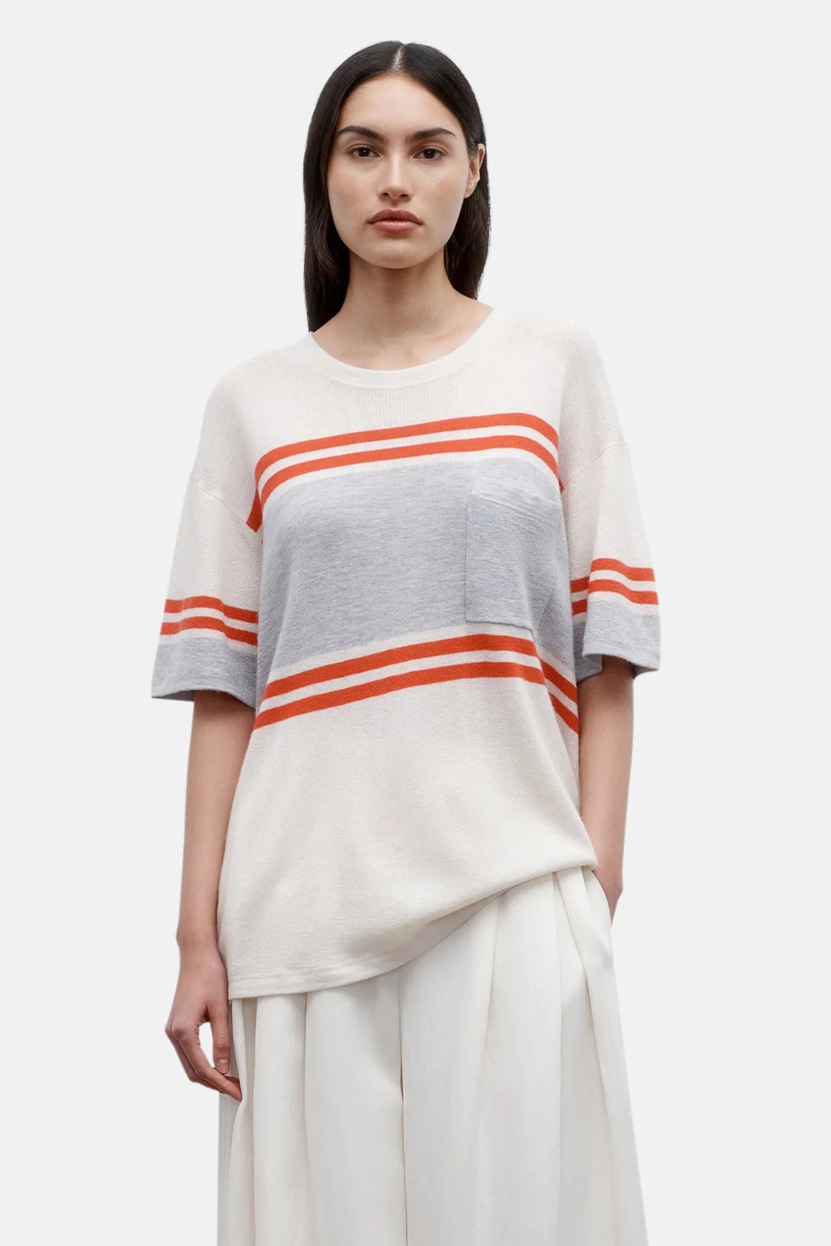 Oversized, slouchy round-neck t-shirt in striped super-fine lightweight cashmere. The Big Boy Tee has a chest patch pocket and is fully fashioned at the neck and cuff.