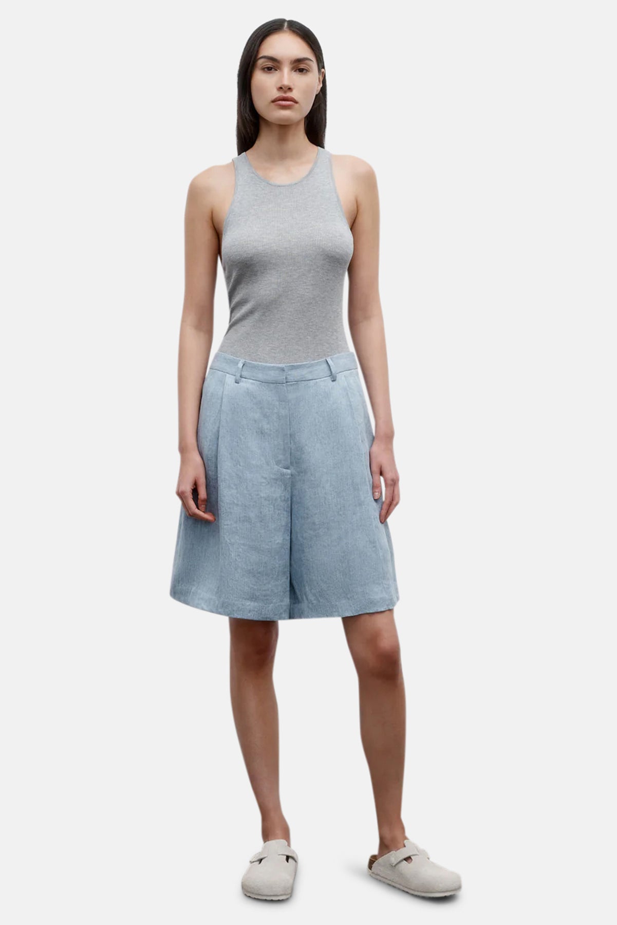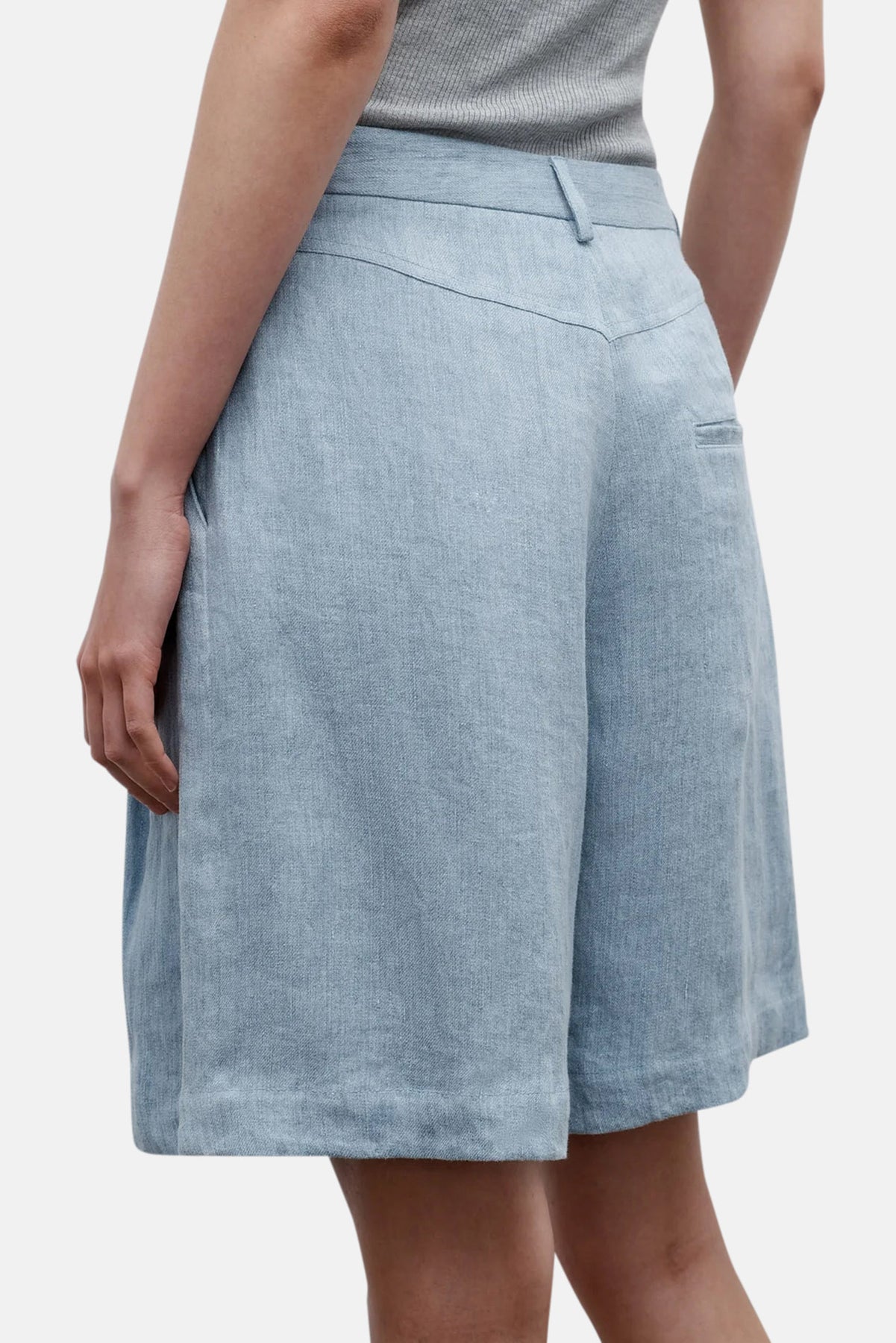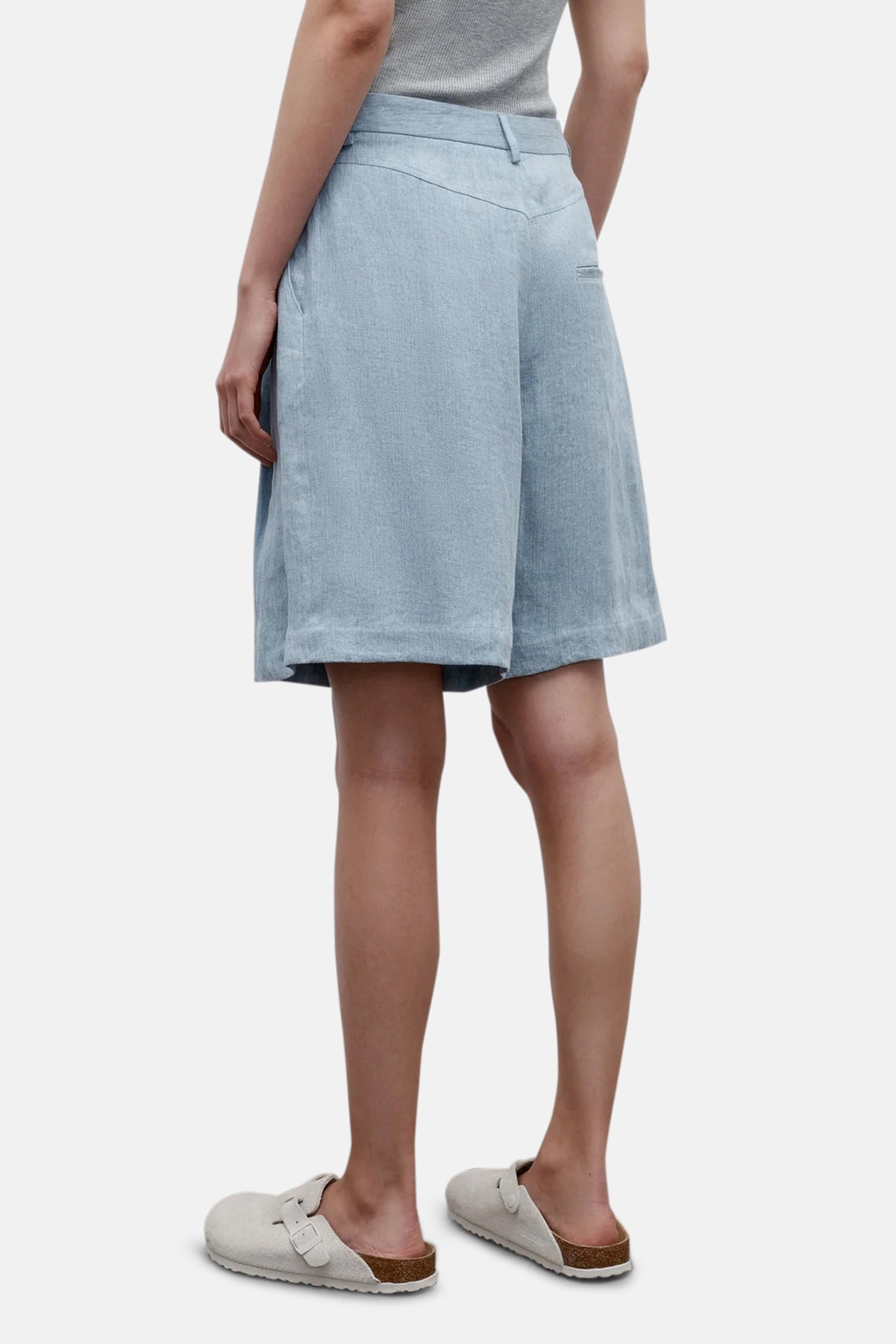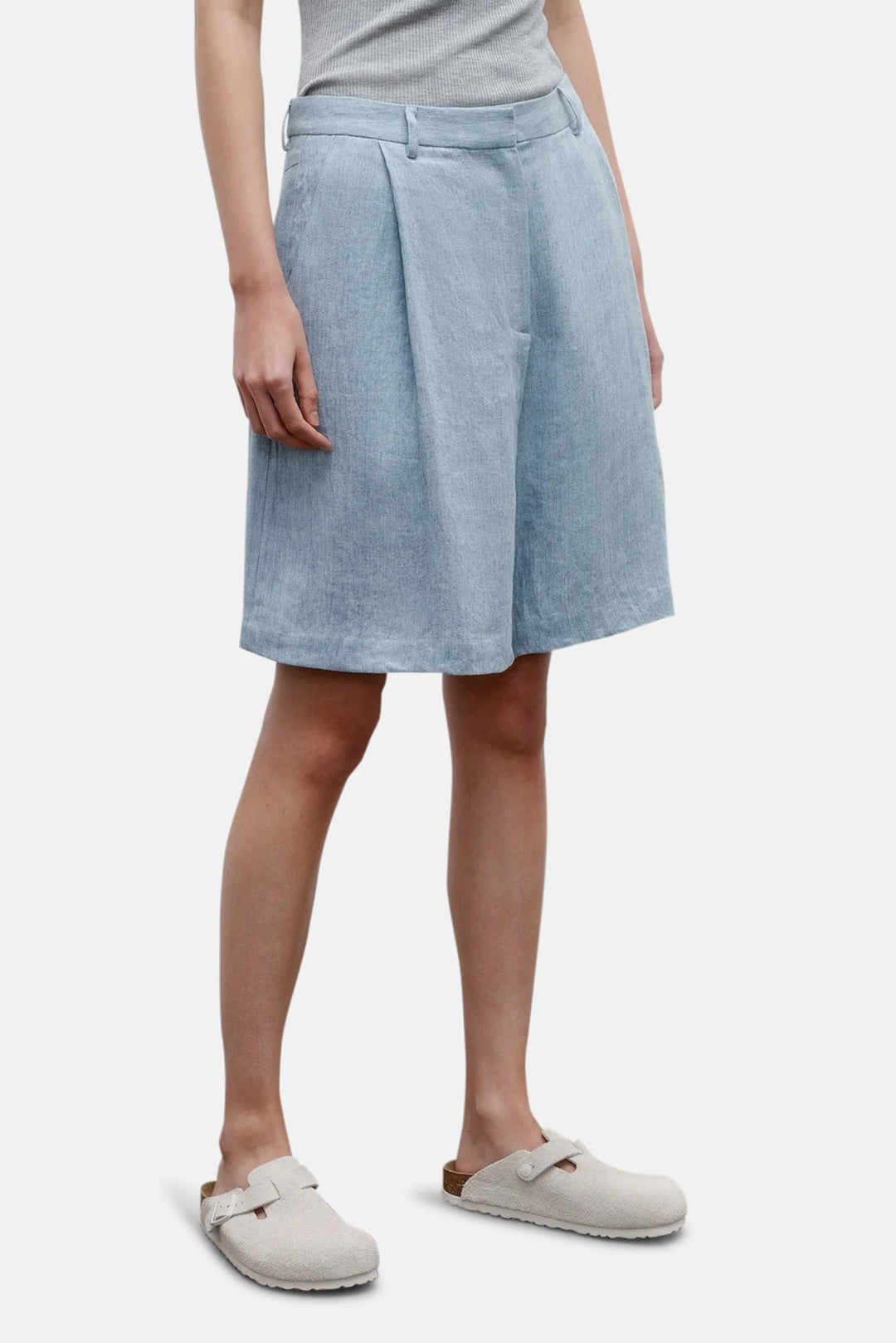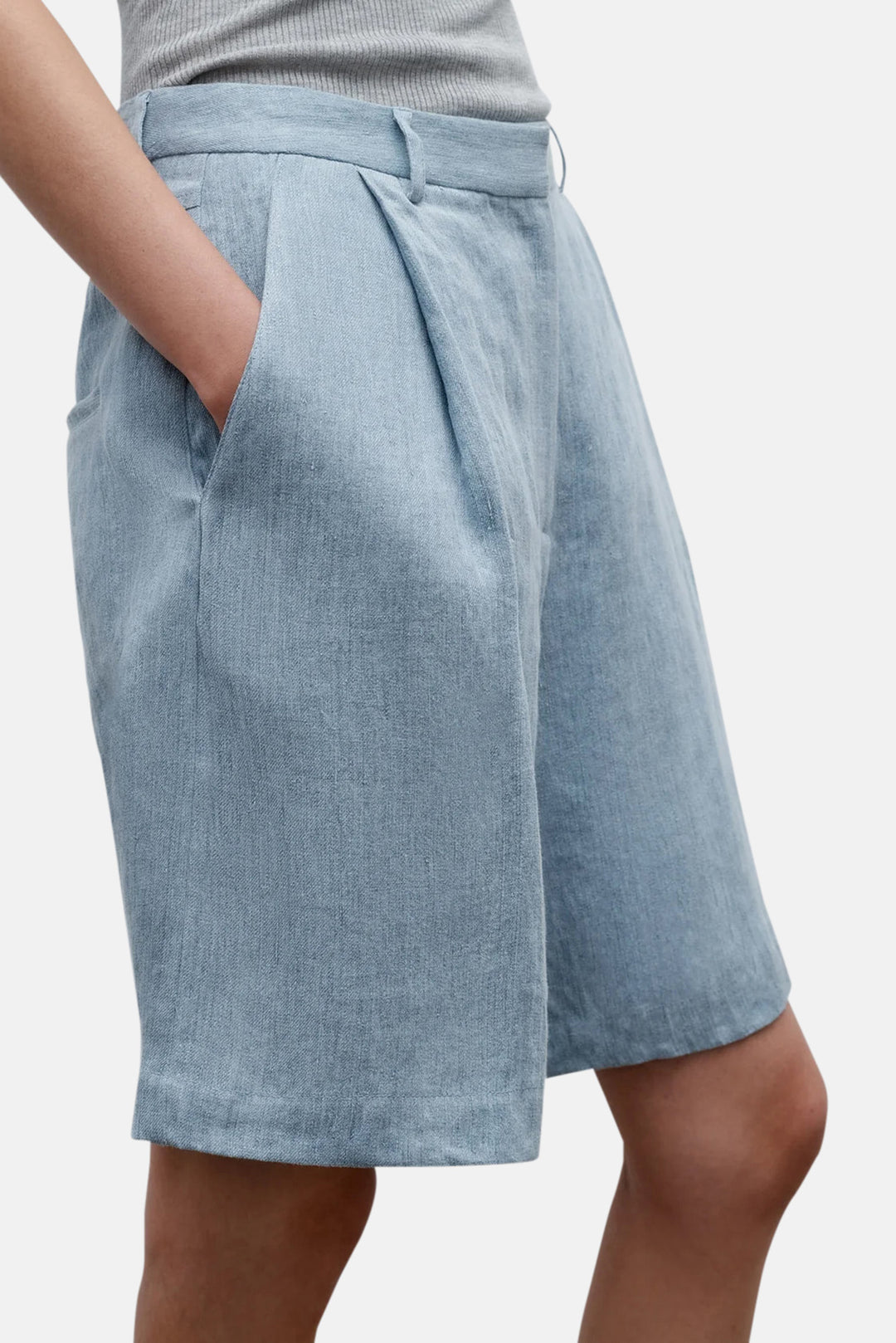 Mid-rise pleated bermuda shorts in washed hemp denim. This fabric is lightweight and washed to create a distressed effect. The Fisher Short is relaxed through the leg, with pleats at the front and side. Complete with side pockets, back welt pocket, belt loops and concealed zip-fly.