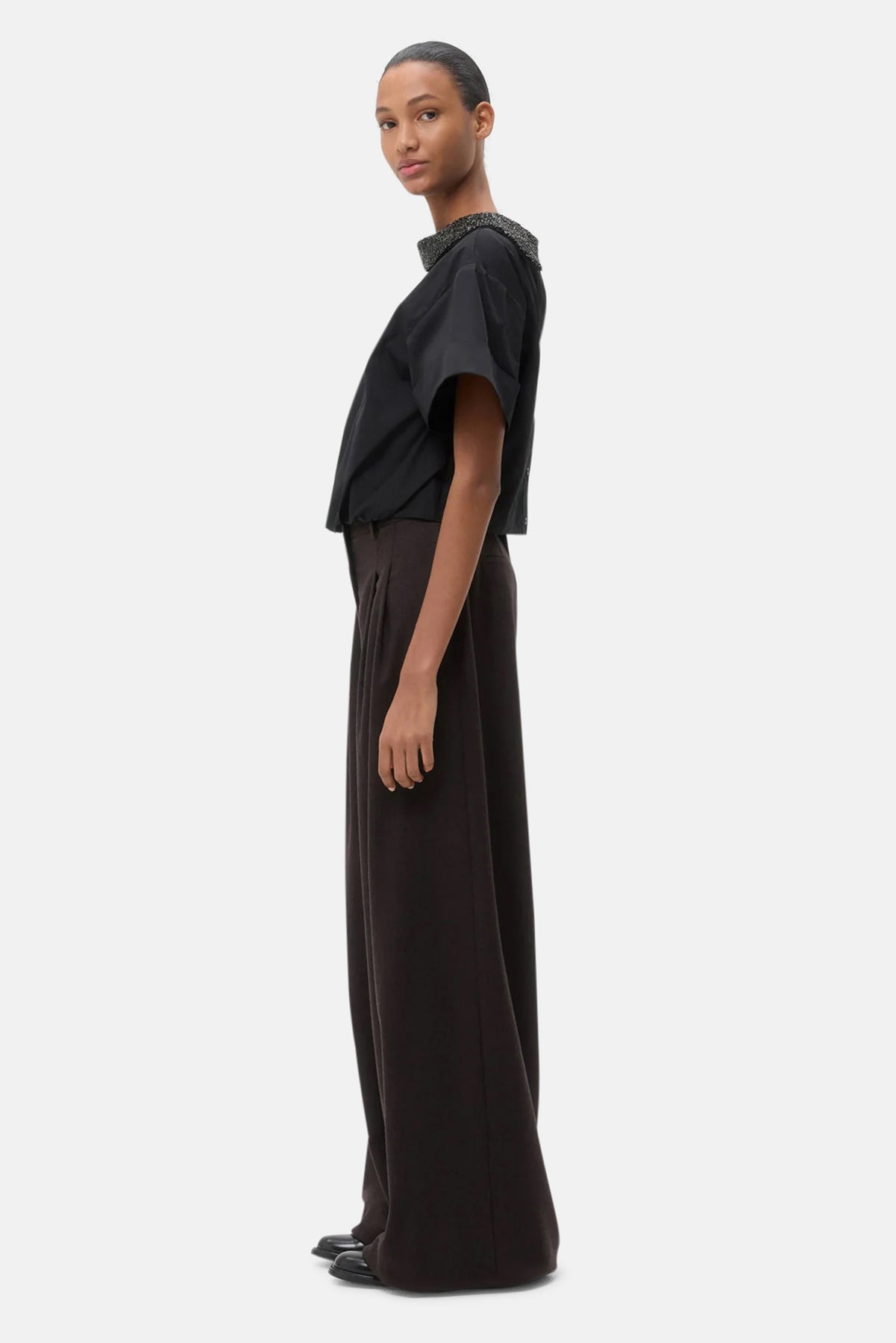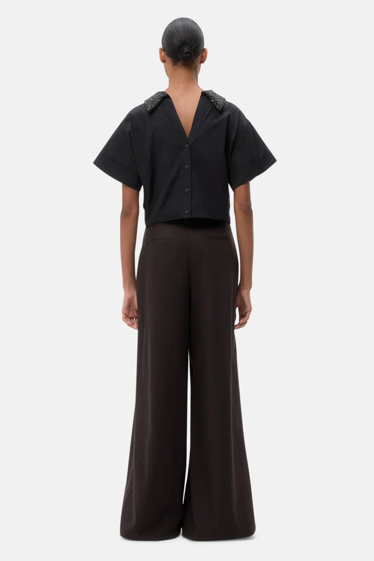 Cropped, reversible shirt in cotton poplin embellished with a sparkling prong-set crystal collar. Fabric is more structured poplin with a smooth texture and crisp hand feel. The Forever and Always shirt has a relaxed fit. Complete with a wide neckline, open back with button closure, and the option to wear cinched at the waist or loose as a cropped button-down.