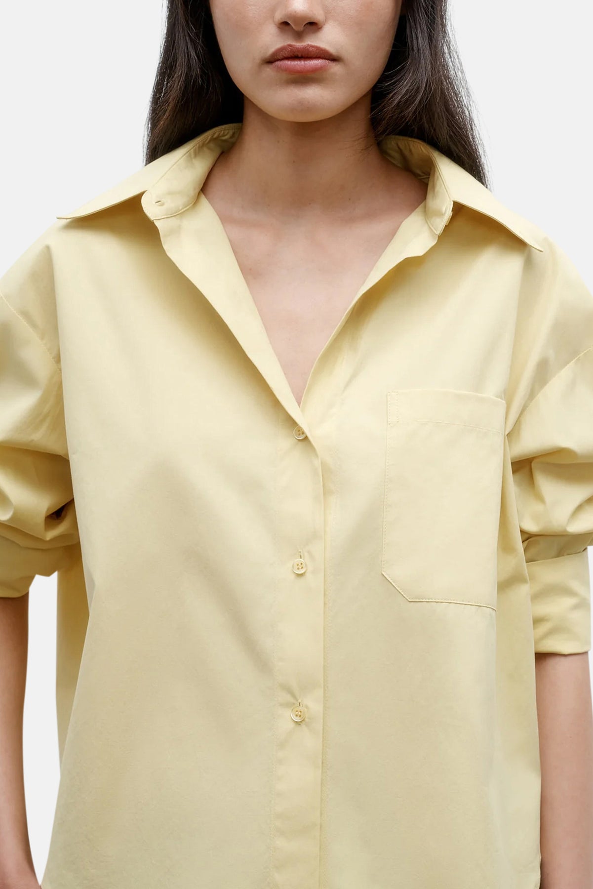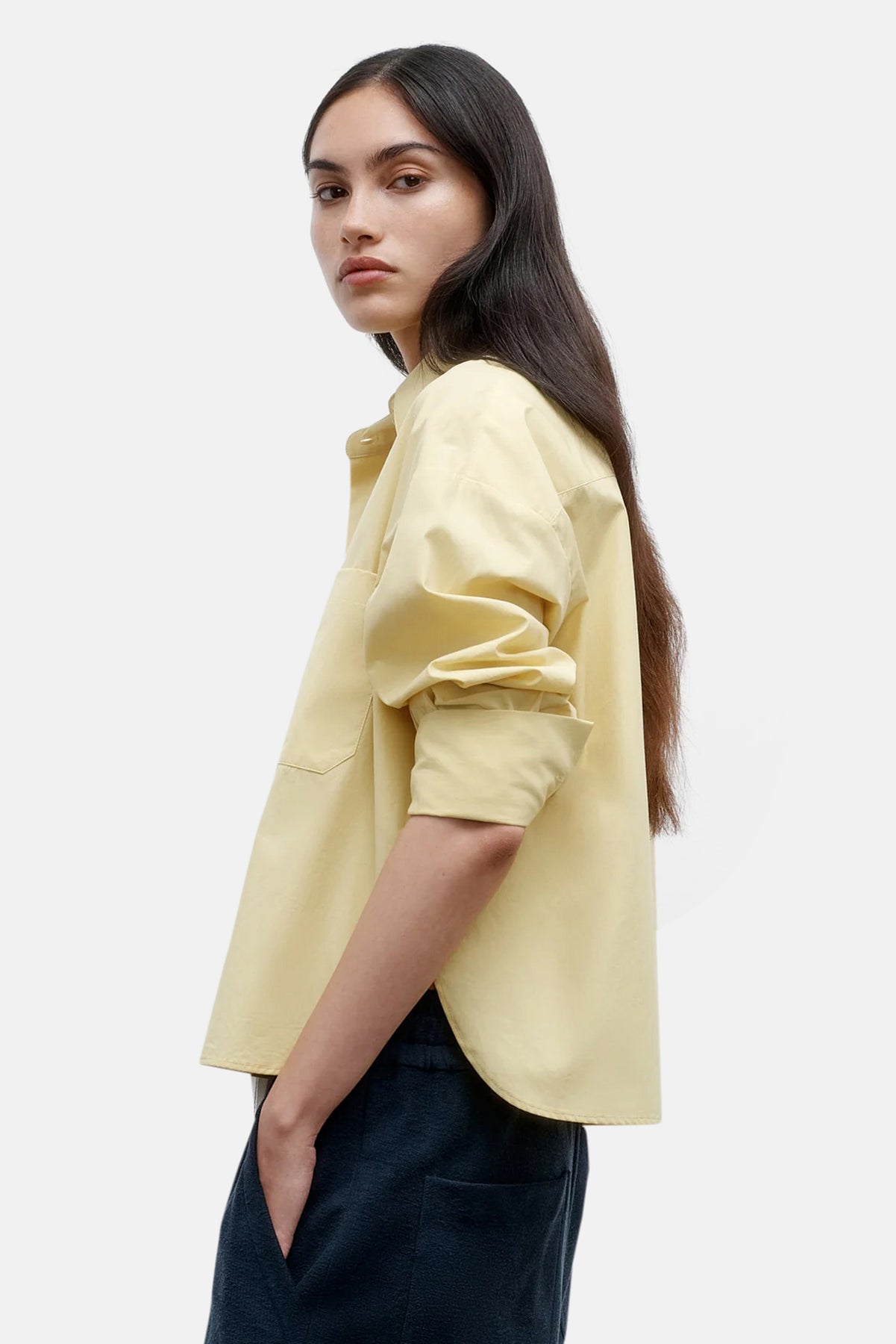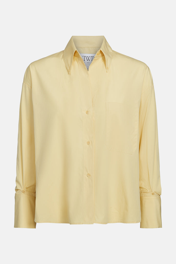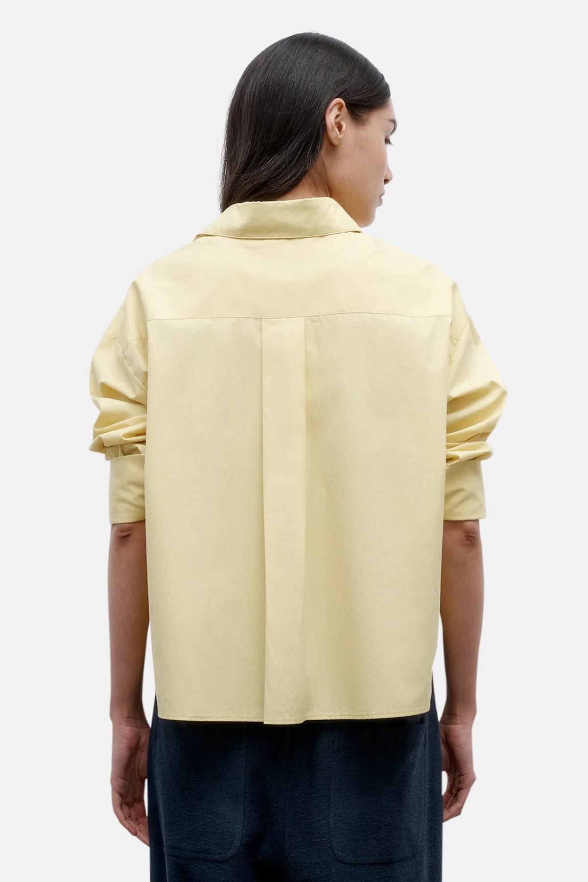 Slightly cropped long sleeved button up in soft and textured Oxford cotton, modelled after a classic men’s shirting fabric. The J.D is a boxy fit with a curved hem and box pleat at the back. Complete with a chest patch pocket, point collar and our signature single roll button cuffs. Pair with a light pant for a completed spring/summer look.