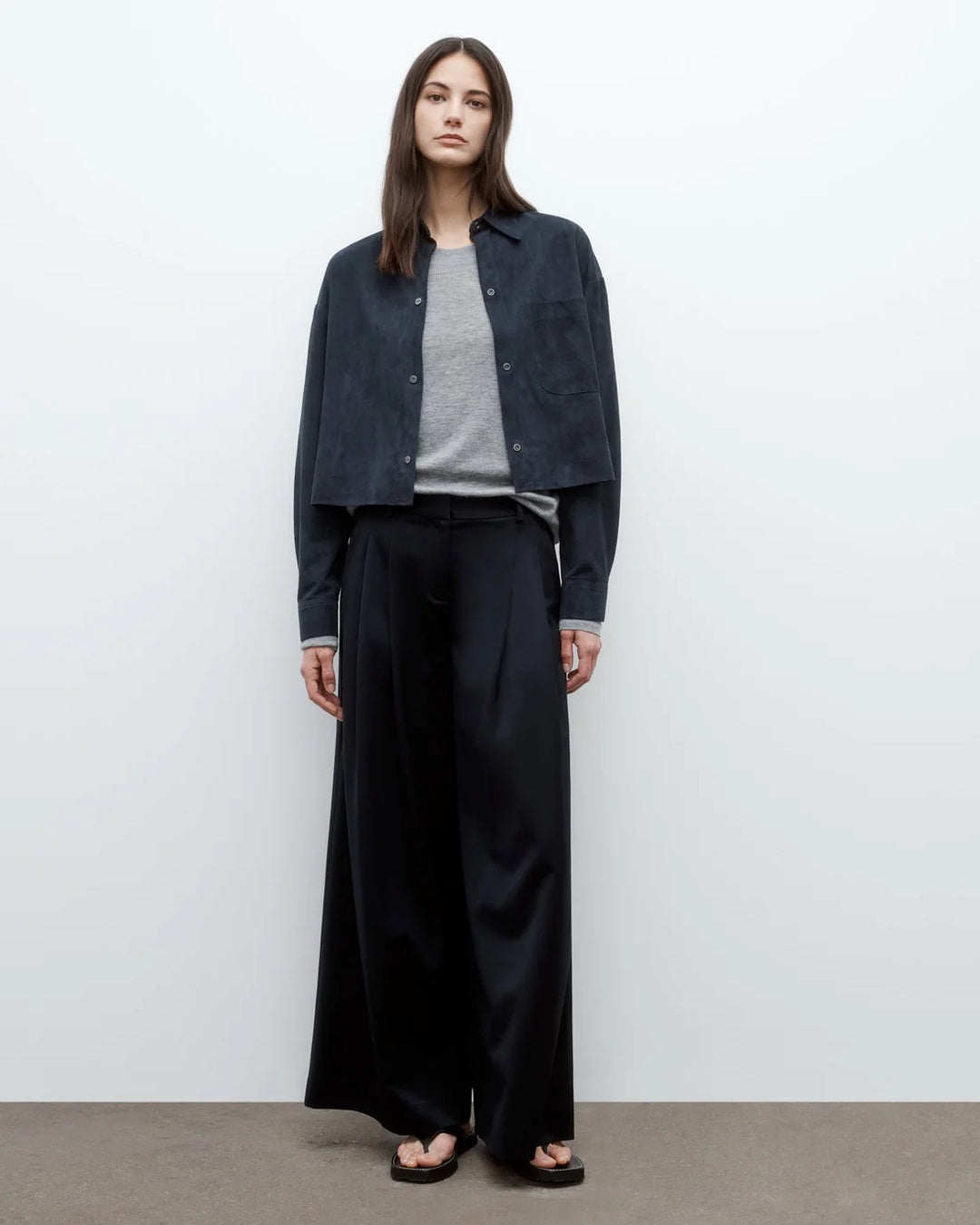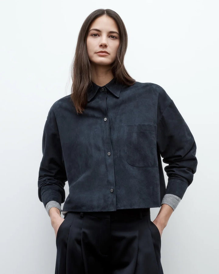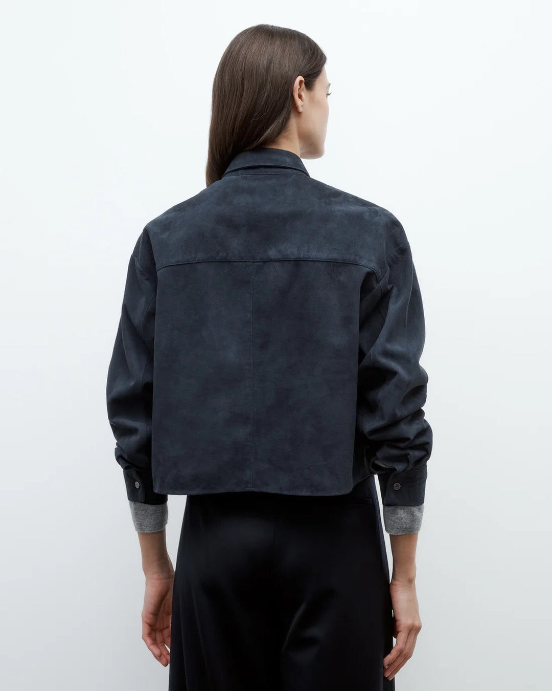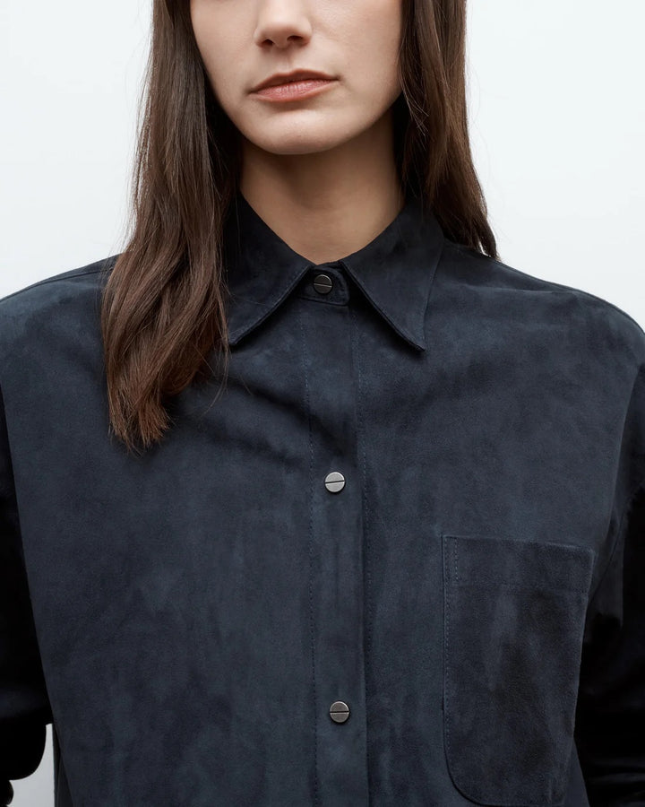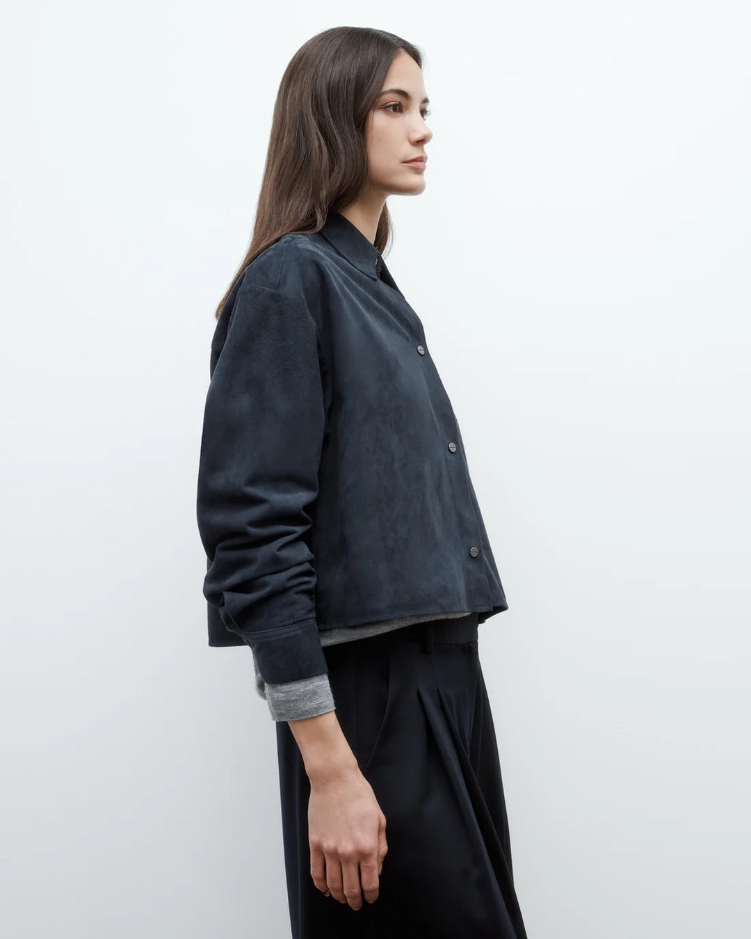 Cropped long sleeved shirt in soft, velvety lambskin suede, finished on both sides. The Little Big Joe is cut to sit just above the hips, with a center box pleat at the back. Complete with a button up placket, chest patch pocket, back yoke, and fitted, round triple button cuffs.
