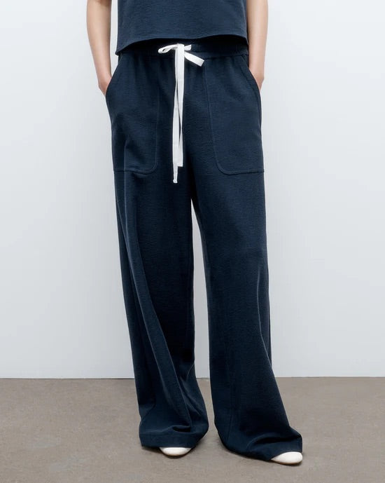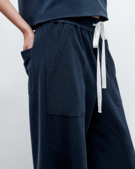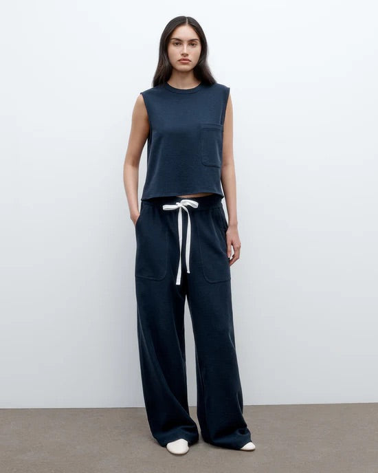 Mid-rise, pull on pants in French terry. The Main St. has a relaxed, wide leg. Complete with deep side pockets, elasticated waistband and cotton drawstring.
