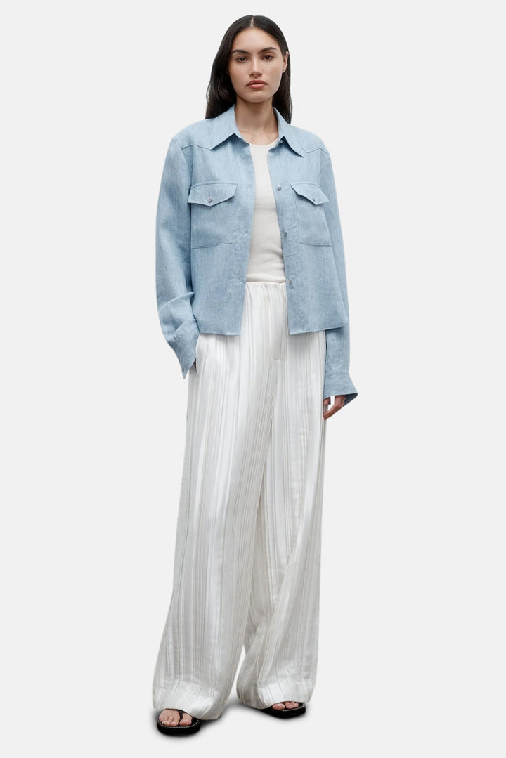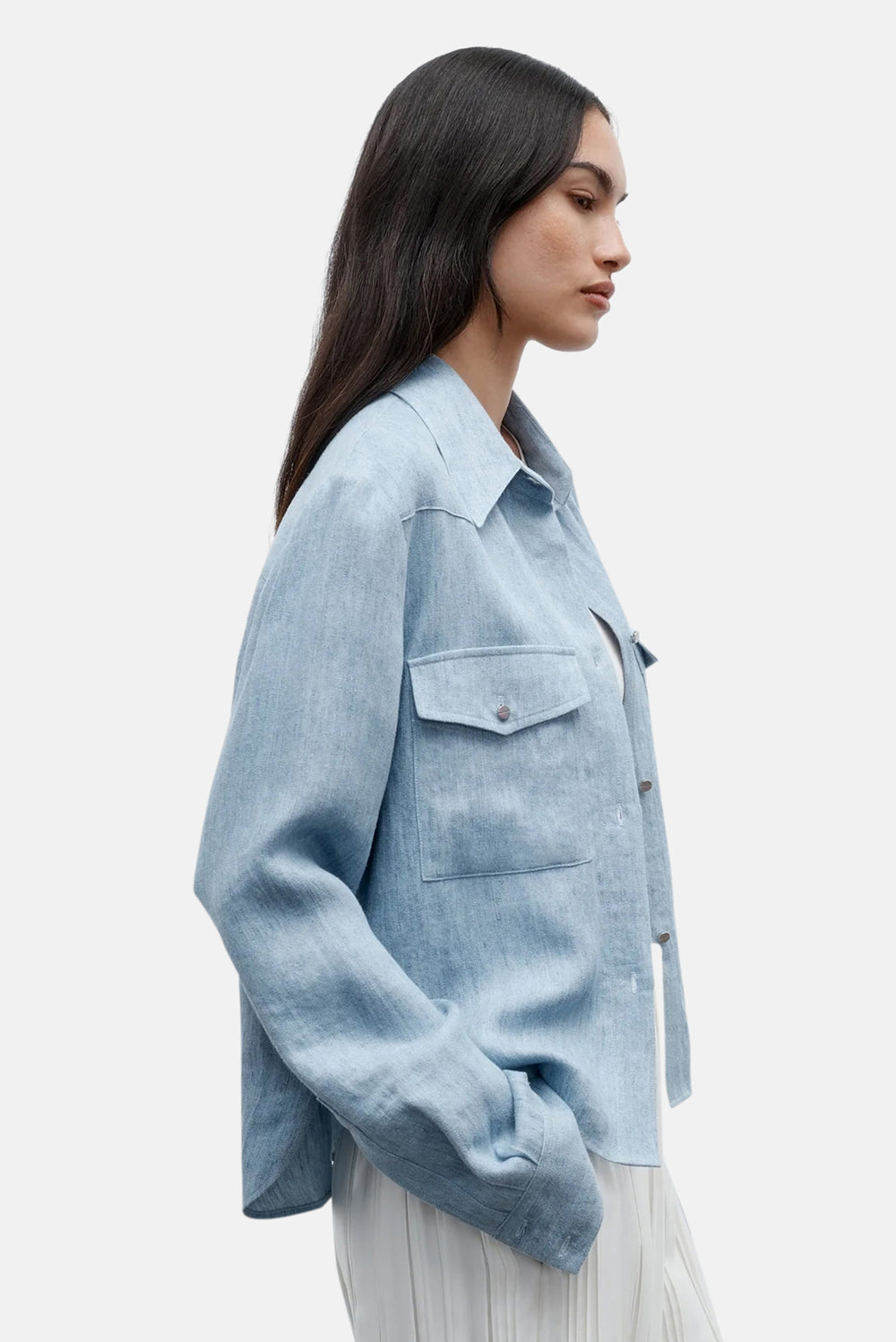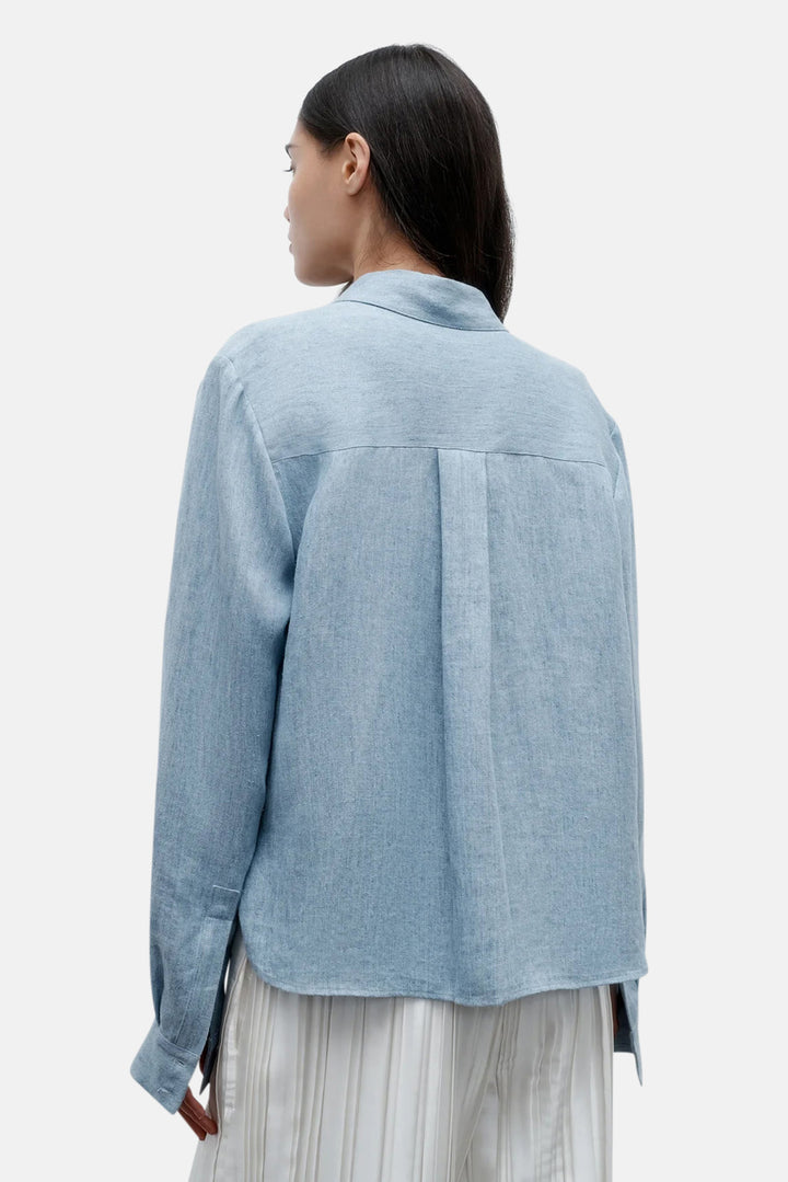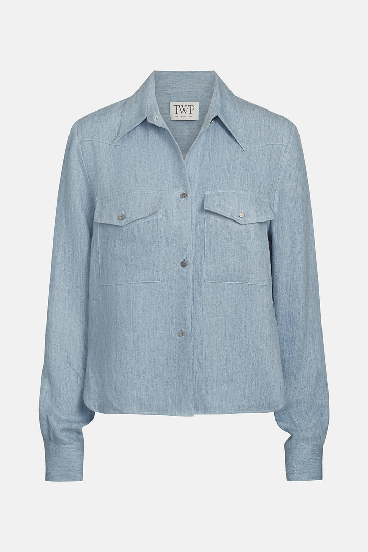 Cropped button up work shirt in light indigo. The New Carter is a boxy fit. Complete with a button up placket, chest flap pockets, exposed yoke and button cuffs.
