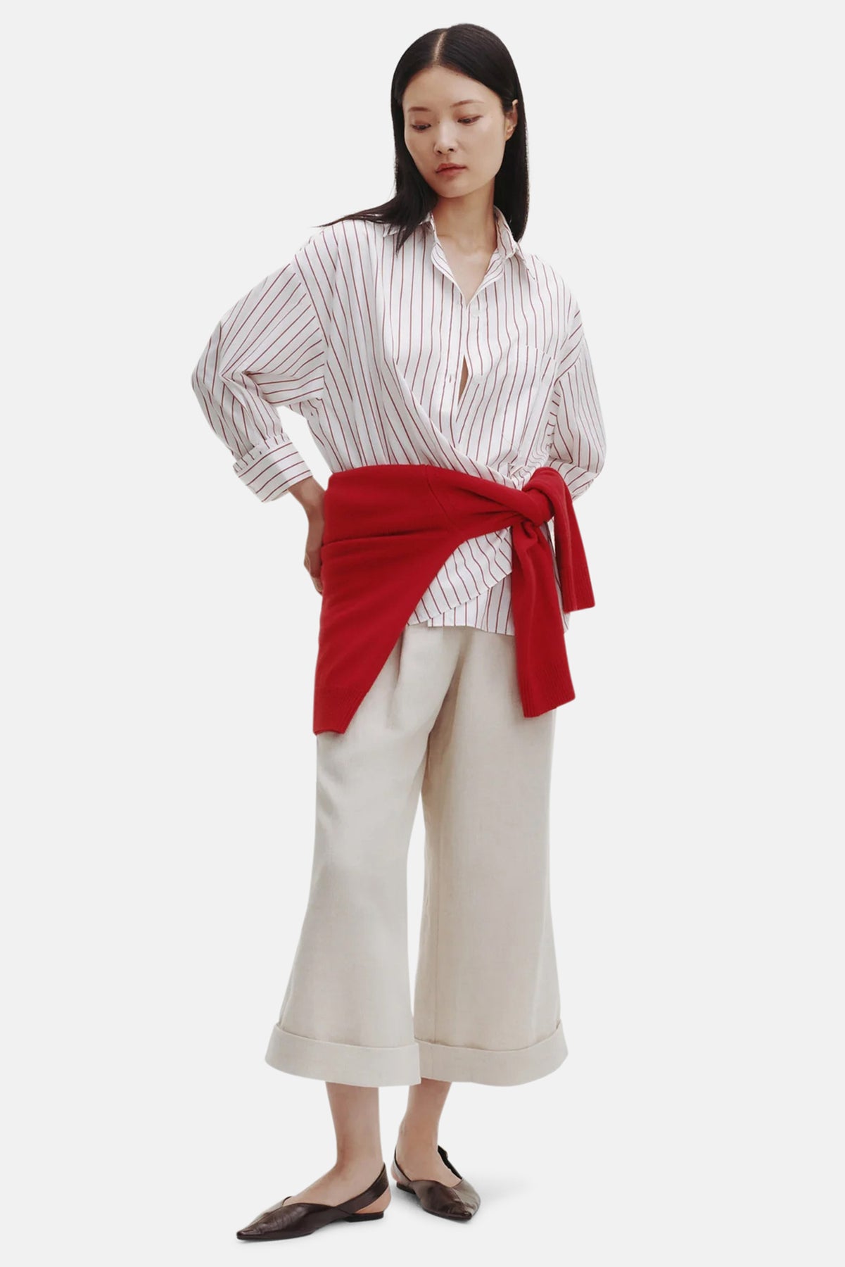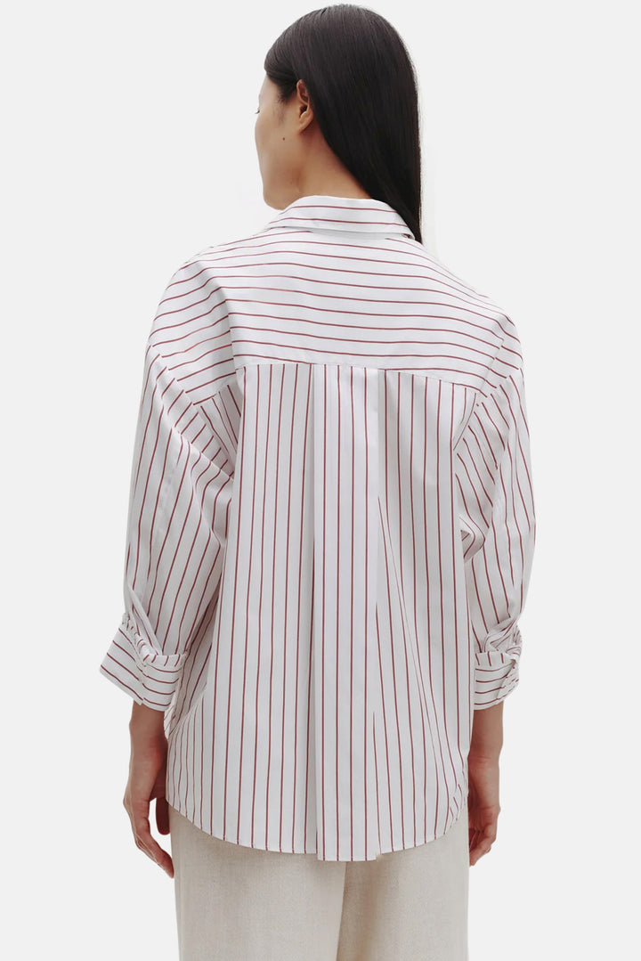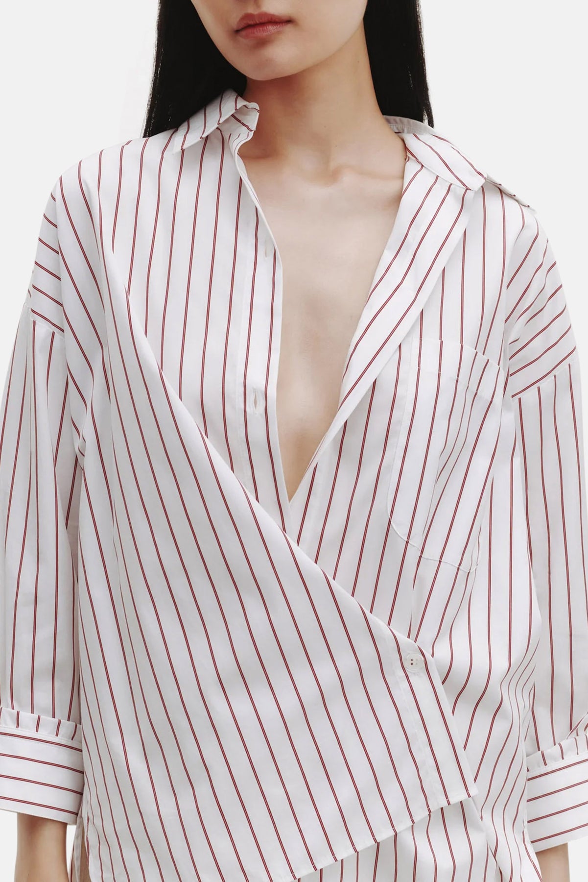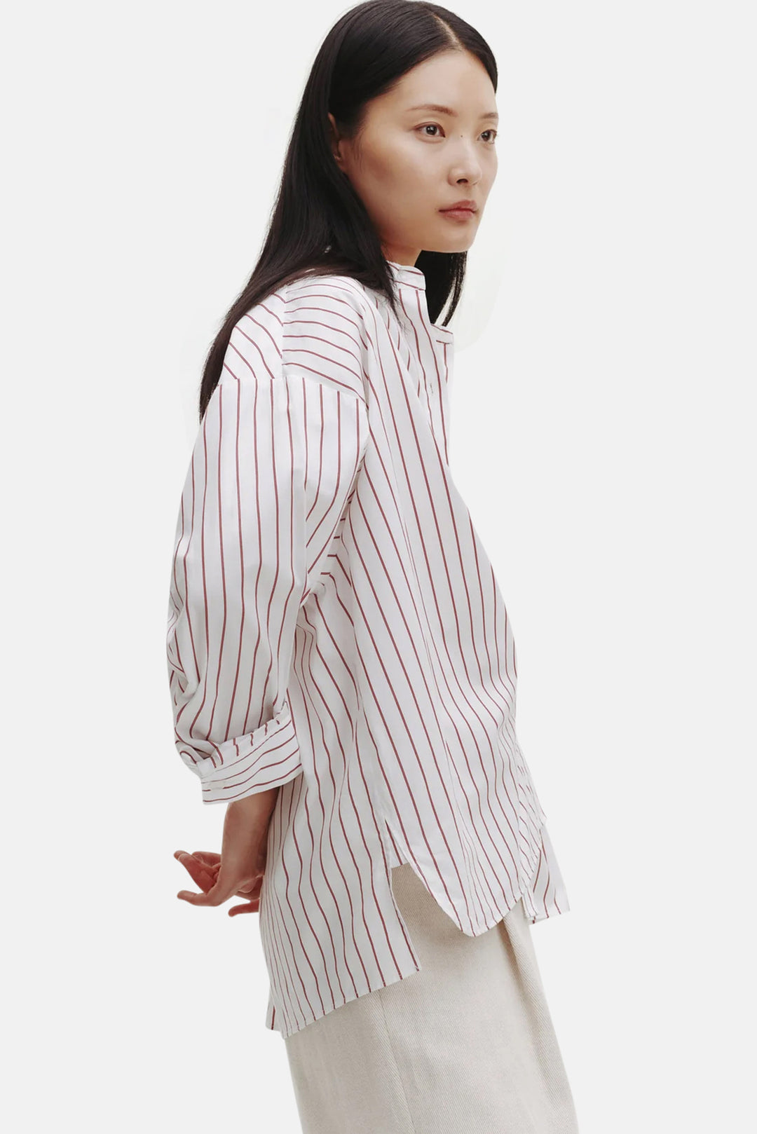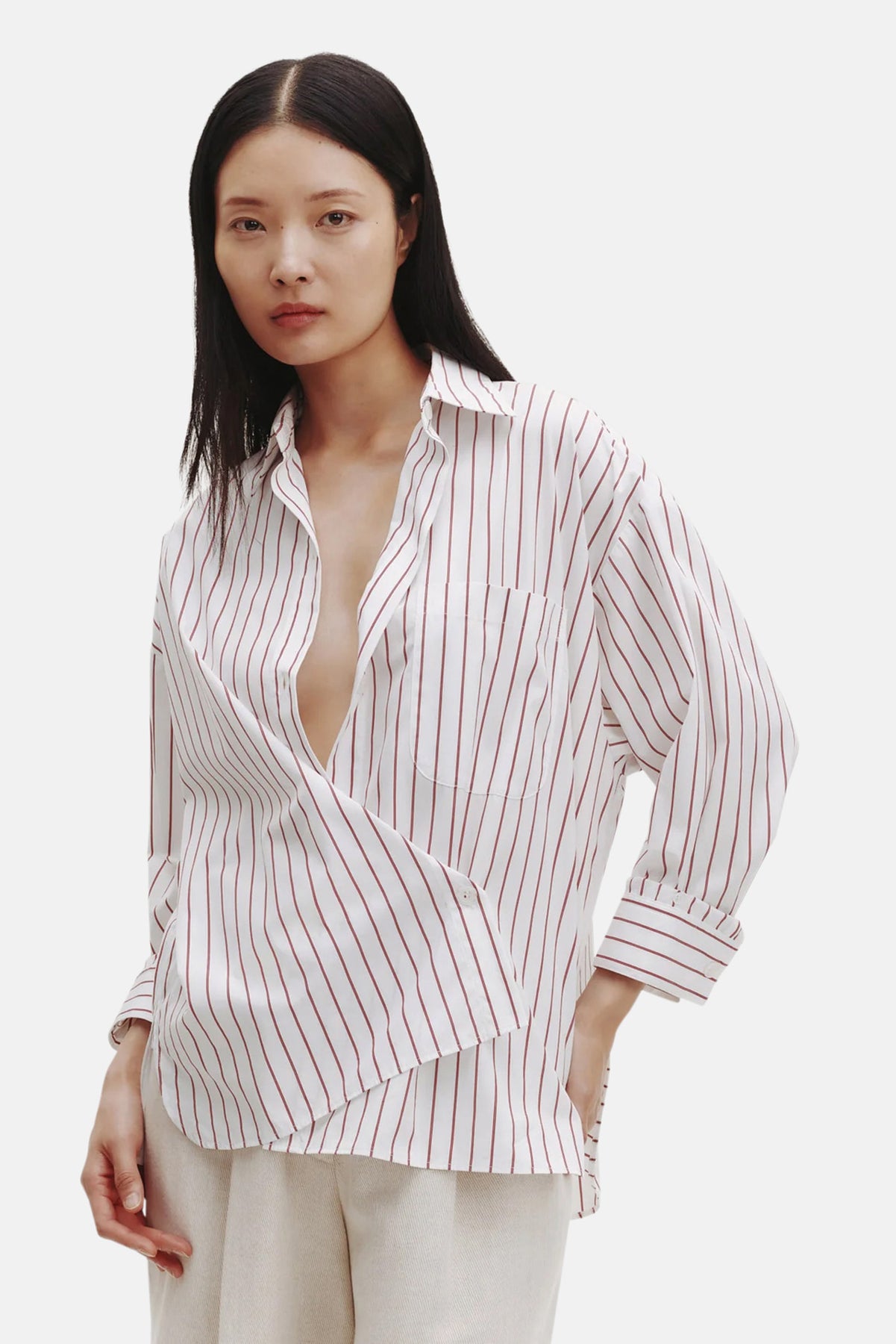 TWP oversized button down in striped italian cotton shirting. The Earl is a relaxed, oversized shirt with an asymmetric button front. Complete with a spread collar, chest patch pocket and our staple single rolled button cuffs. Pair with the Almost Famous Pant for a clean spring/summer look.
