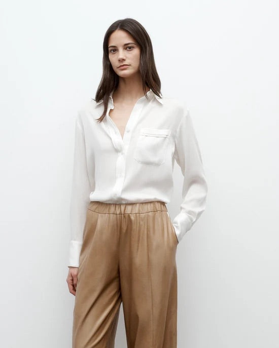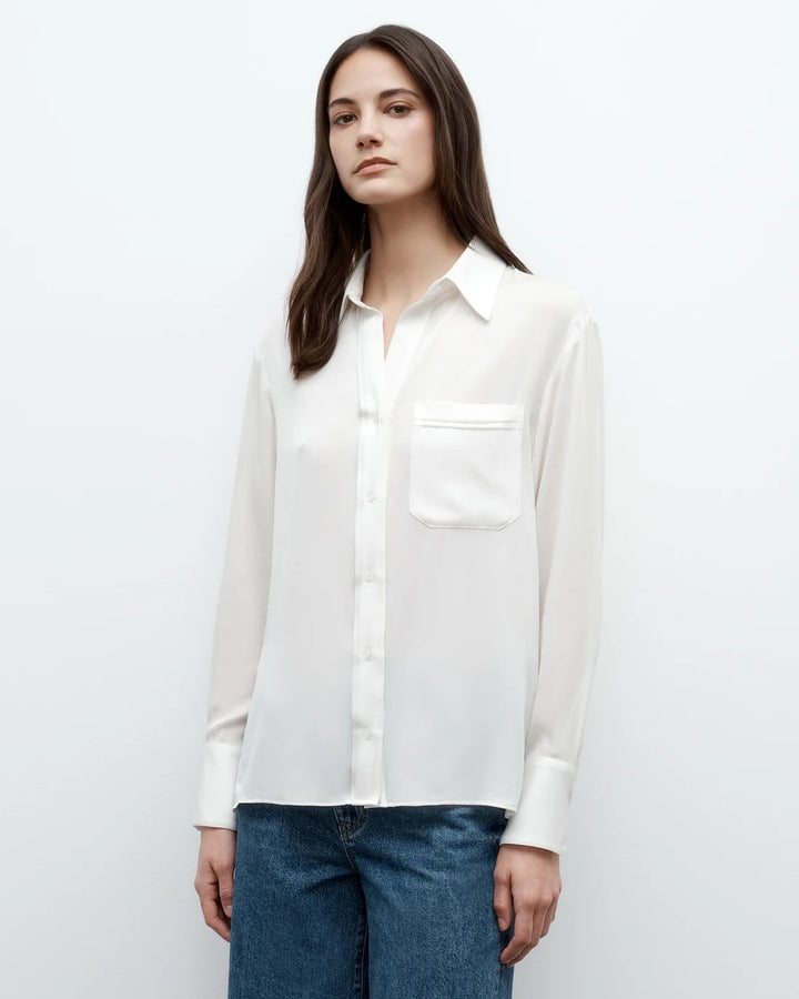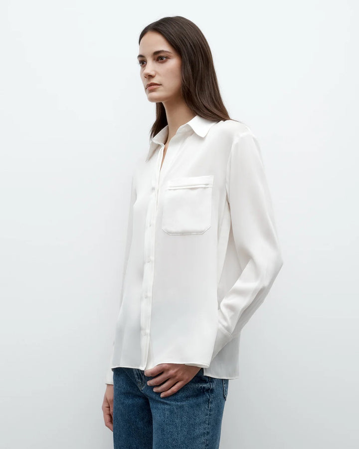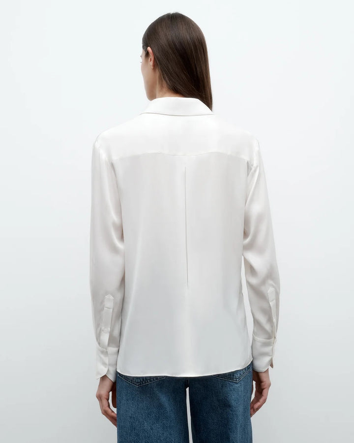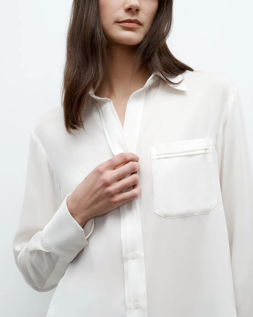 Button down shirt draped in semi-sheer silk georgette. The Joey is a classic fit with an inverted box pleat at the back and raw shirttail hem. Complete with an exposed placket, chest patch pocket, spread collar, and round cuffs.