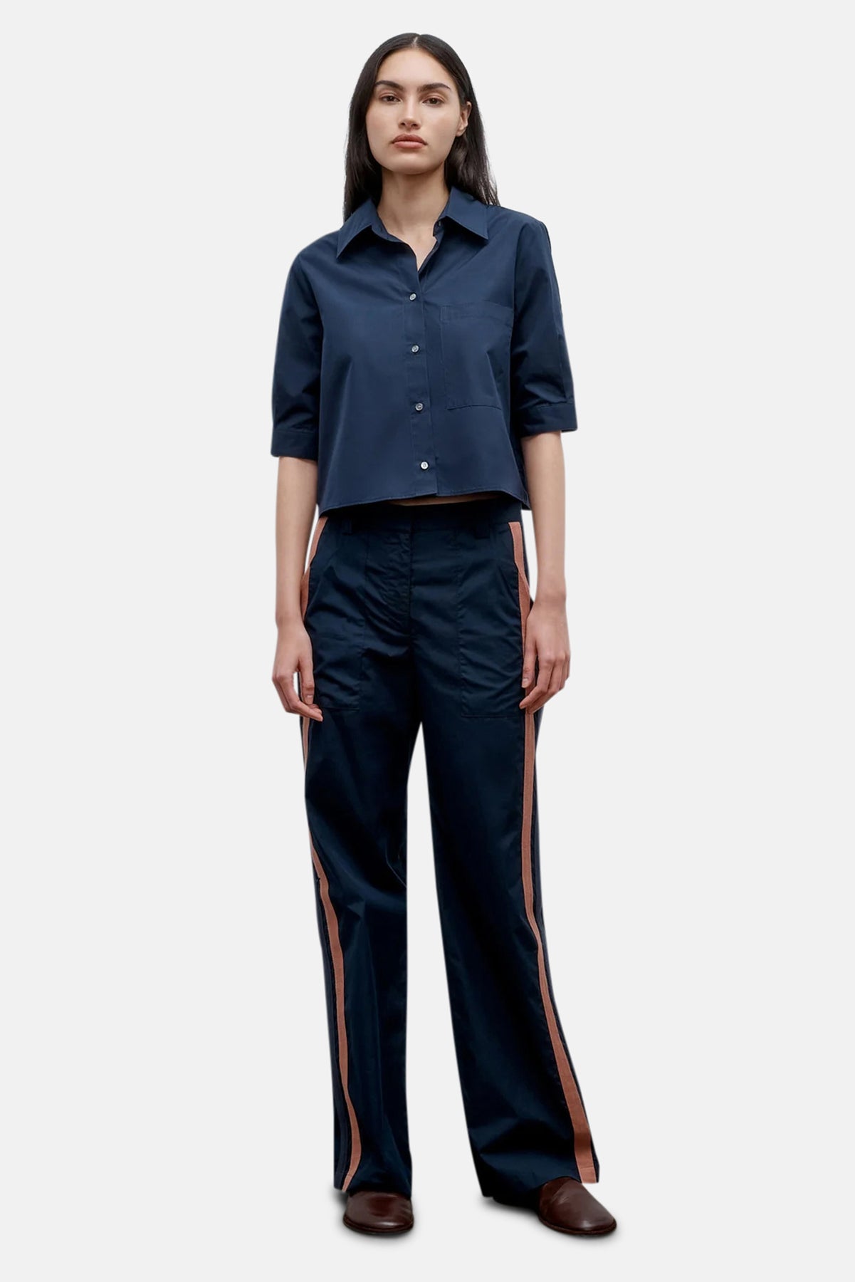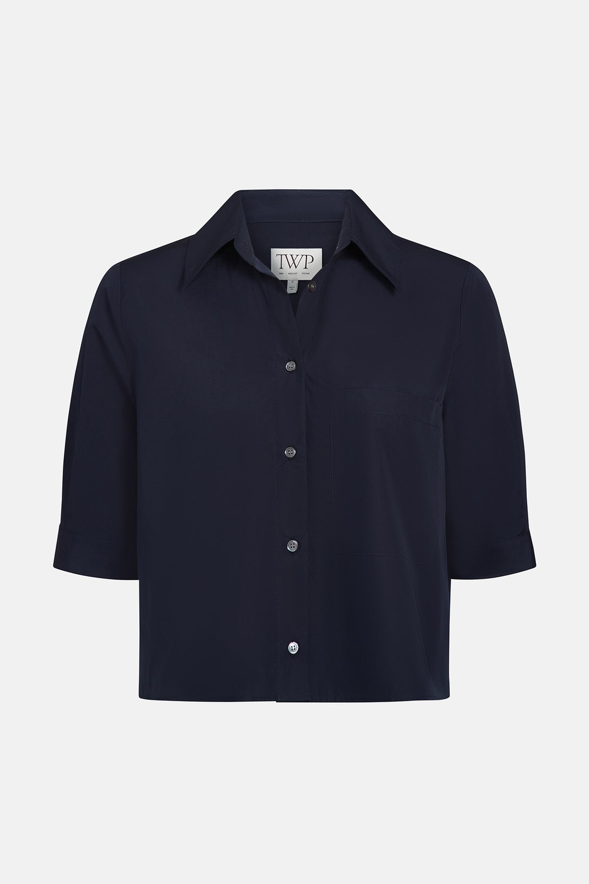 Cropped, half sleeve button down shirt in cotton poplin.This fabric is lightweight with a smooth texture and crisp hand feel. Short Lived is a boxy fit. Complete with a chest patch pocket, exposed placket, pleats at the sleeves and french cuffs.