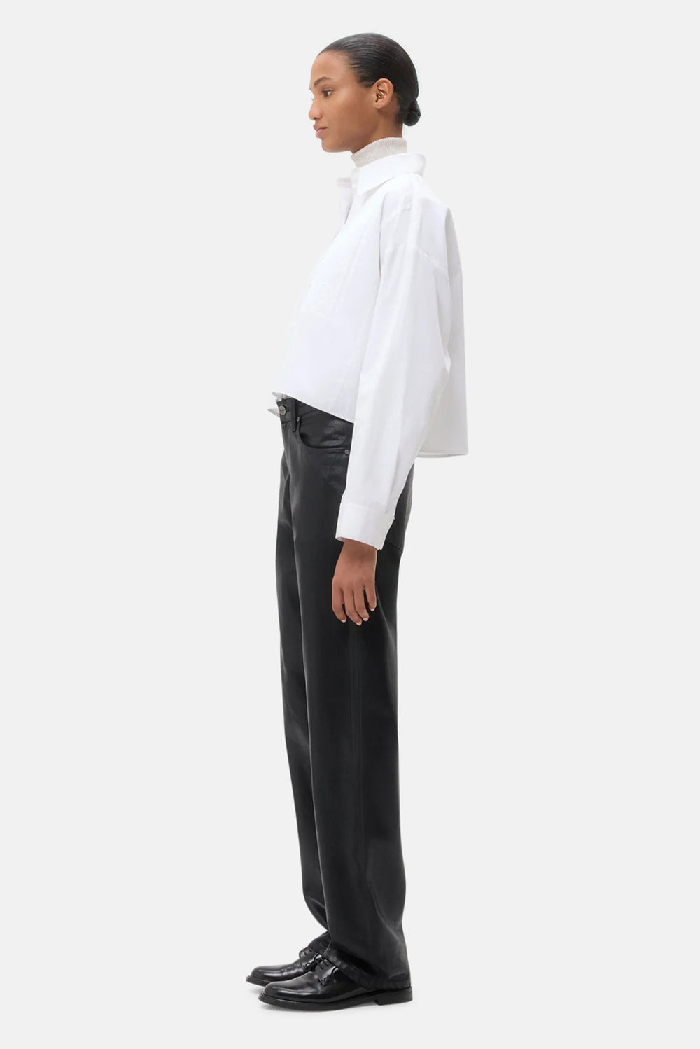 Cropped long-sleeve button-down in cotton poplin. The Soon To Be Ex features a boxy silhouette with a tuxedo-style bib. Complete with an exposed button-up placket, chest patch pocket, and single-pick up button cuffs.