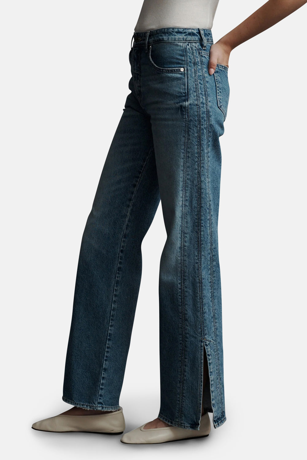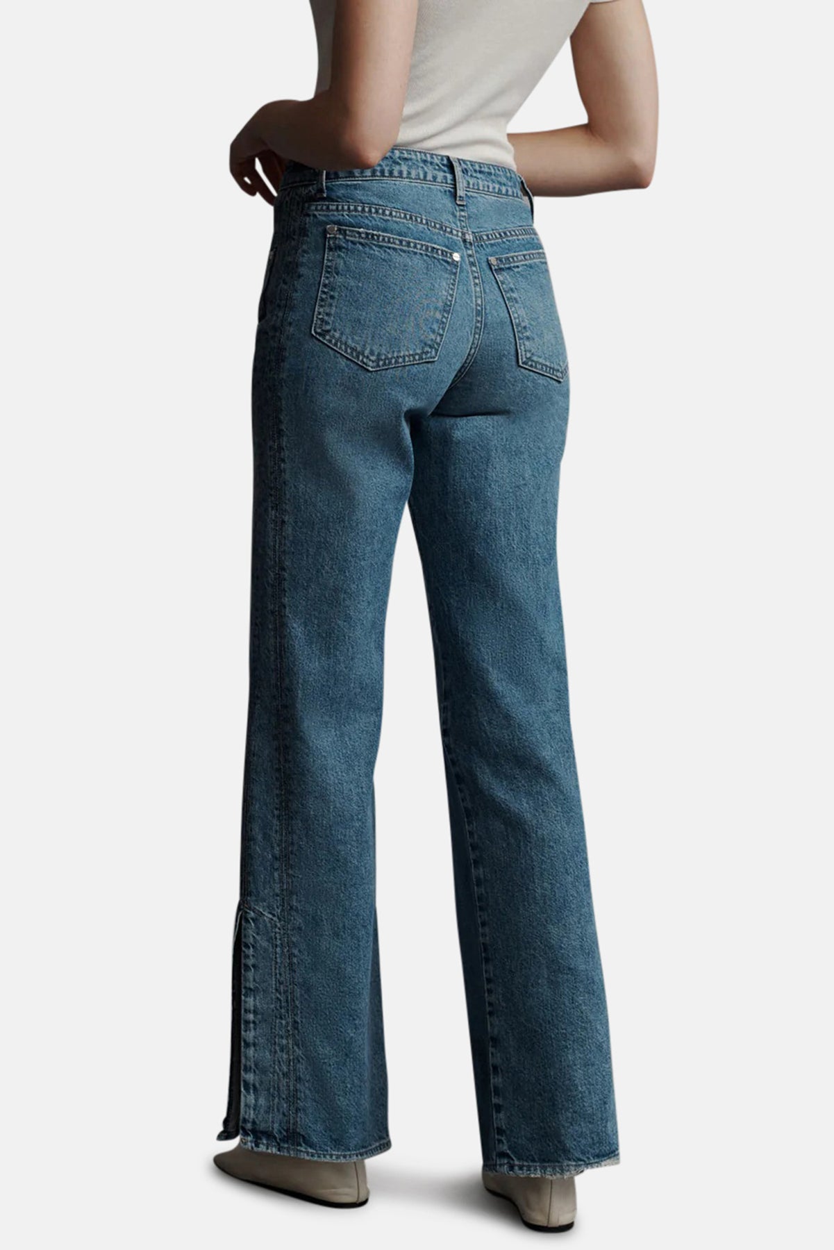 Mid-rise bootcut jeans in true blue vintage washed denim, manufactured in LA. This jean is fitted at the hip with a straight leg, three side seams, and side slits at the hem. Complete with a five pocket style, a zip-fly, and metal shank at the waistband. If between sizes, we recommend sizing up.