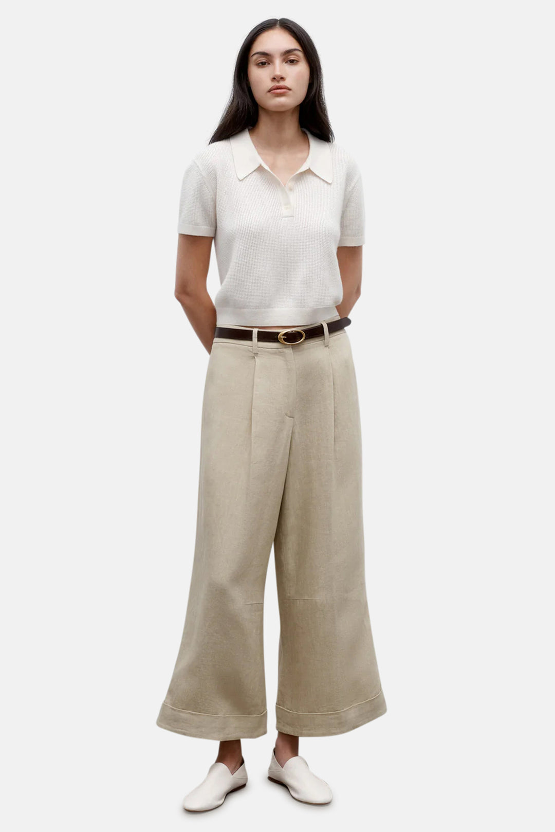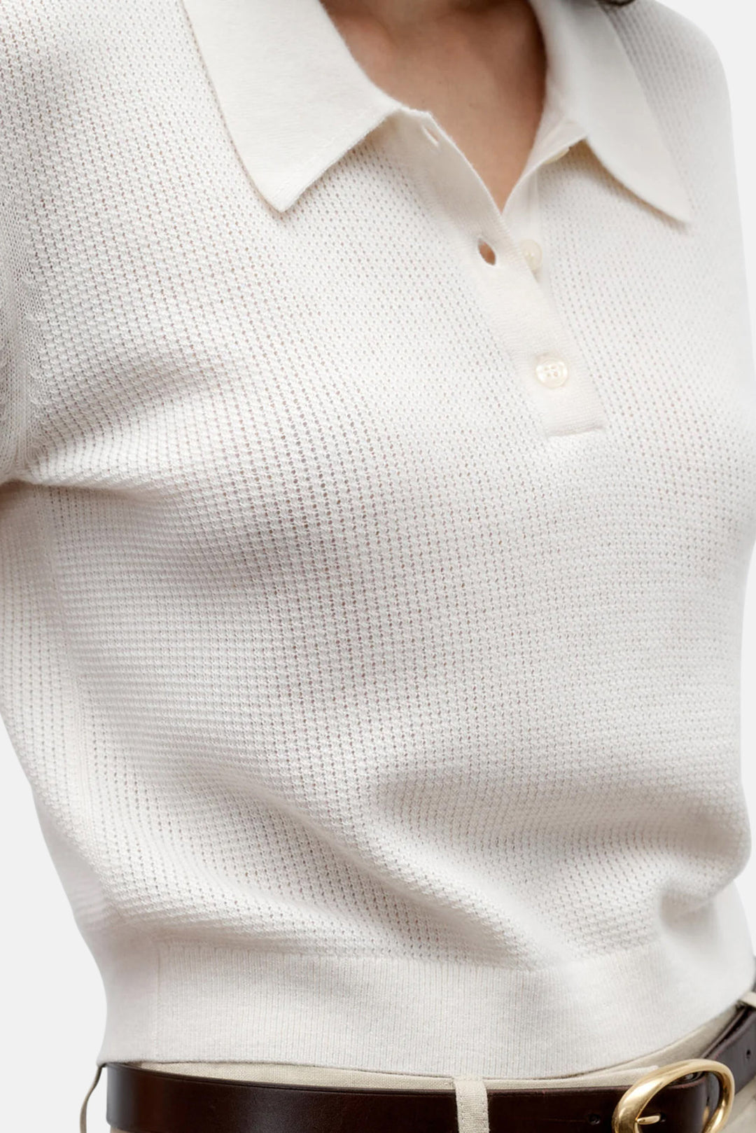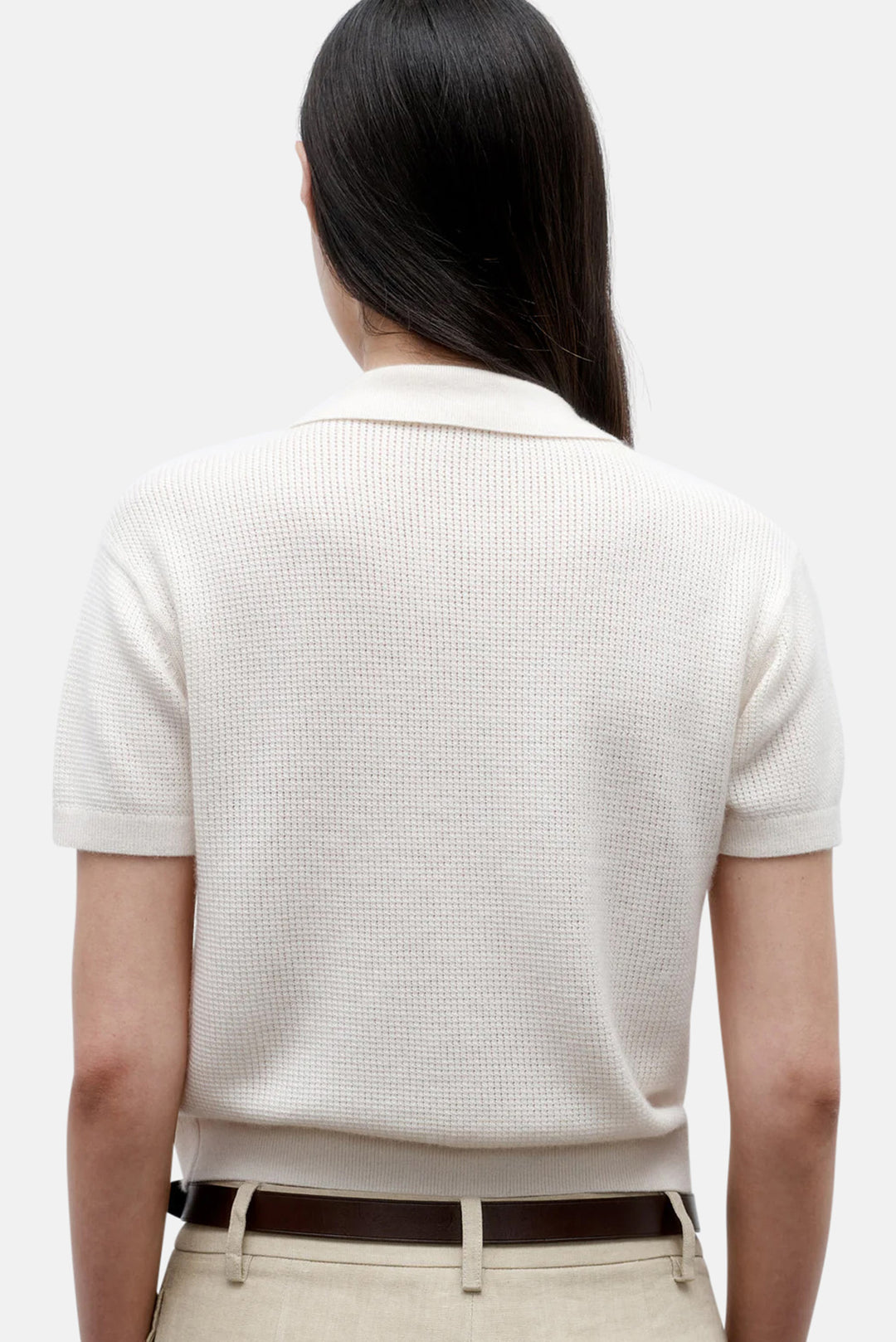 Cropped short sleeved polo shirt in superfine lightweight cashmere. The Thermal Polo has a waffle knit stitch. Complete with a collar, quarter placket and ribbed finish at the cuffs and hem.