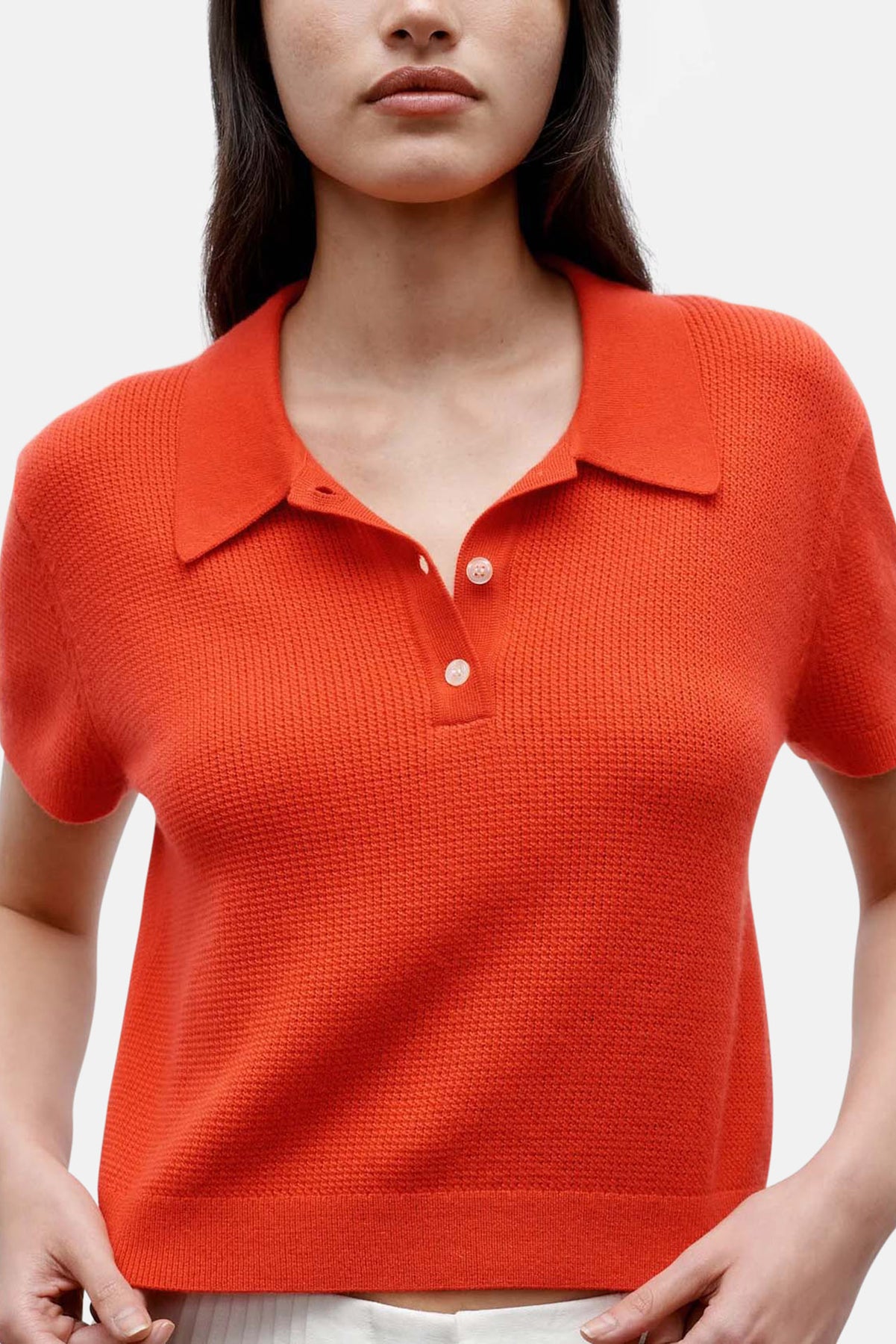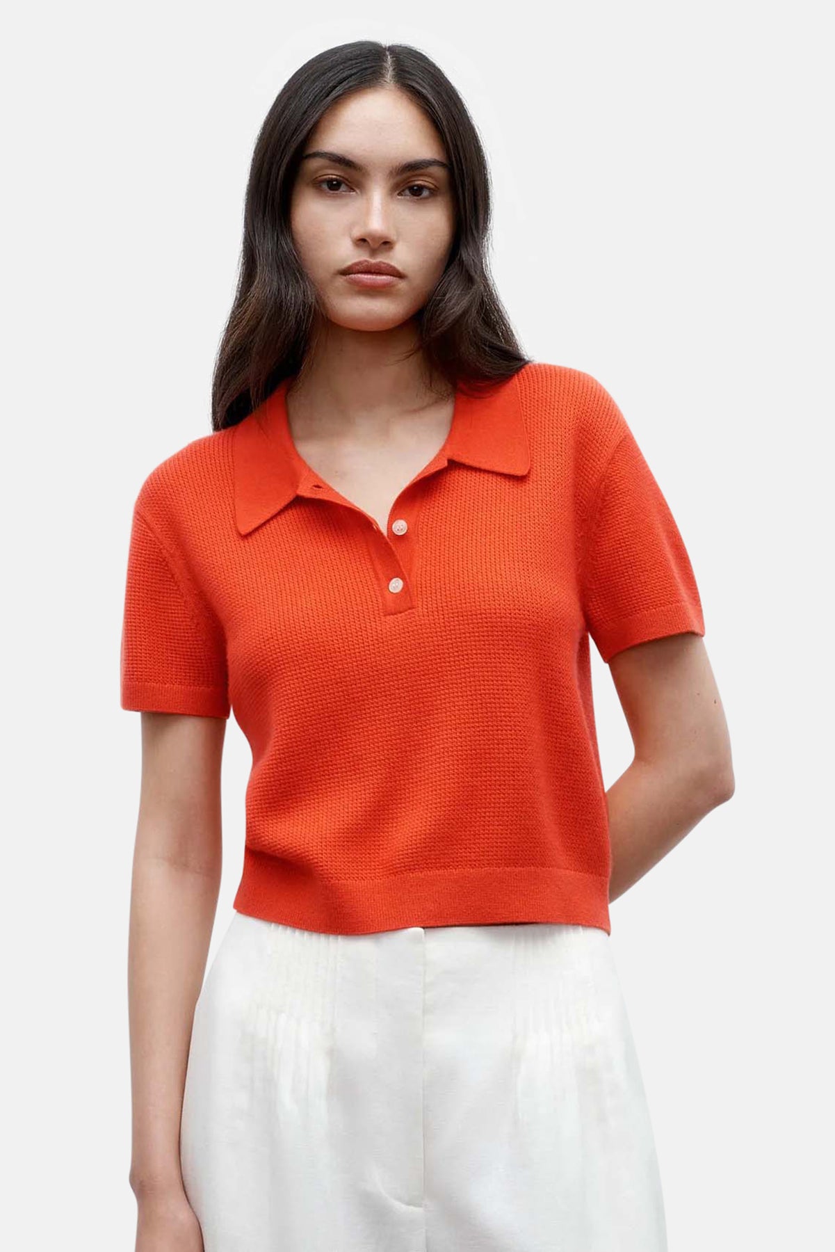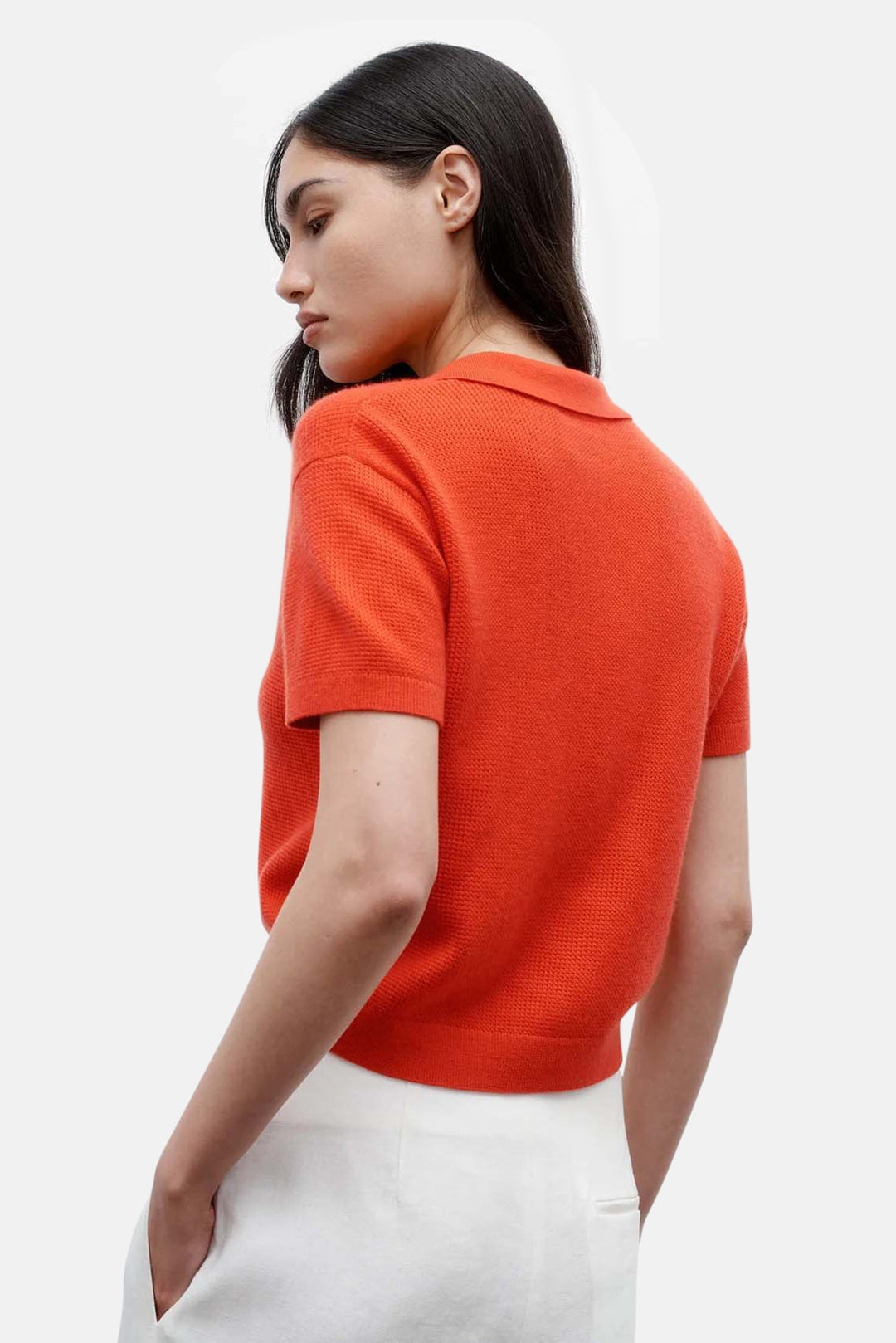 Cropped short sleeved polo shirt in superfine lightweight cashmere. The Thermal Polo has a waffle knit stitch. Complete with a collar, quarter placket and ribbed finish at the cuffs and hem.