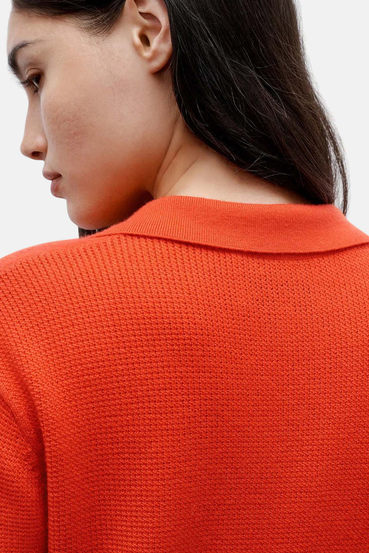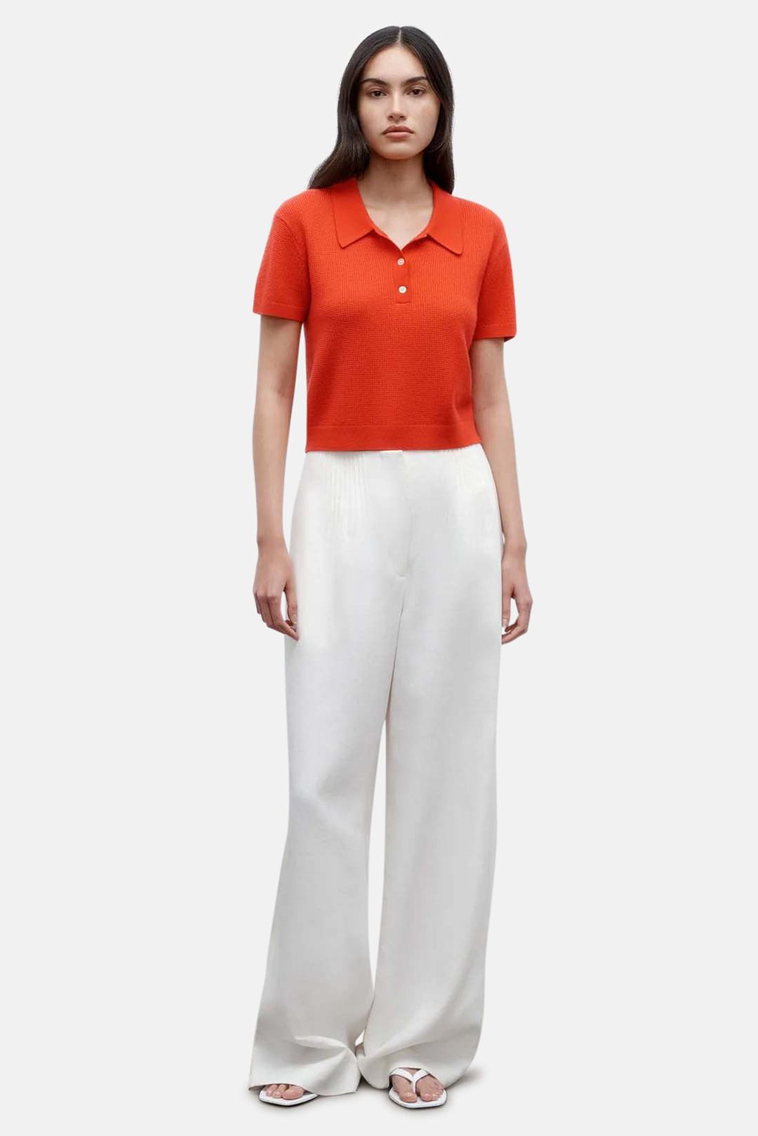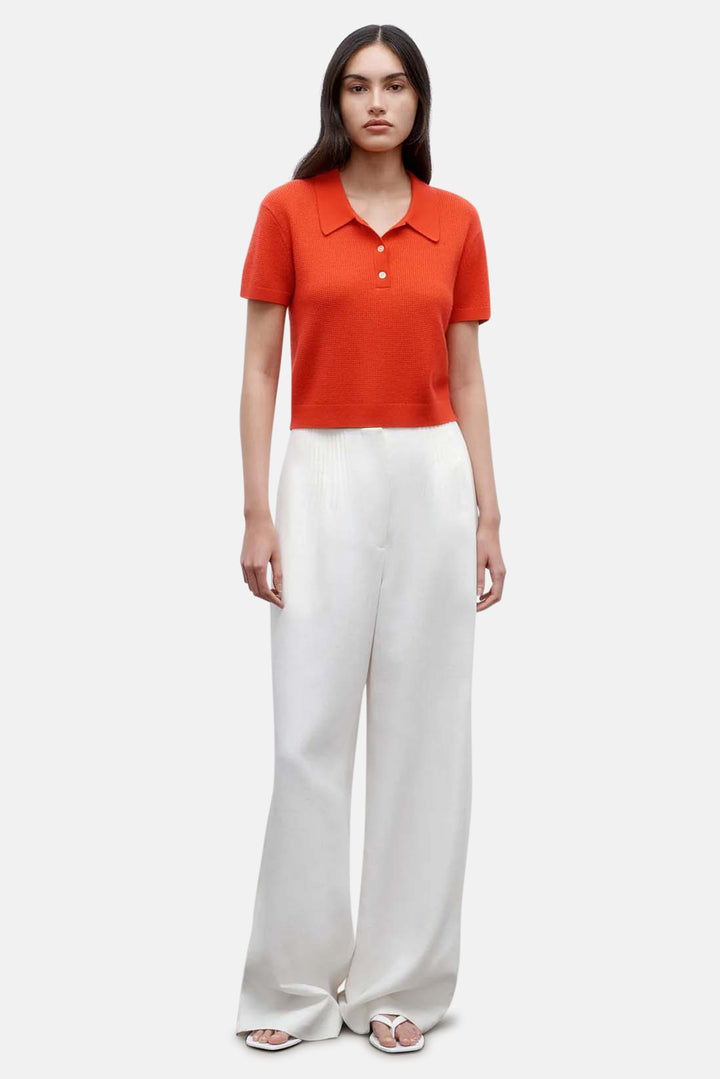 Cropped short sleeved polo shirt in superfine lightweight cashmere. The Thermal Polo has a waffle knit stitch. Complete with a collar, quarter placket and ribbed finish at the cuffs and hem.