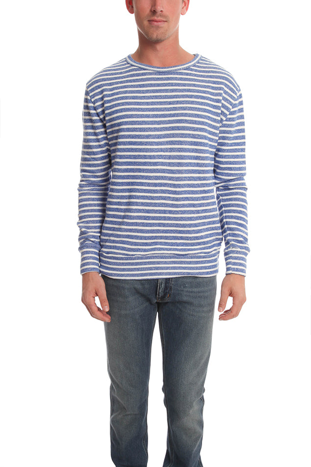 A soft long sleeve lightweight crewneck "sweatshirt" in blue and white, worn right to the body for luxe layering. This fabrication is super soft and comfortable.
