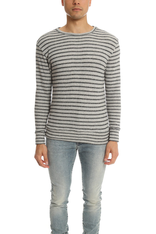Striped and heathered crewneck with cozy french terry composition. Rib knit collar and cuffs.