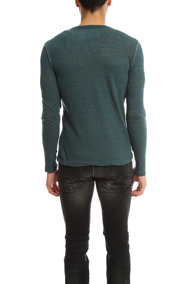 Unique air-knit style fabric with a little give but still styled for close to the body wear. Slight slit for exposing and giving some room at the neck making this a stylish alternative to a deep statement V neck.